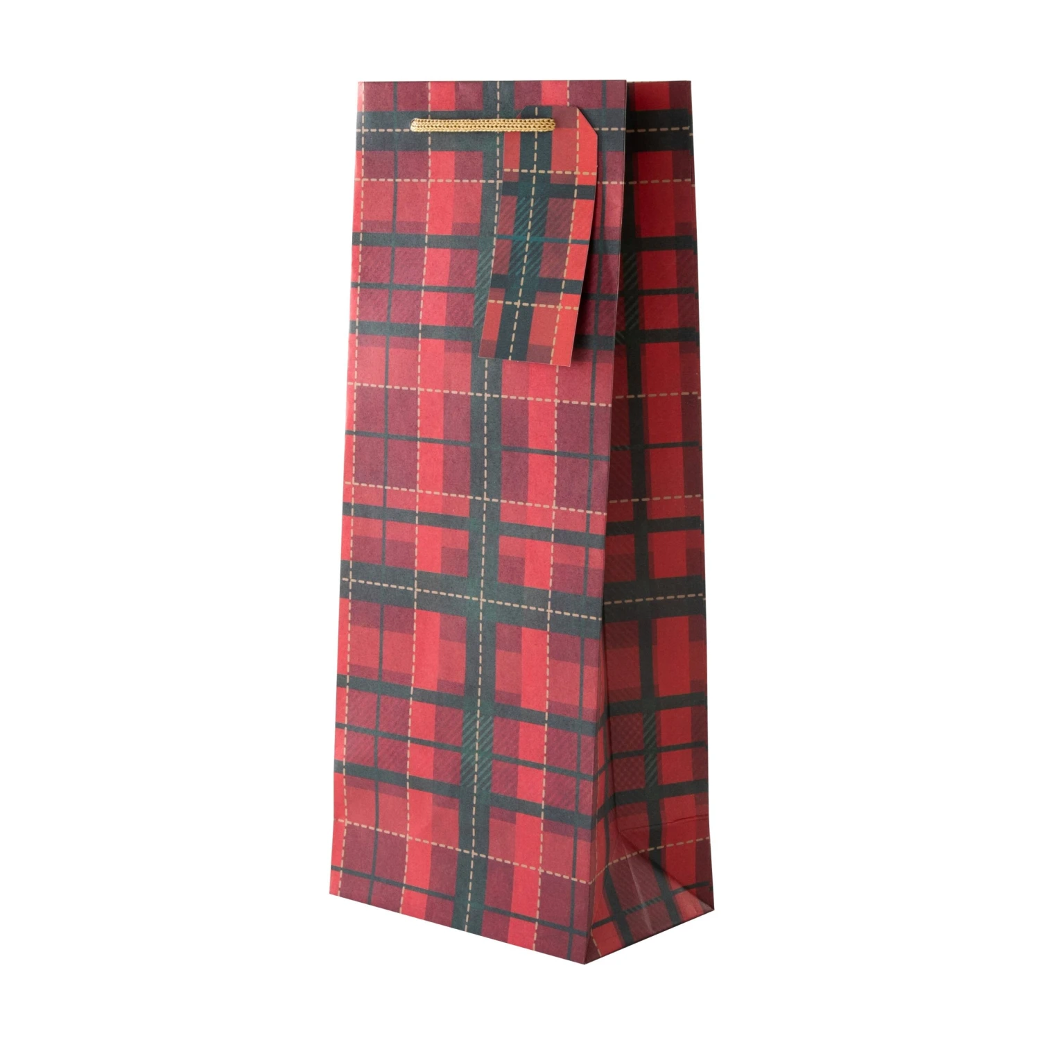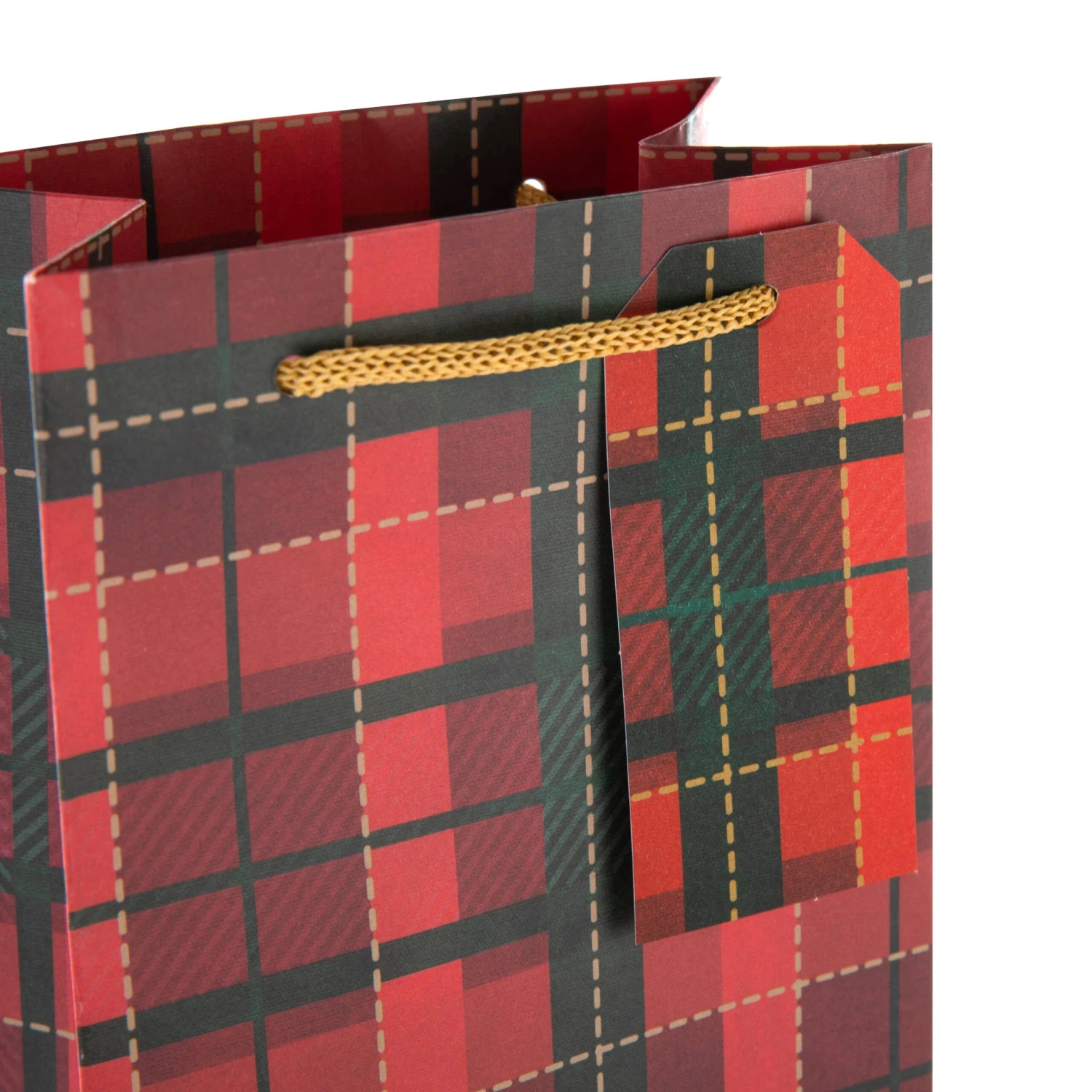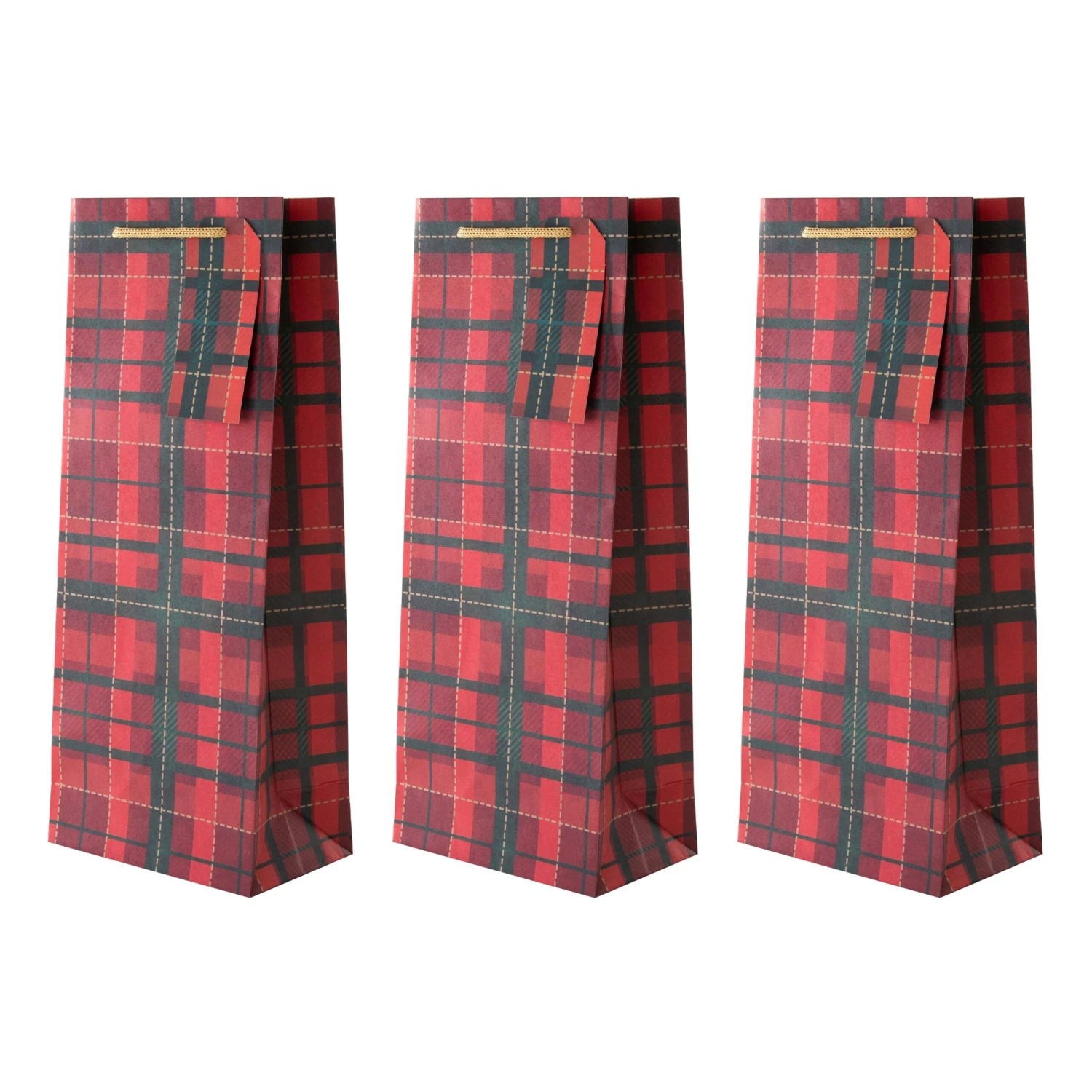 All bags feature a die cut shape and die cut gift tags, with a tartan design and gold knitted paper cord handles.