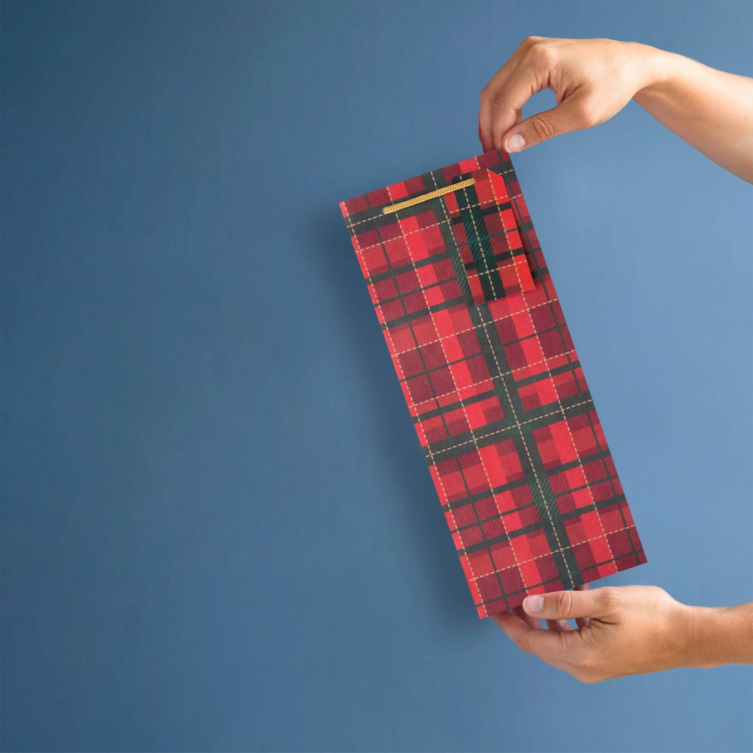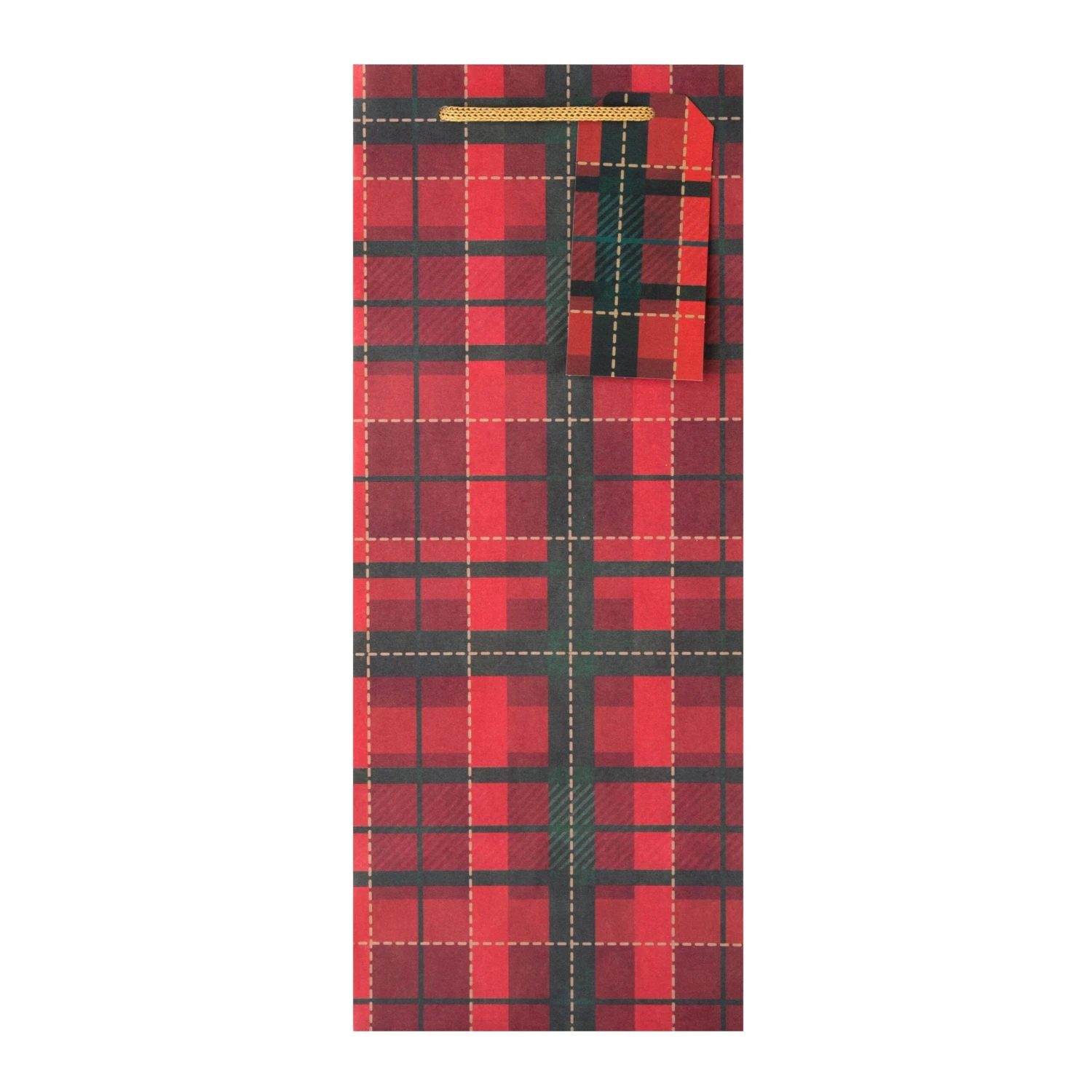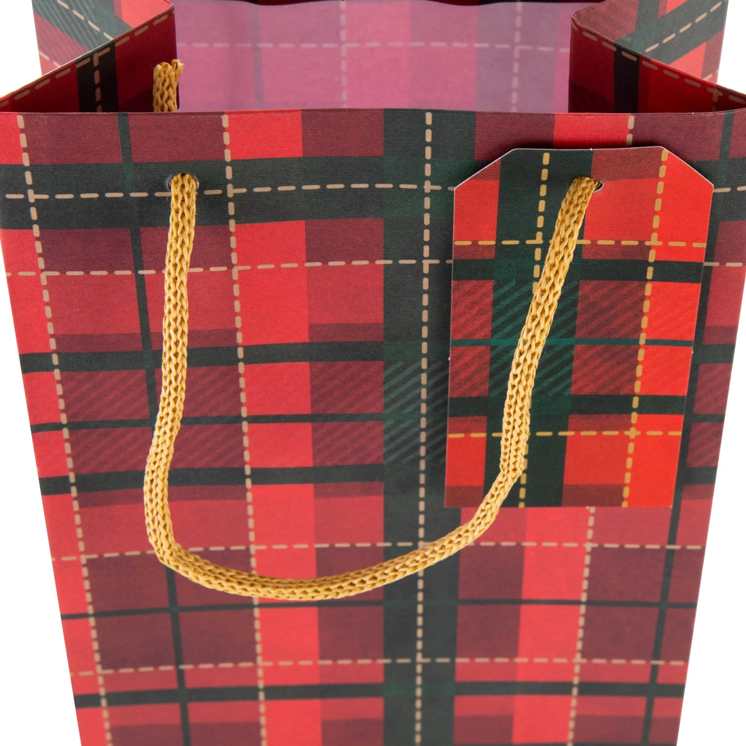 All bags feature a die cut shape and die cut gift tags, with a tartan design and gold knitted paper cord handles.