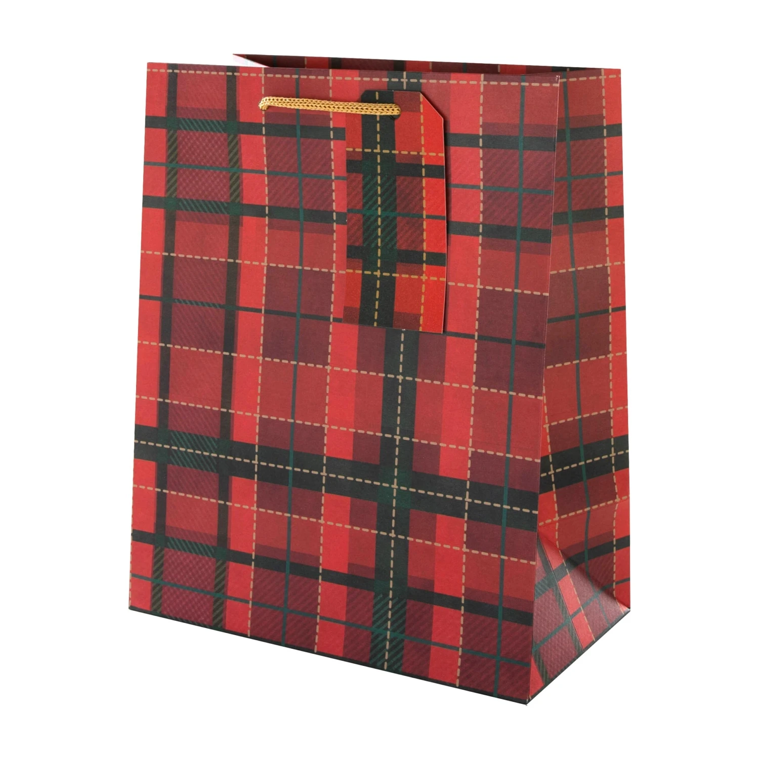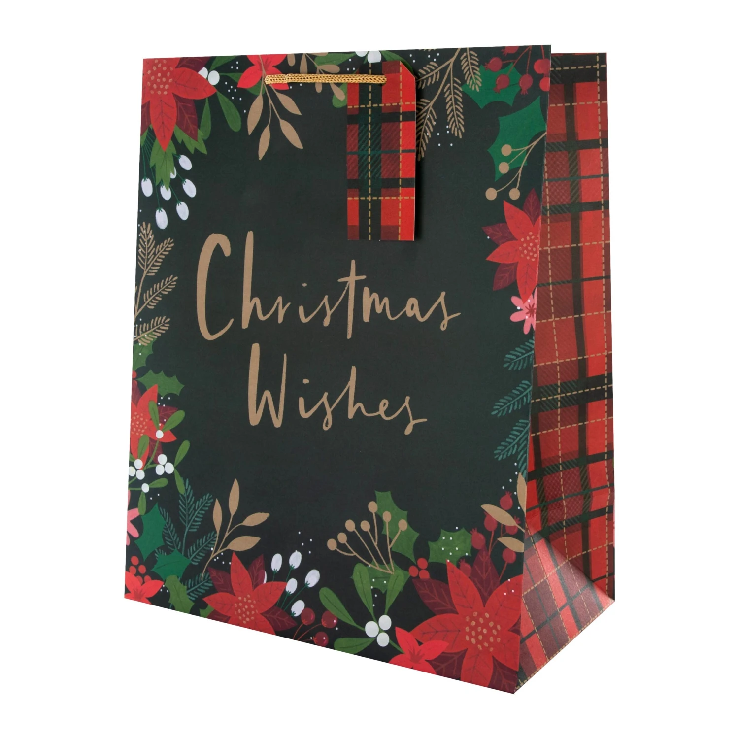 All bags feature a die cut shape and die cut gift tag, die cut gold knitted paper cord handles, 3 bleached Kraft designs, 1 Green and red floral design with tartan sides, 1 Tartan design, and 1 Green and red floral design with a robin and tartan sides.
