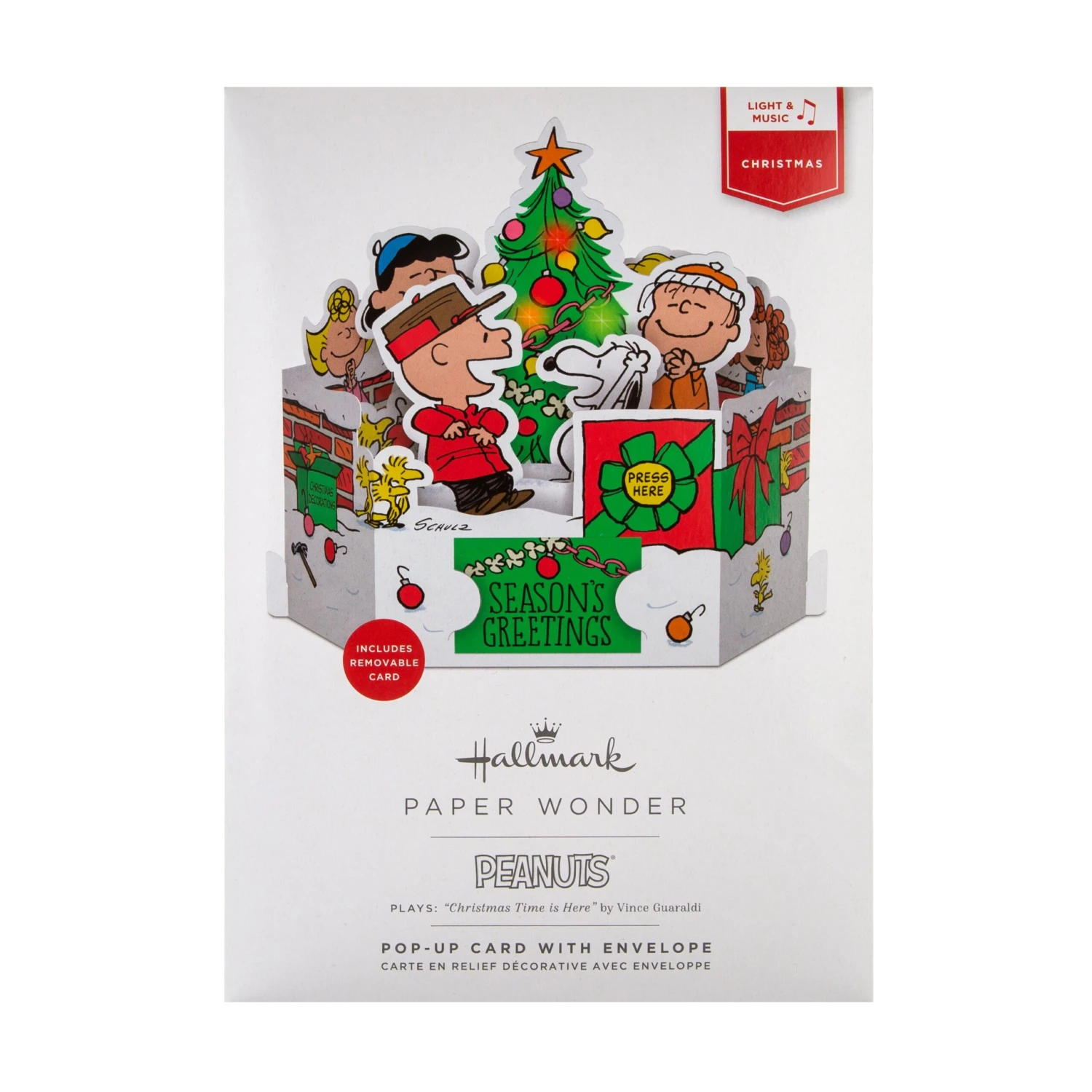 Printed on high-quality this card features a 3D pop up card with all the familiar faces of the PEANUTS’ children: Charlie Brown, Snoopy, Woodstock, Linus Van Pelt, Lucy Van Pelt, Schroeder, Sally Brown, Pigpen, and more of the Peanuts gang, around a Christmas tree that lights up, a musical feature which plays ‘Christmas Time is Here’ by Vince Guaraldi, and comes complete with a co-ordinating red, Hallmark branded envelope.