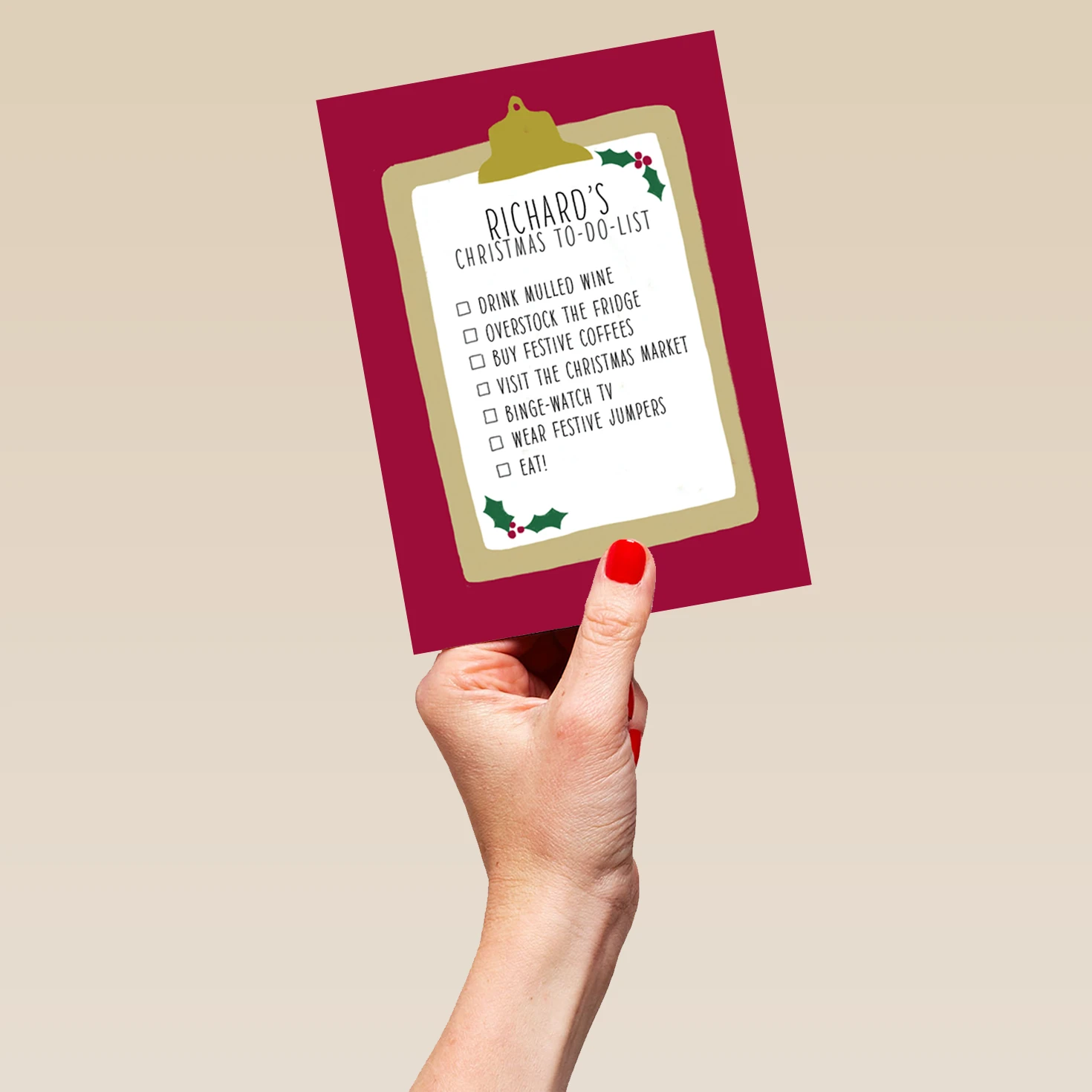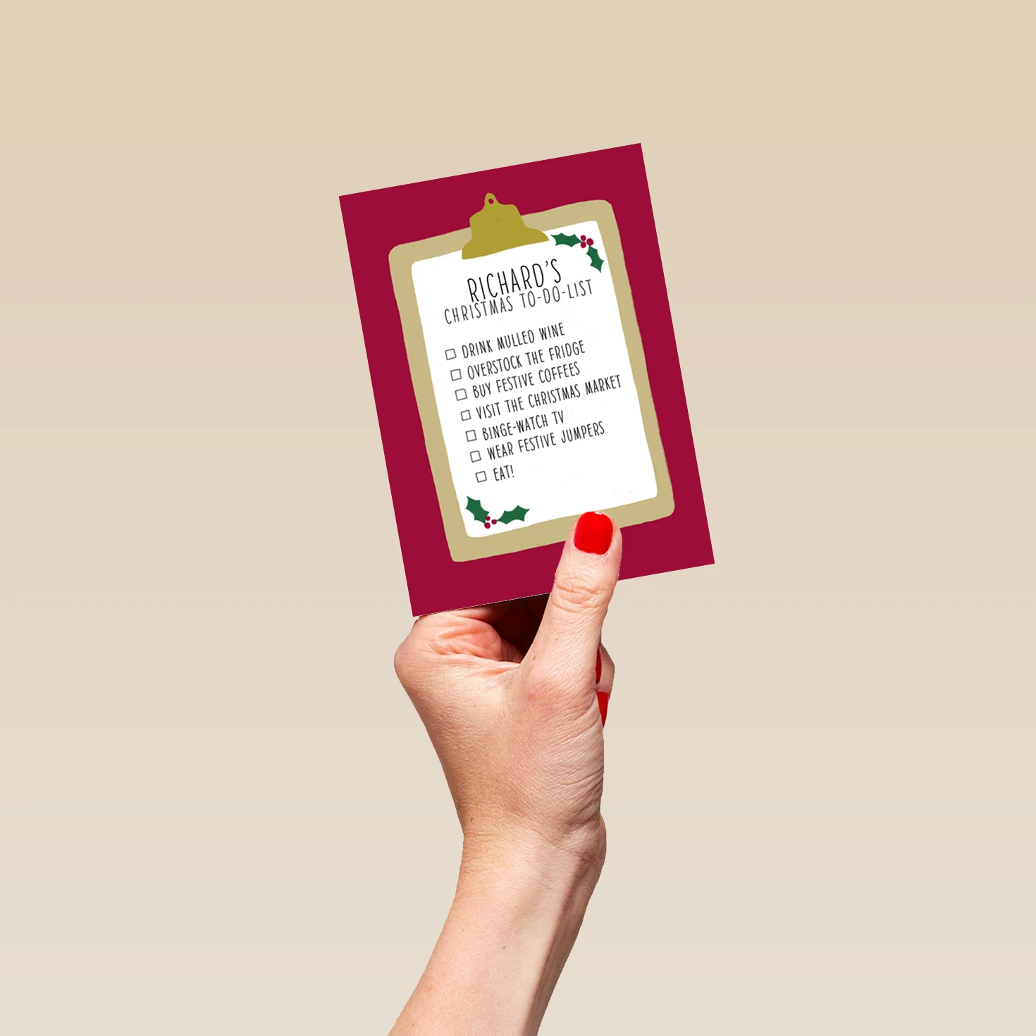 Show them you care with a personalised boys nice to do list Christmas card from Hallmark. Our greetings cards are printed on premium quality, FSC®-certified card & delivered nationwide. This card is available as standard 12cm by 16.7cm and large 15.5cm by 21.6cm.