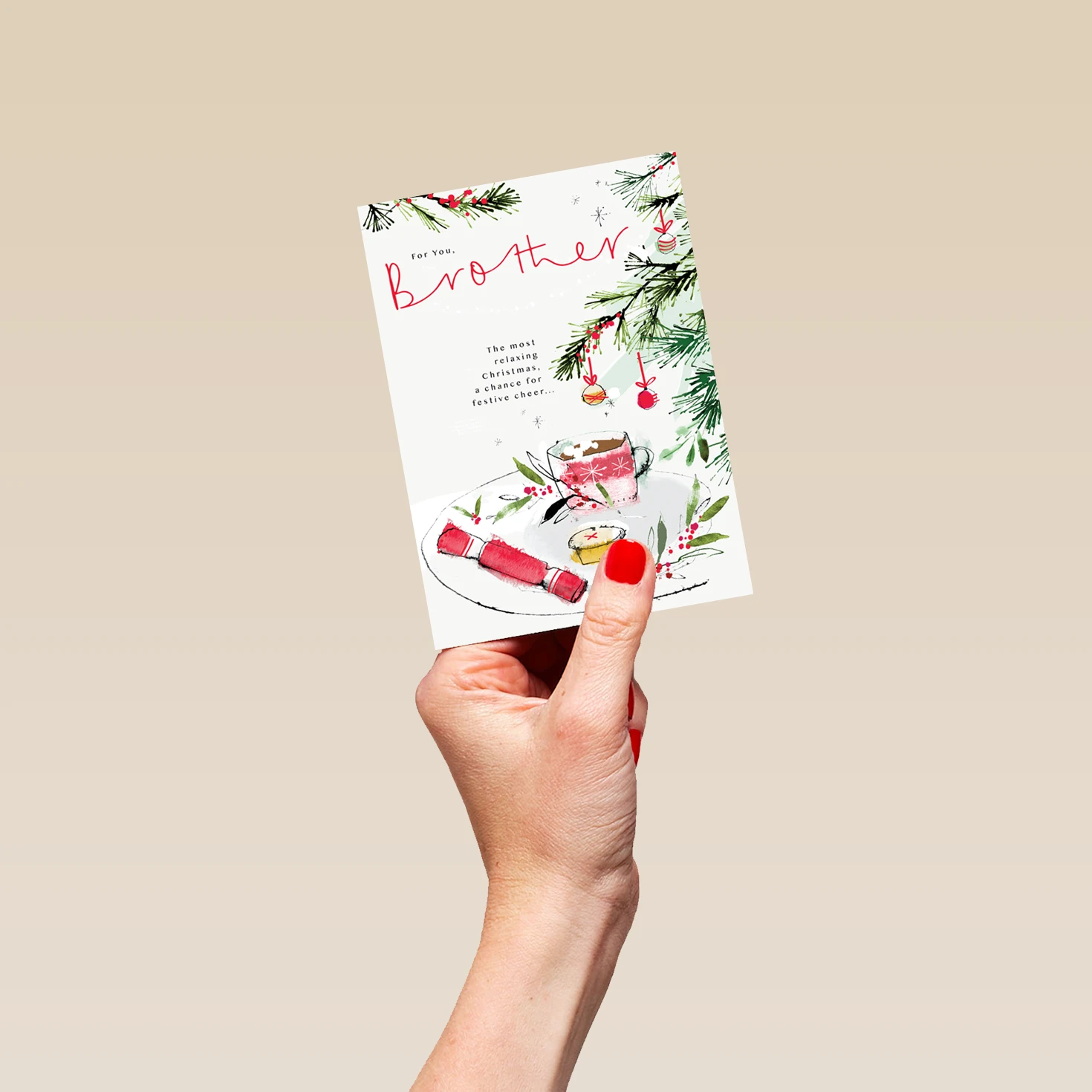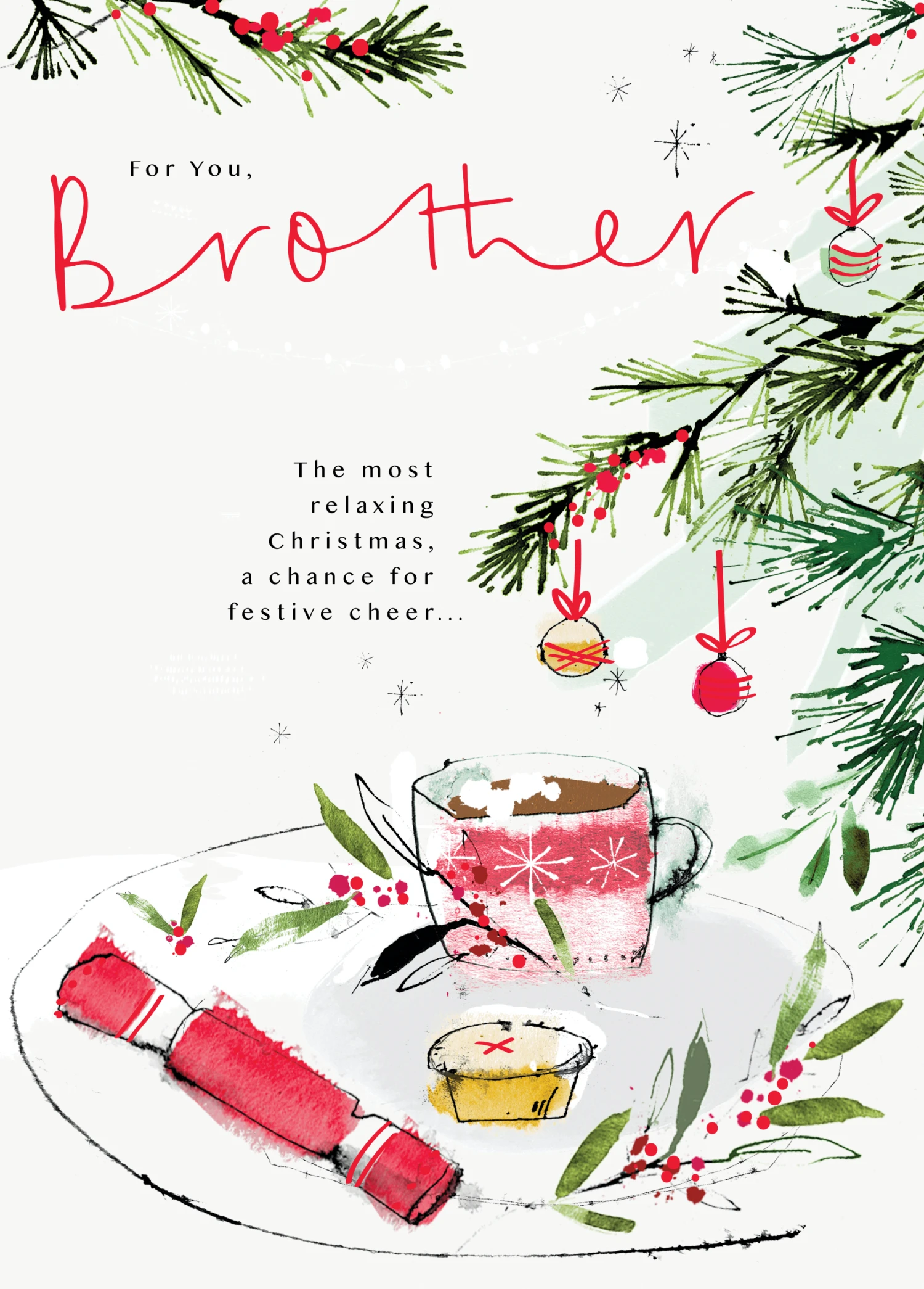 Show them you care with a personalised brother mince pie and cracker Christmas card from Hallmark. Our greetings cards are printed on premium quality, FSC®-certified card & delivered nationwide. This card is available as standard 12cm by 16.7cm and large 15.5cm by 21.6cm.