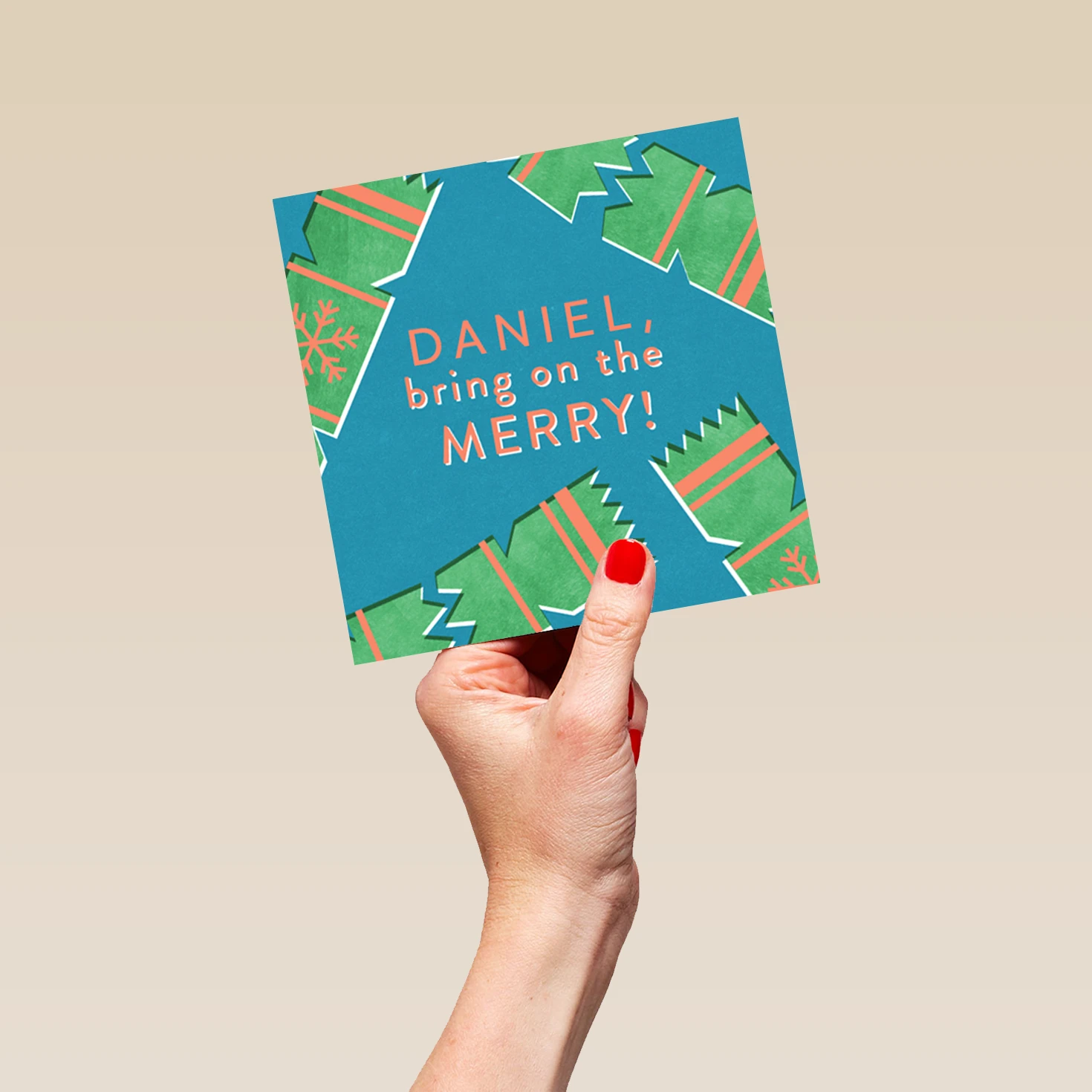 Printed on premium-quality board, this card features Christmas crackers, space to personalise a name, and the message ‘bring on the Merry!’.