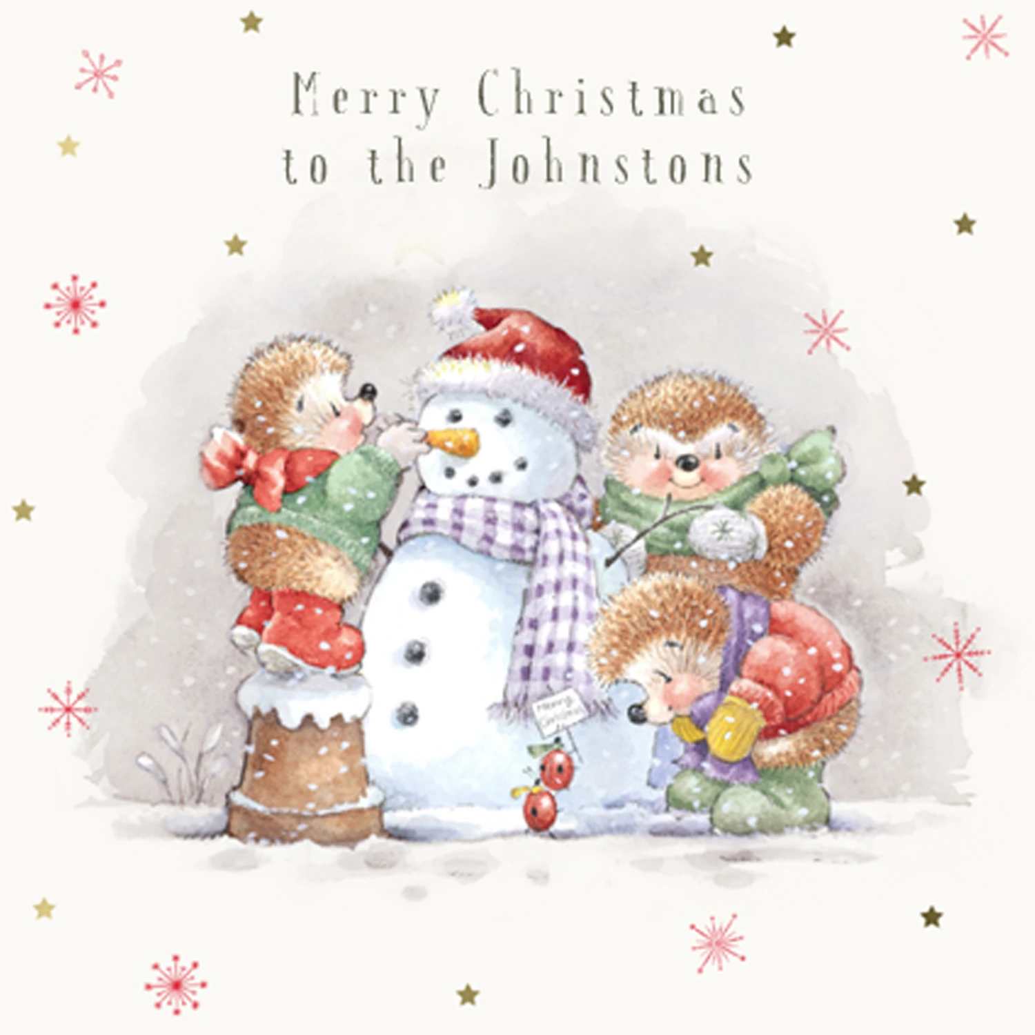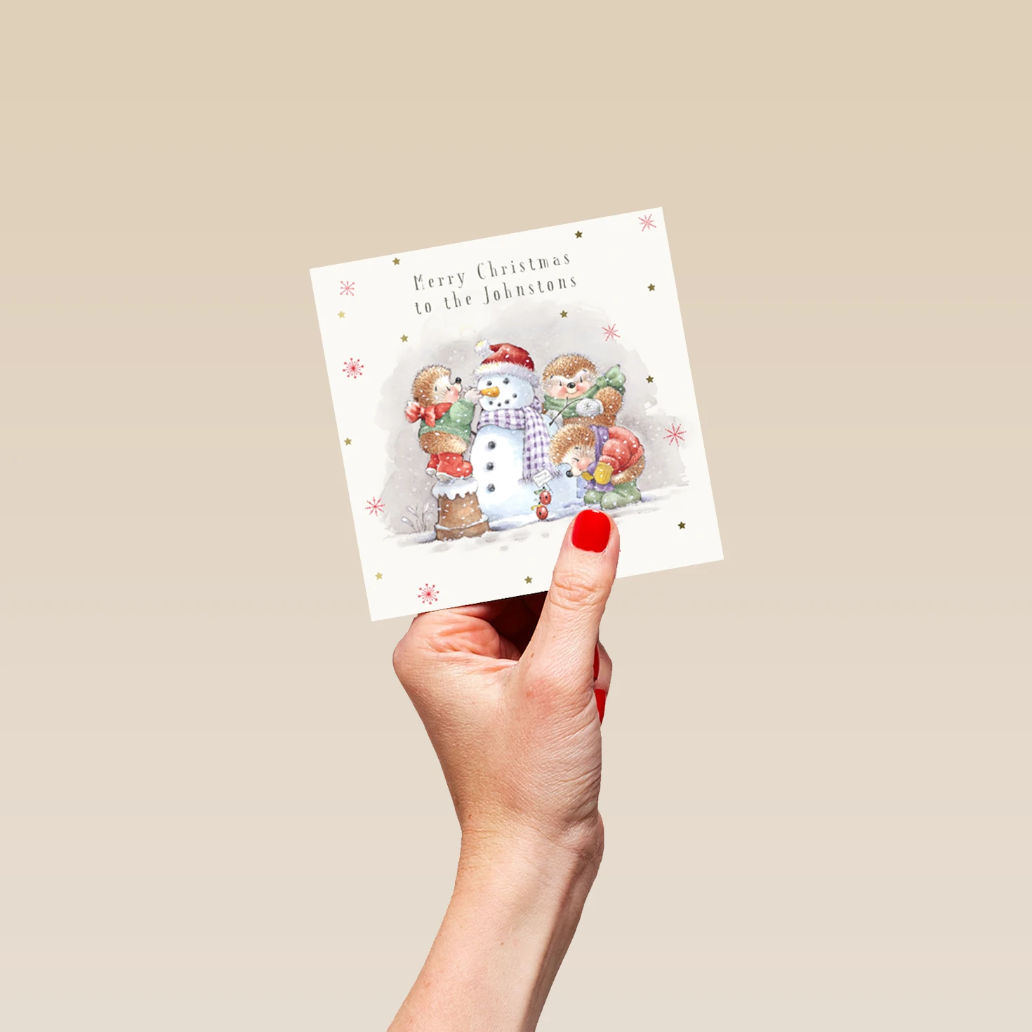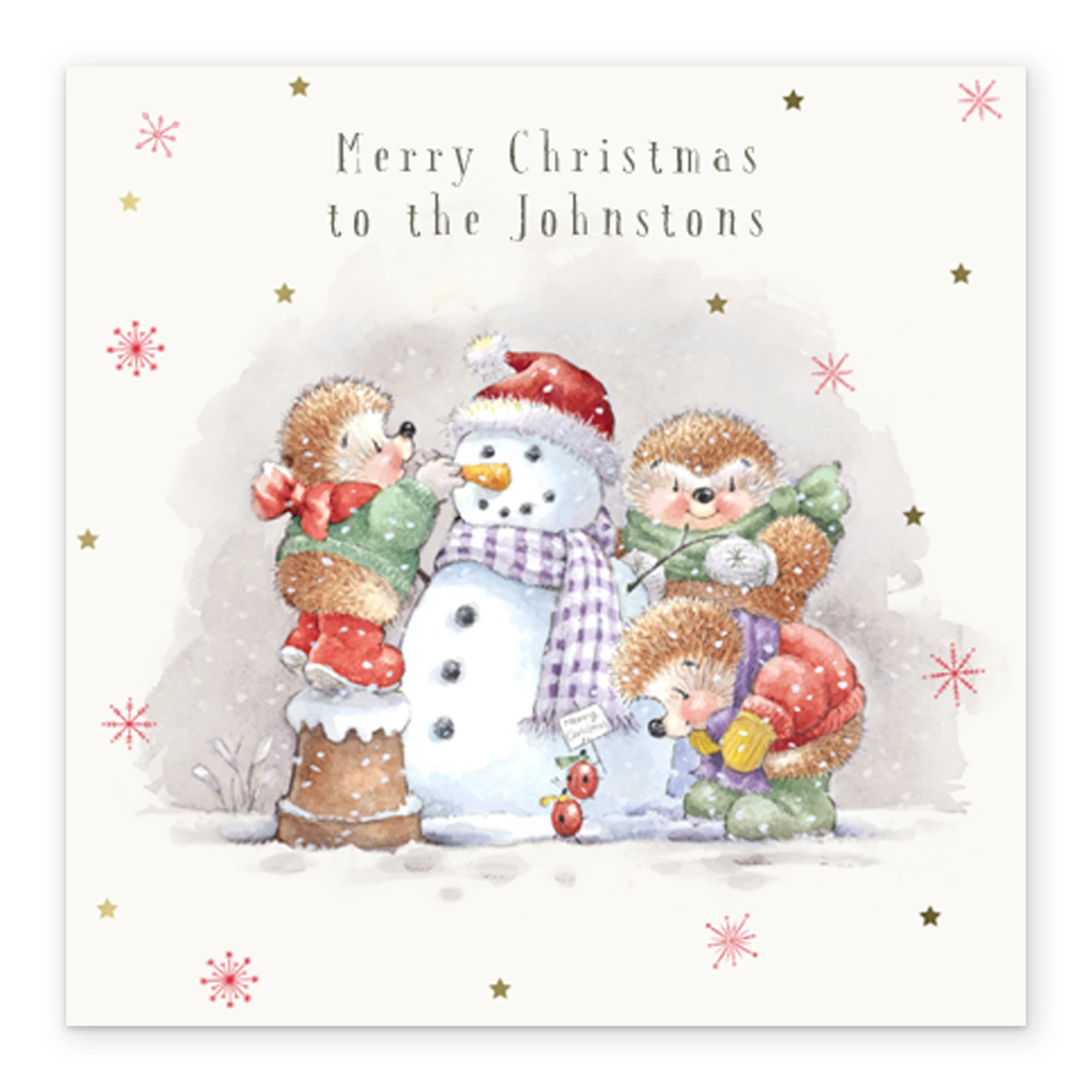 Show them you care with a personalised Christmas family Country Companions snow card from Hallmark. Our greetings cards are printed on premium quality, FSC®-certified card & delivered nationwide. This card is available as standard 12cm by 12cm and large 15cm by 15cm.
