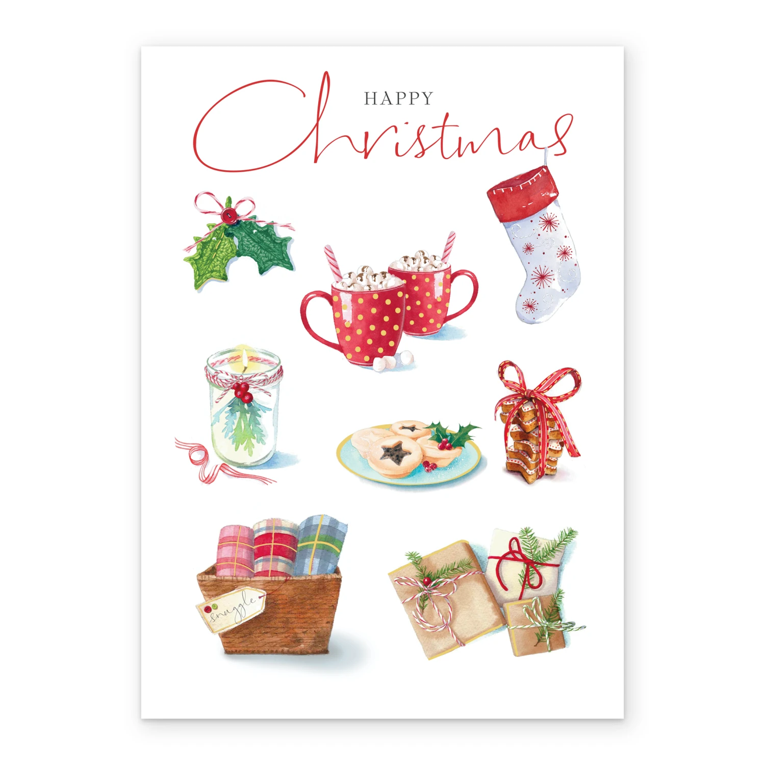 Printed on premium-quality board, this card features illustrations of classic Christmas traditions, and the message ‘Happy Christmas’.