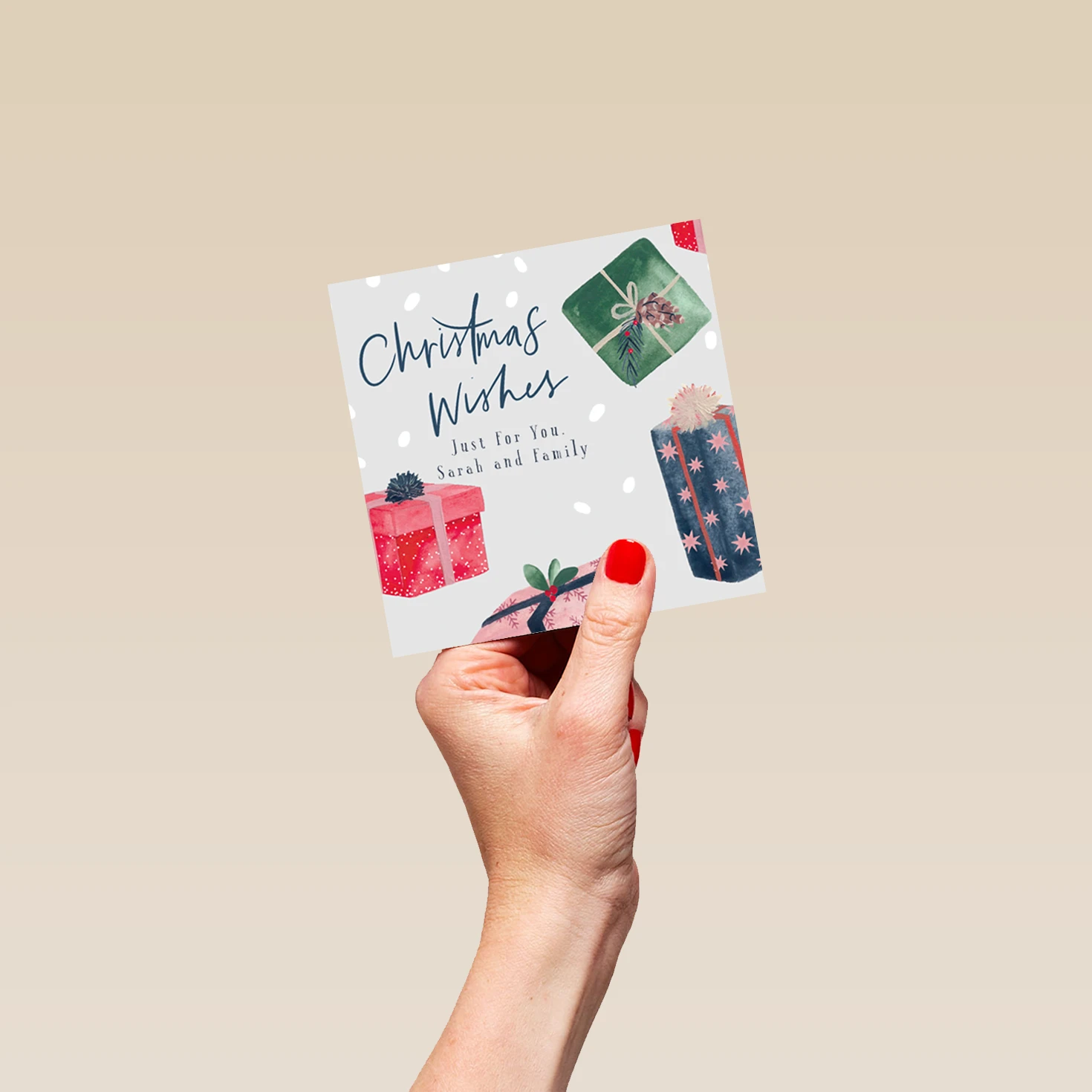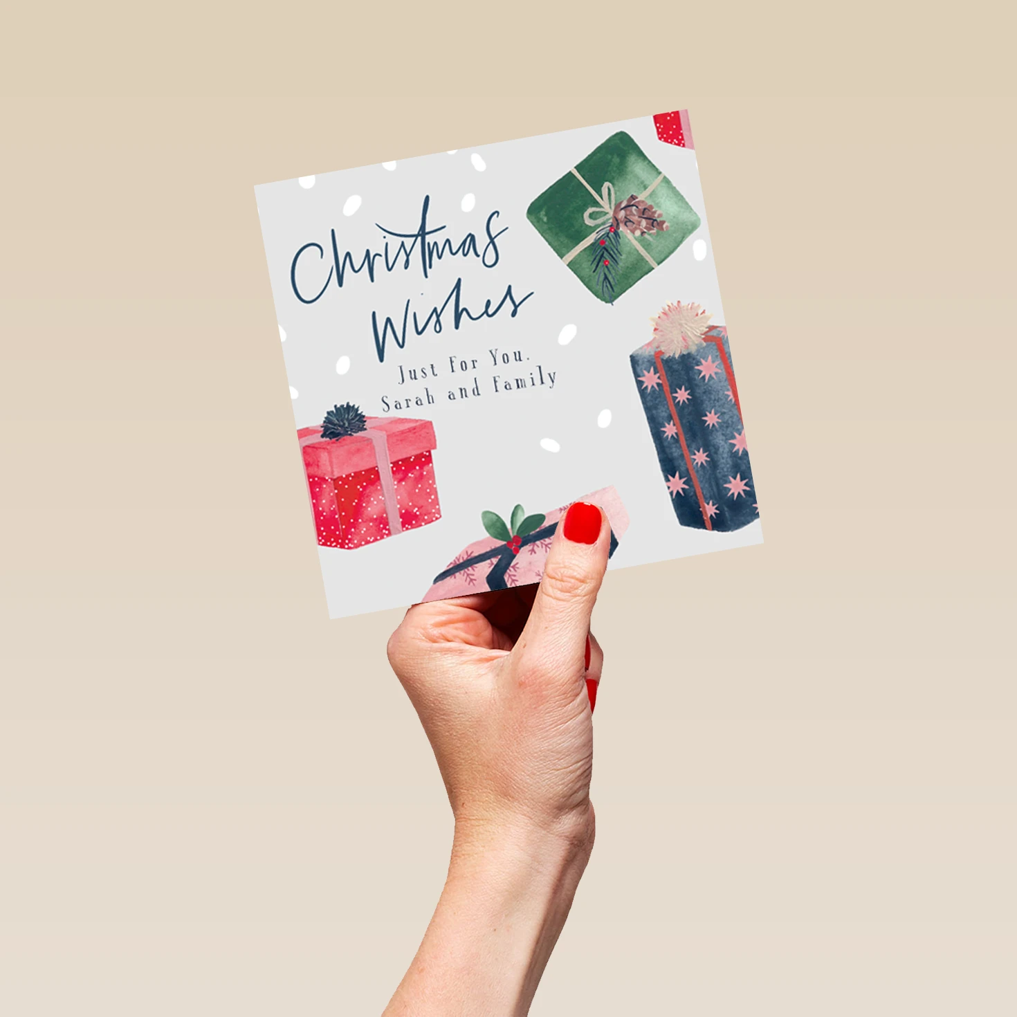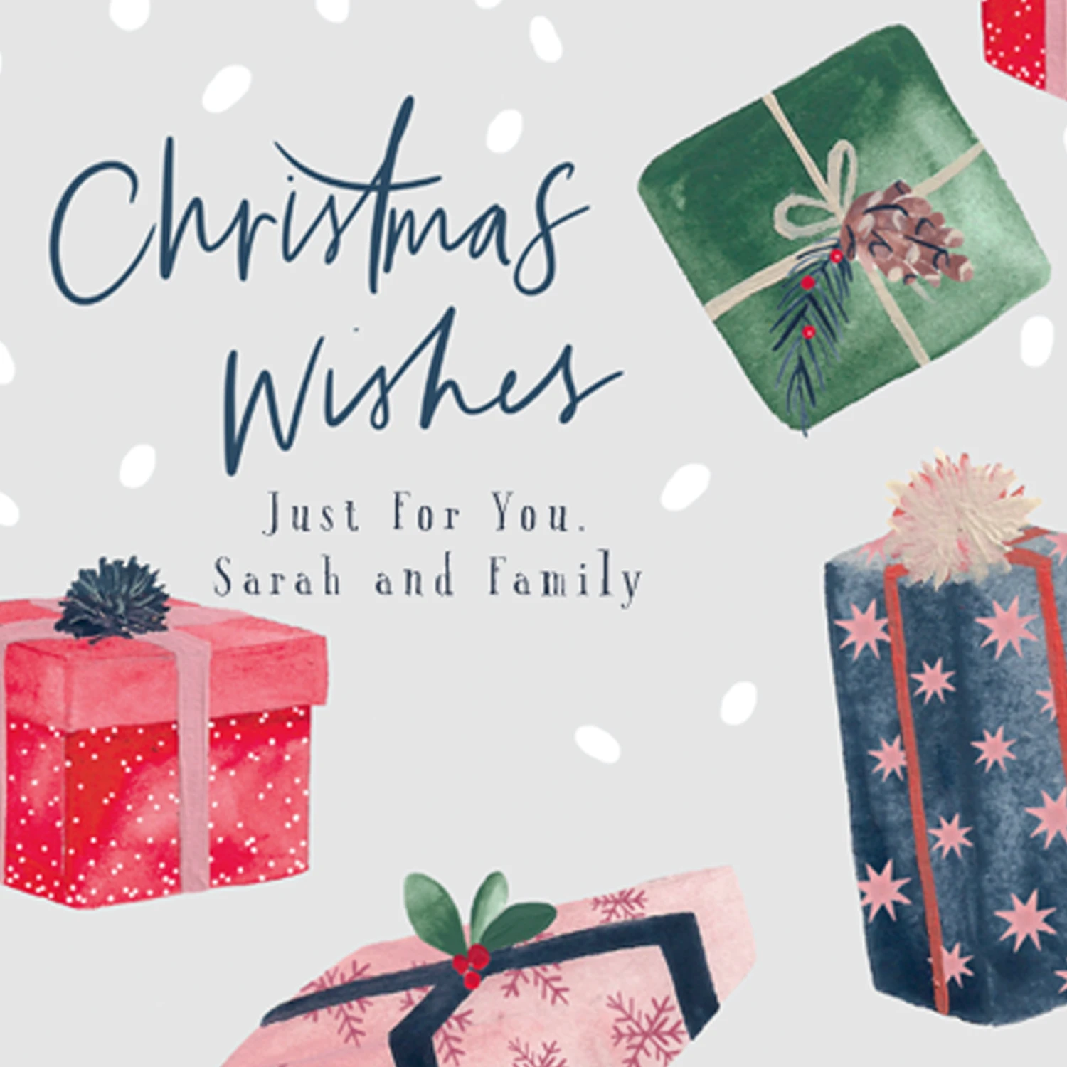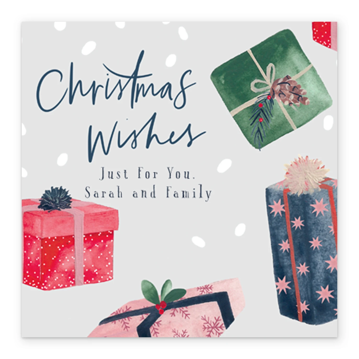 Printed on premium-quality board, this card features colourful classic illustrated wrapped Christmas presents, with the message ‘Christmas Wishes’, space to personalise your message, and comes complete with a co-ordinating white envelope.