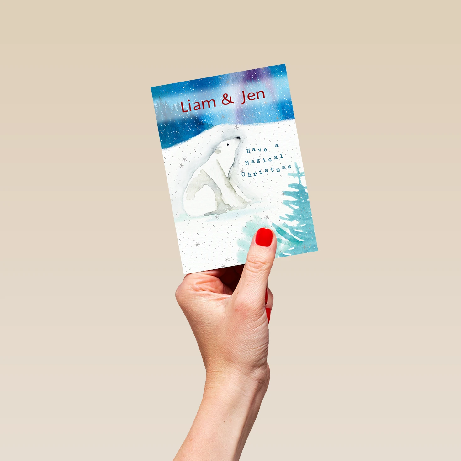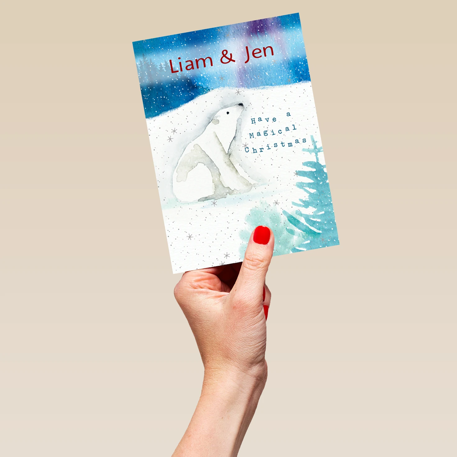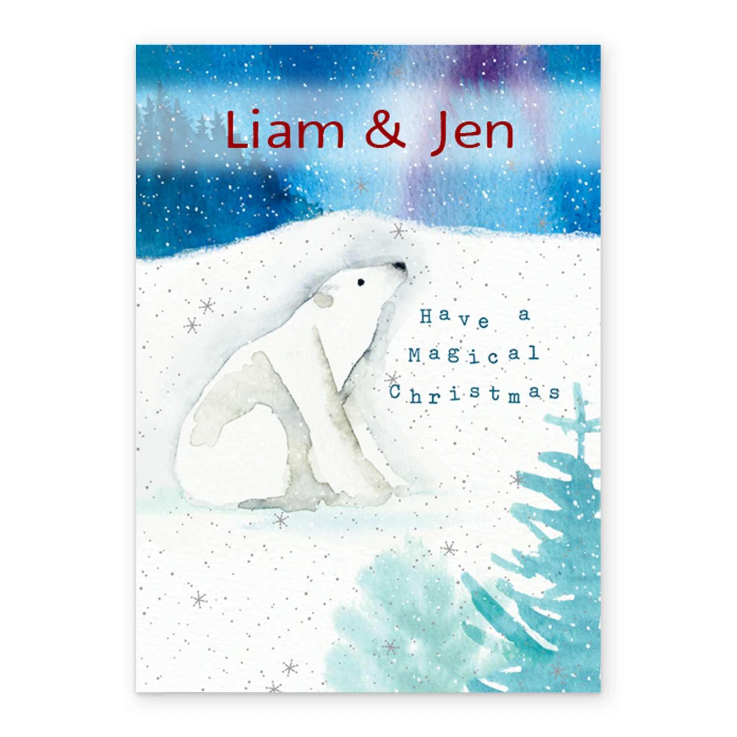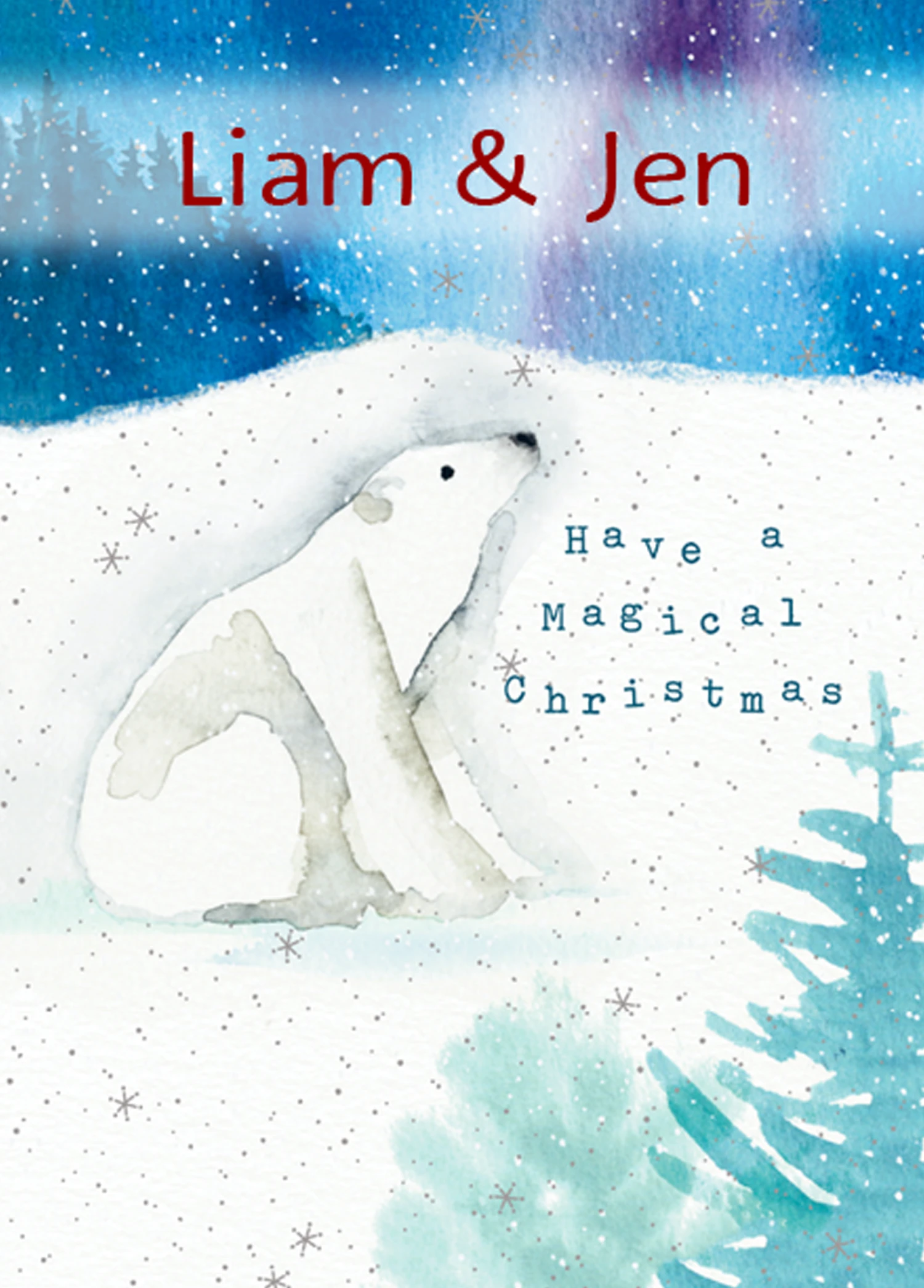 Show them you care with a personalised cute bear snowy winter night card from Hallmark. Our Christmas cards are printed on premium quality, FSC®-certified card & delivered nationwide. This card is available as standard 12cm by 16.7cm and large 15.5cm by 21.6cm.