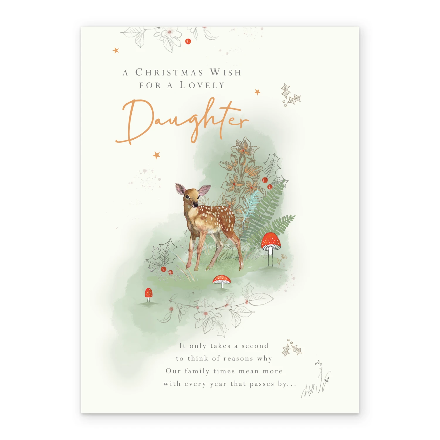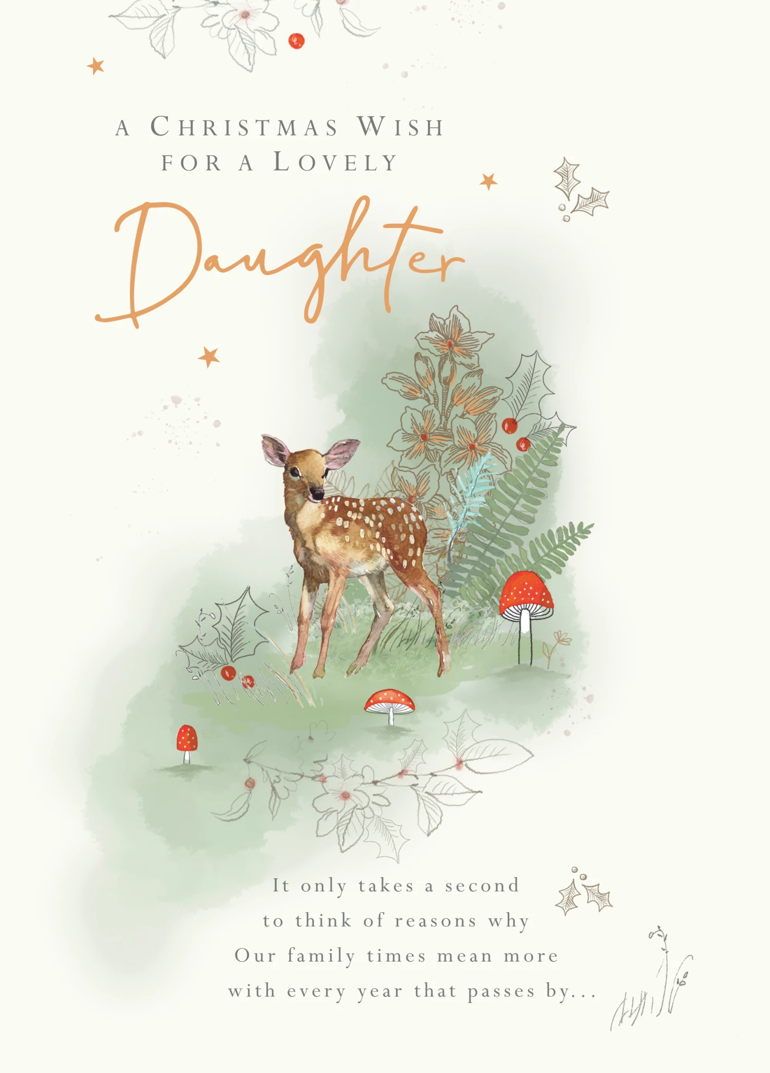 Printed on premium-quality board, this card features an adorable deer illustration with a woodland background and red mushrooms, and a heartfelt verse and comes complete with a co-ordinating white envelope.