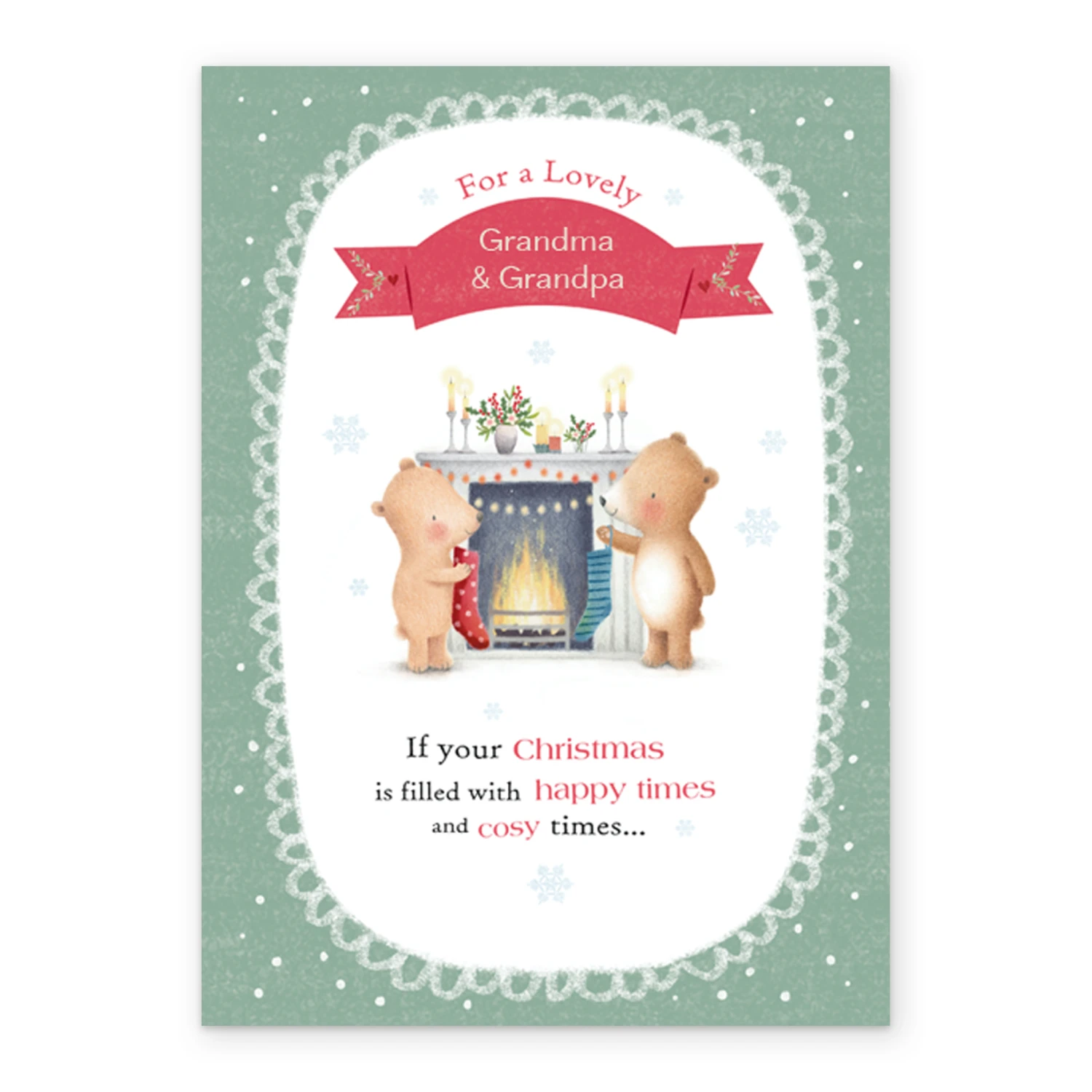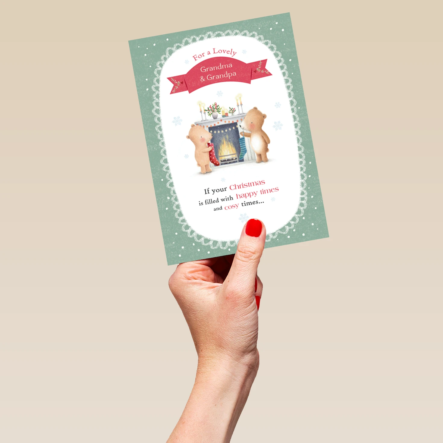 Printed on premium-quality board, this card features an illustration of two bears in front of a fire, with space to personalise names or relations, and comes complete with a co-ordinating white envelope.