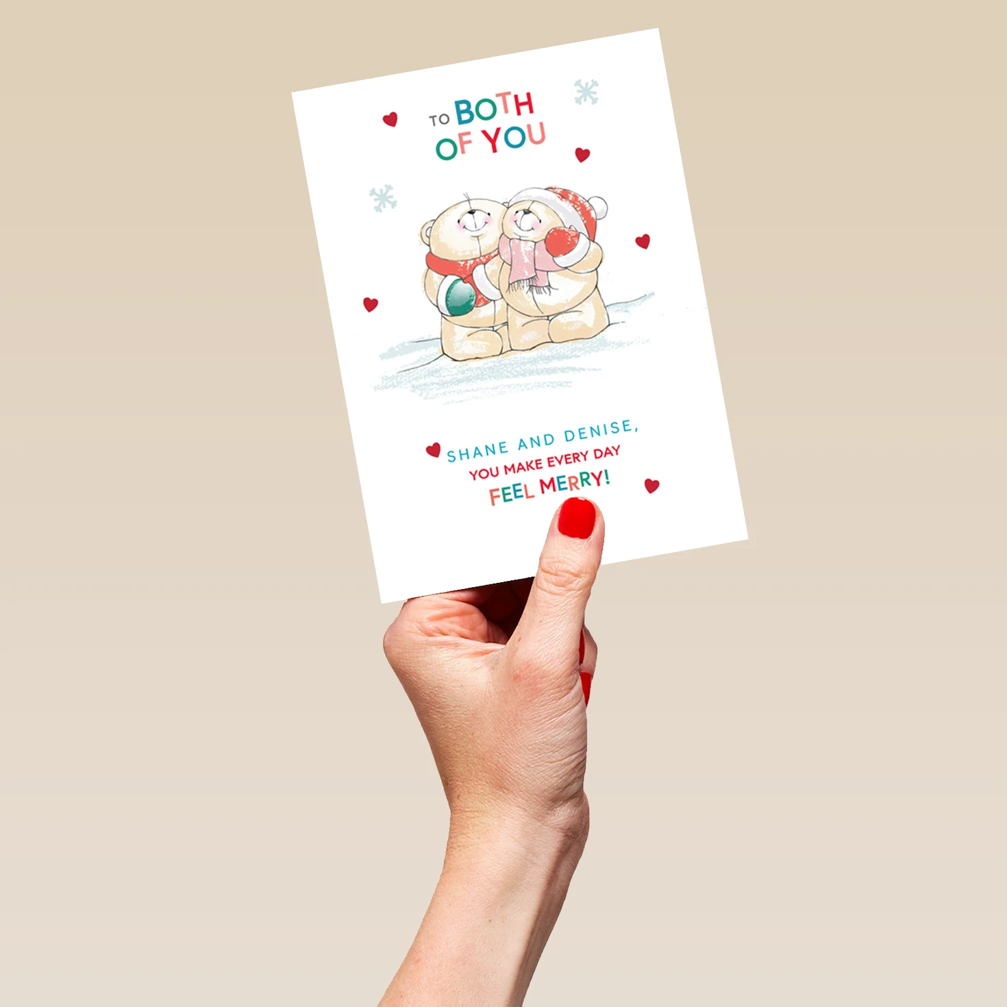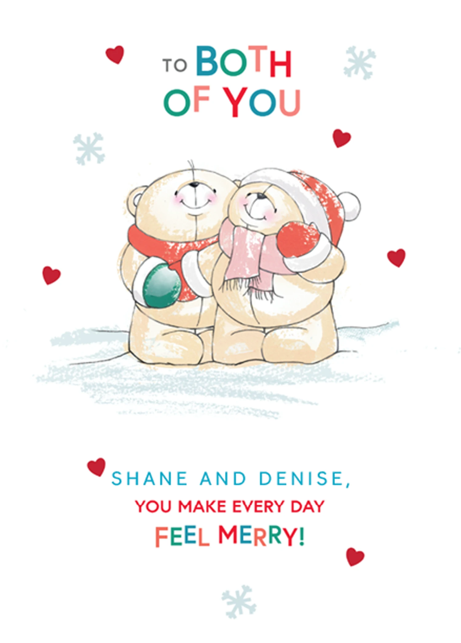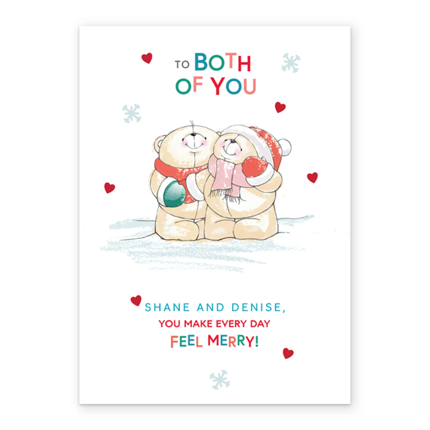 Show them you care with a personalised cute Forever Friends Christmas card for both of you from Hallmark. Our Christmas cards are printed on premium quality, FSC®-certified card & delivered nationwide. This card is available as standard 12cm by 16.7cm and large 15.5cm by 21.6cm.