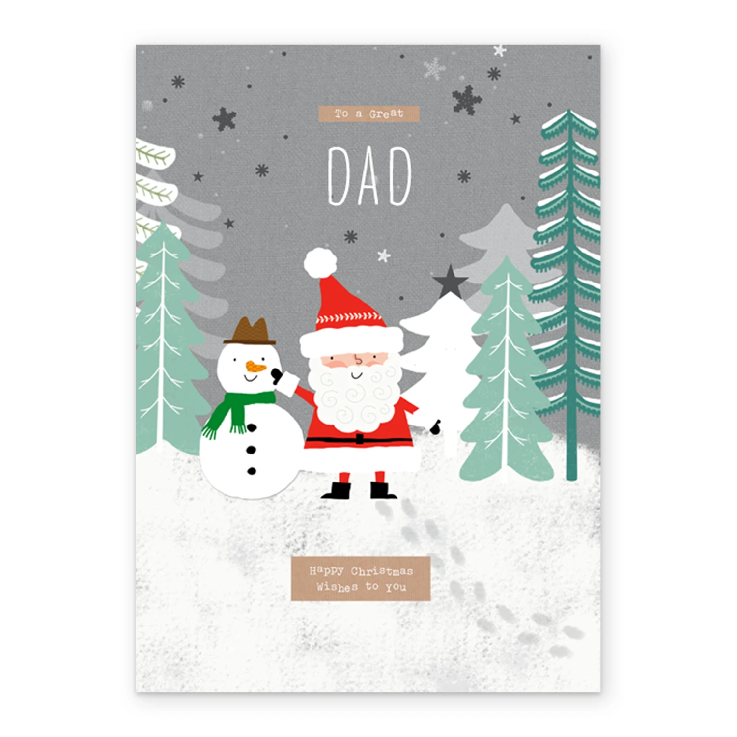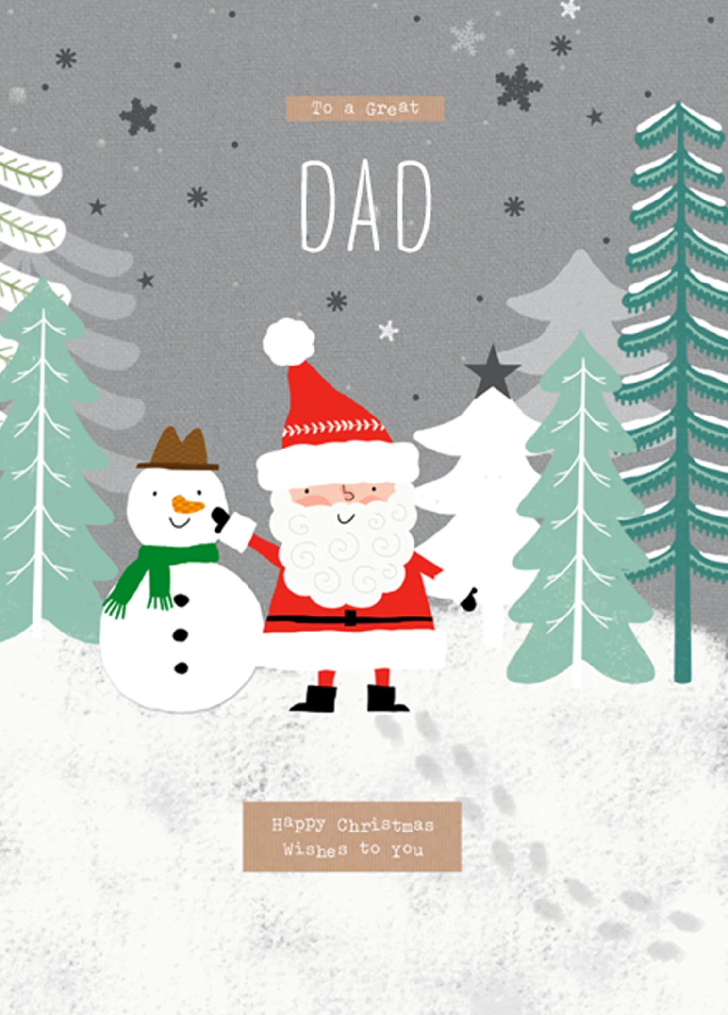 Show them you care with a personalised dad cute Santa Claus snowman Christmas card from Hallmark. Our greetings cards are printed on premium quality, FSC®-certified card & delivered nationwide. This card is available as standard 12cm by 16.7cm and large 15.5cm by 21.6cm.