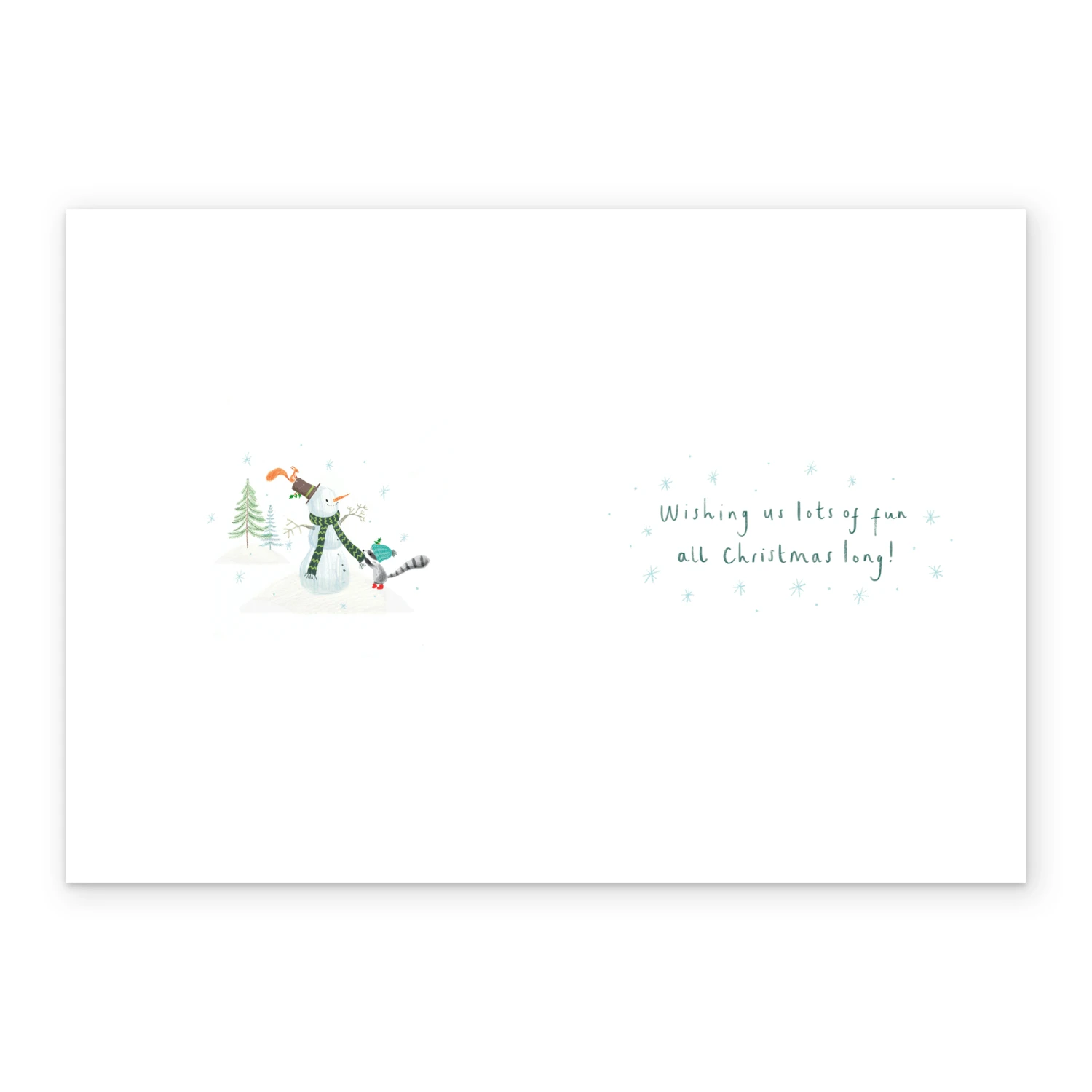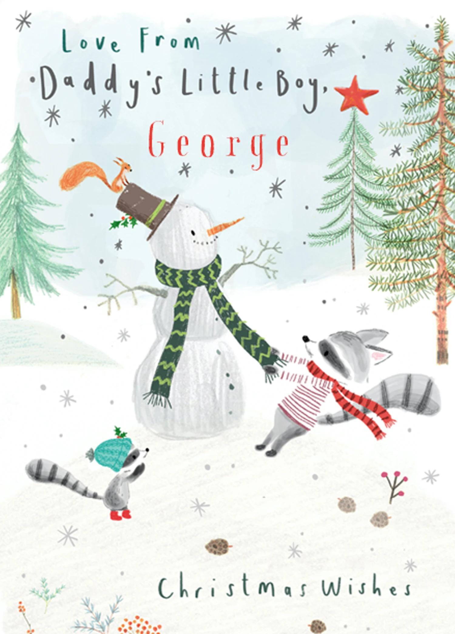 Show them you care with a personalised daddy from little boy cute snowman raccoons Christmas card from Hallmark. Our greetings cards are printed on premium quality, FSC®-certified card & delivered nationwide. This card is available as standard 12cm by 16.7cm and large 15.5cm by 21.6cm.