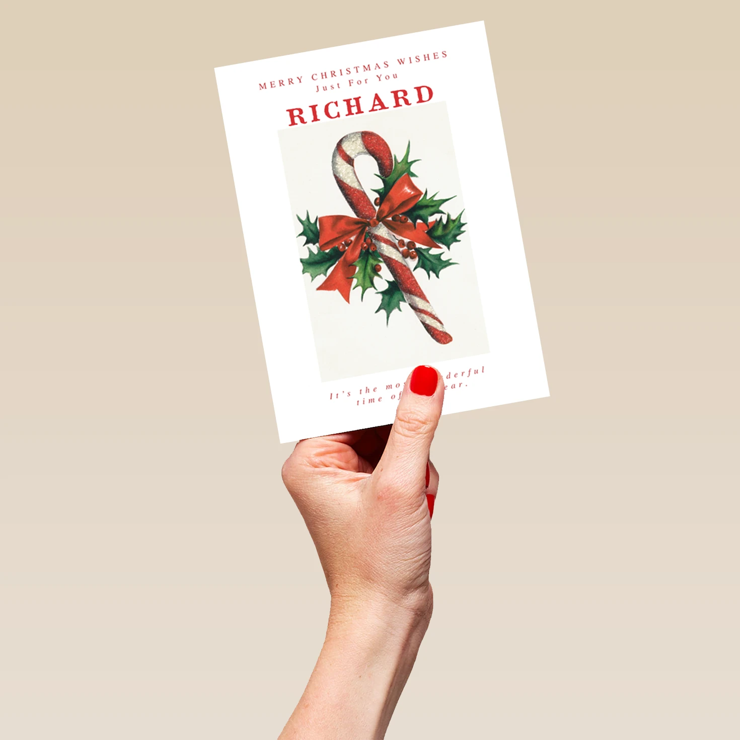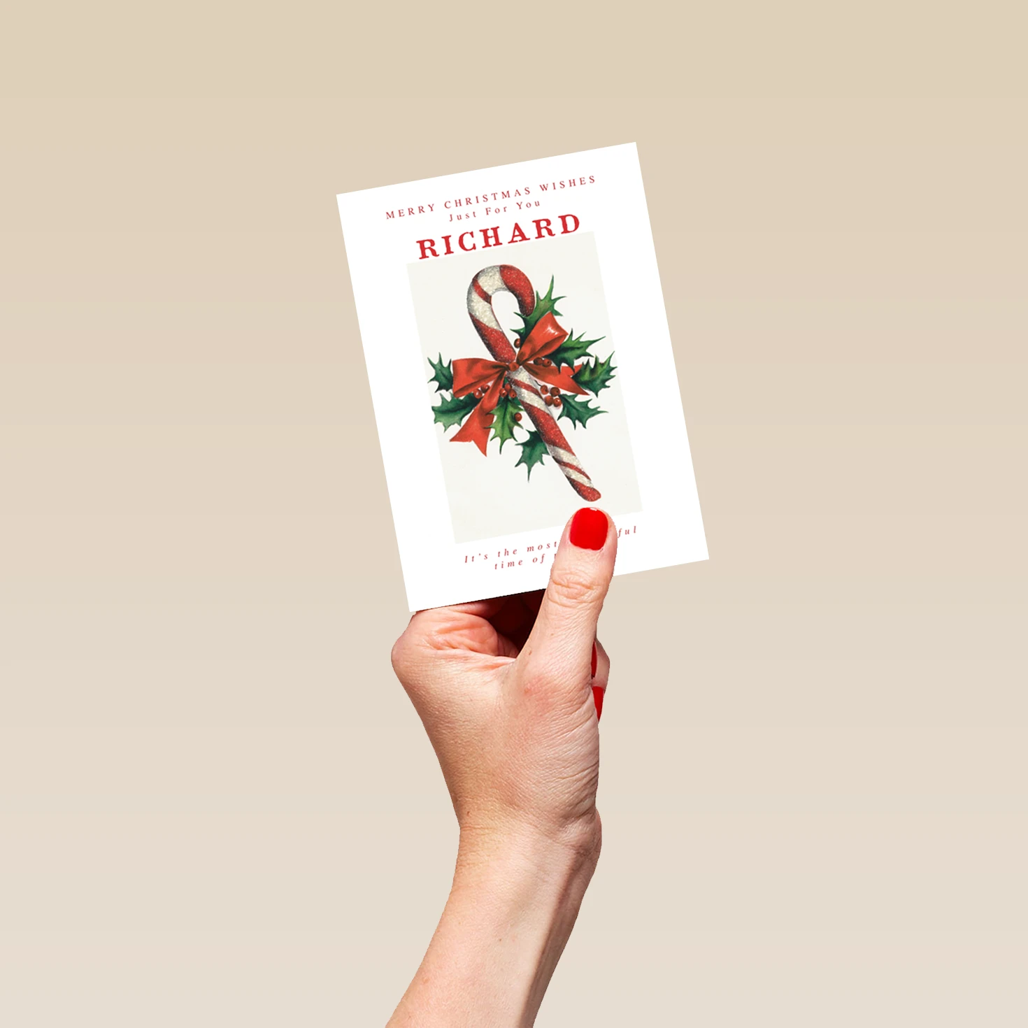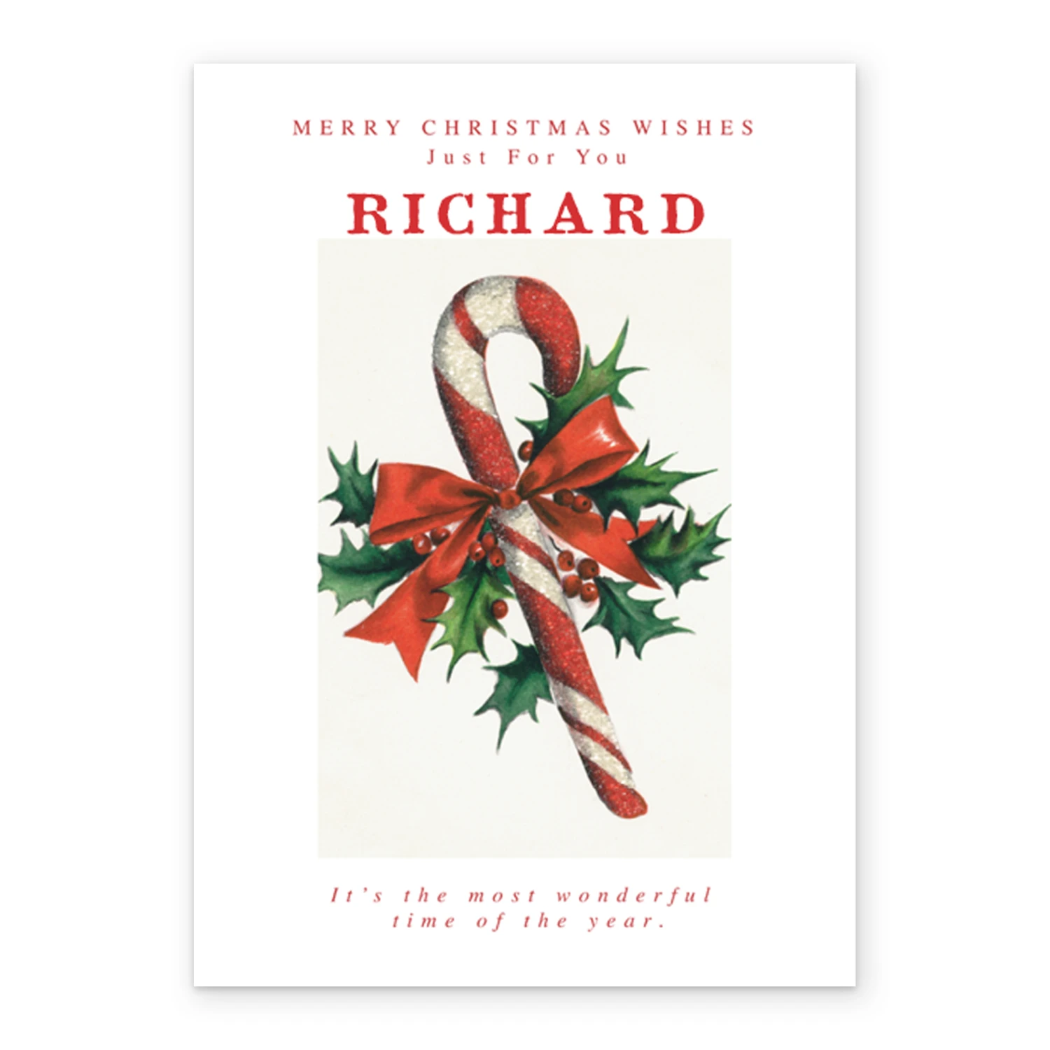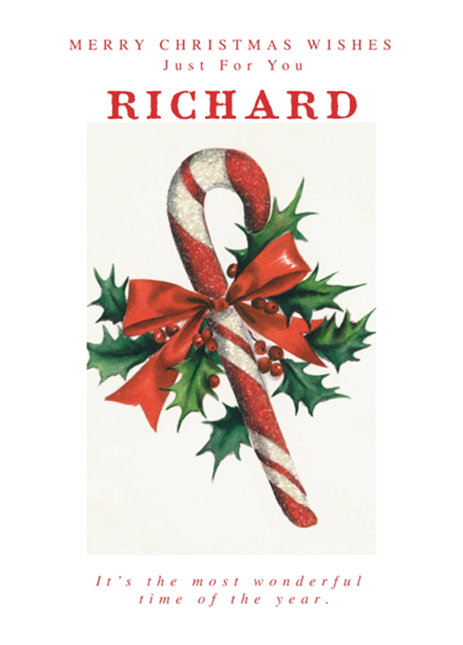 Printed on premium-quality board, this card features a vintage-styled candy cane, space to personalise a name, a festive message on the front, and a wonderful post-card styled informational piece on the history of the candy cane on the inside.