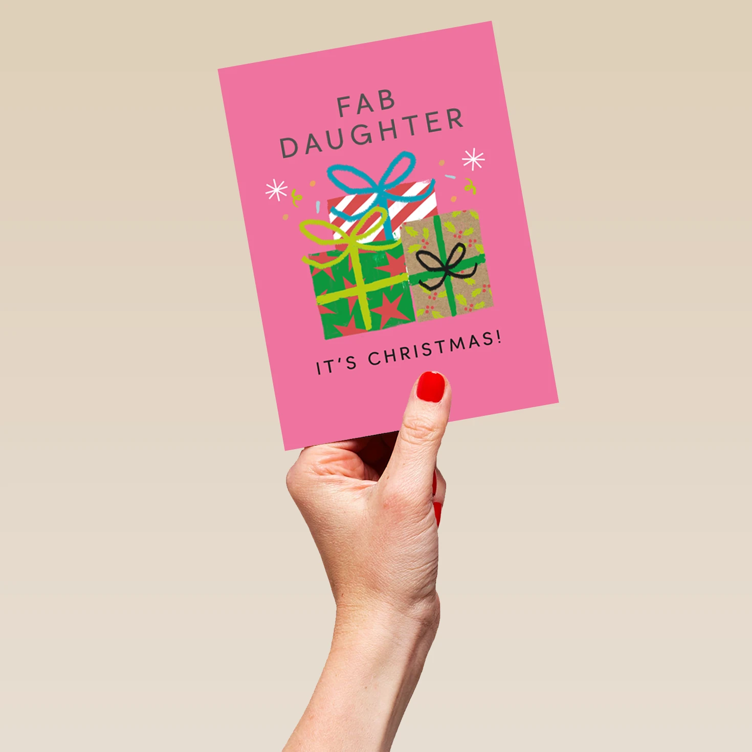 Show them you care with a personalised fab daughter gifts Christmas card from Hallmark. Our greetings cards are printed on premium quality, FSC®-certified card & delivered nationwide. This card is available as standard 12cm by 16.7cm and large 15.5cm by 21.6cm.