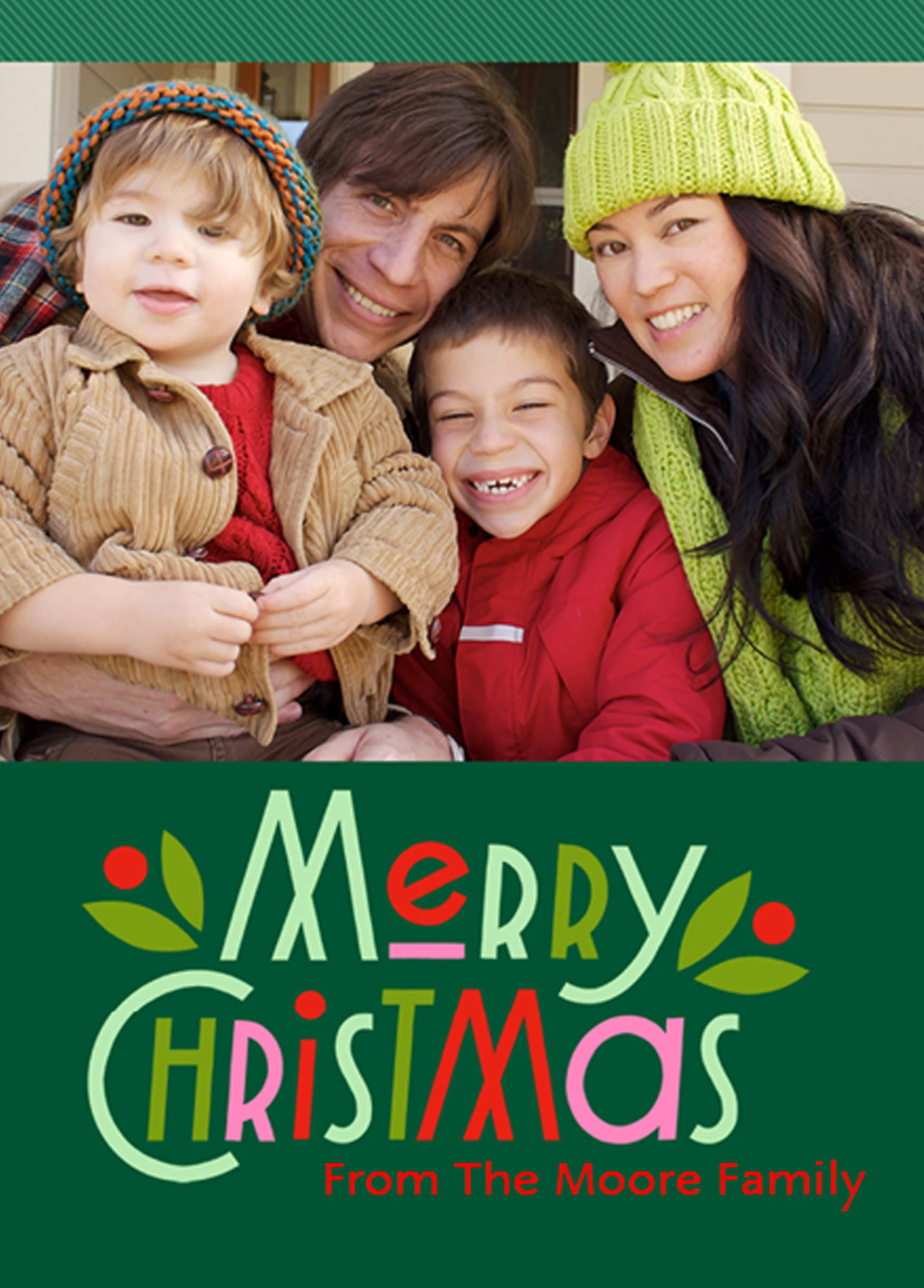 Show them you care with a personalised family photo card from Hallmark. Our Christmas cards are printed on premium quality, FSC®-certified card & delivered nationwide. This card is available as standard 12cm by 16.7cm and large 15.5cm by 21.6cm.