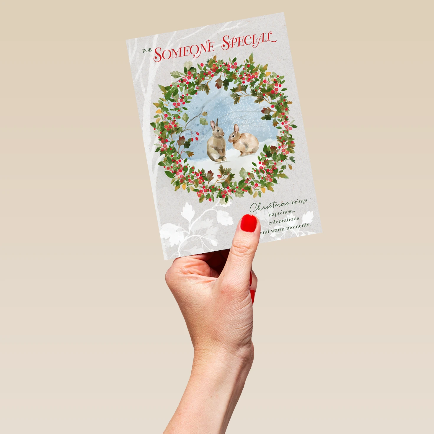 Show them you care with a personalised someone special wreath card from Hallmark. Our Christmas cards are printed on premium quality, FSC®-certified card & delivered nationwide. This card is available as standard 12cm by 16.7cm and large 15.5cm by 21.6cm.