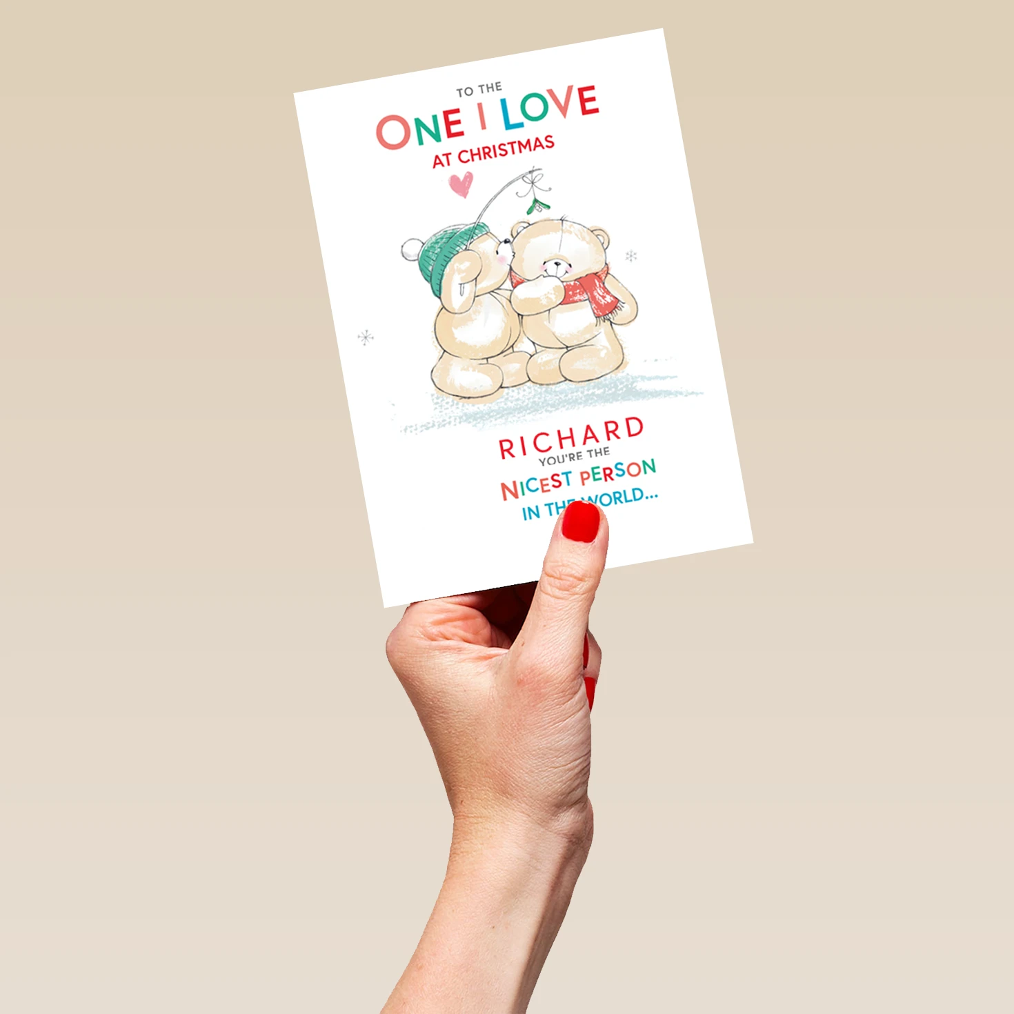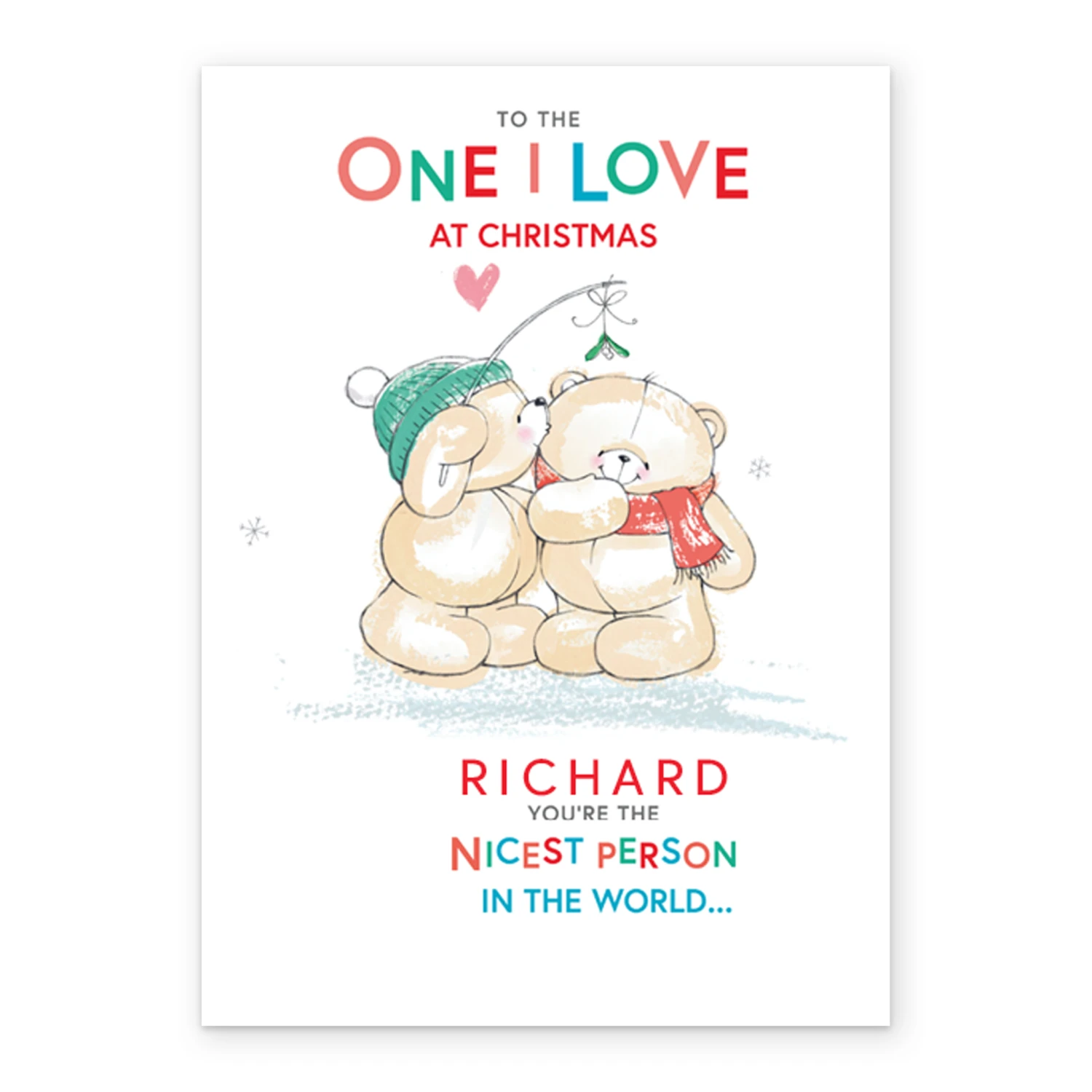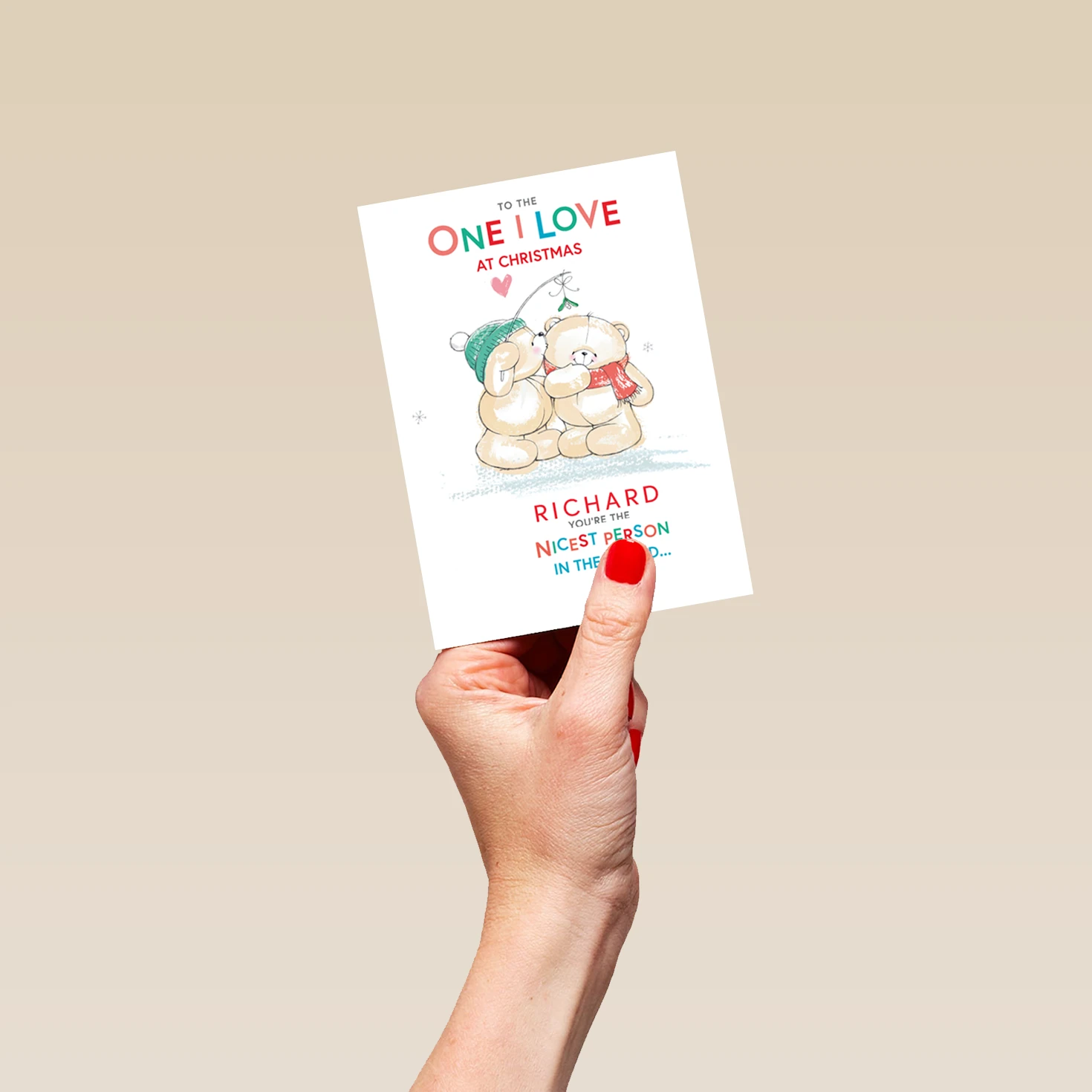 Printed on premium-quality board, this card features sweet Forever Friends bears kissing under the mistletoe, space to personalise a name, and the message ‘To the One I Love at Christmas, You’re the Nicest Person In The World…’.