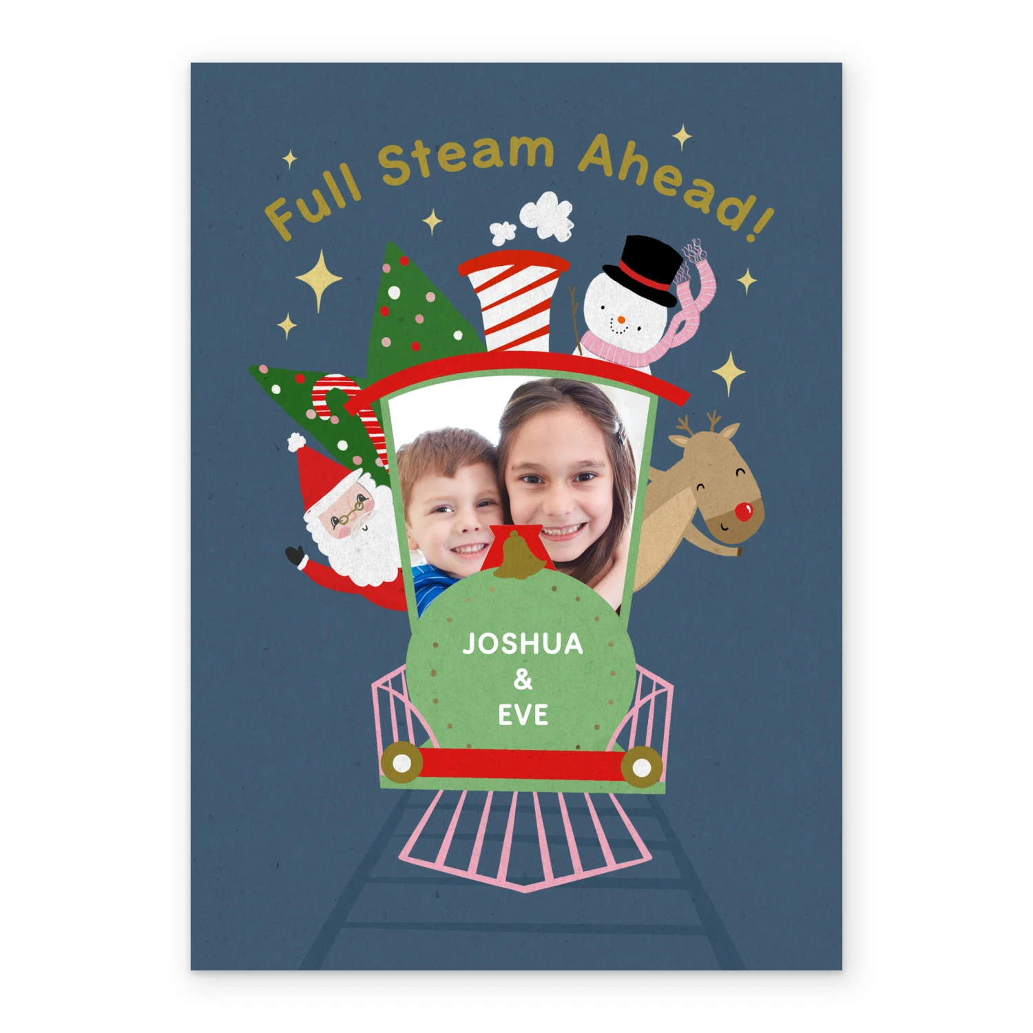 Show them you care with a personalised full steam ahead photo Christmas card from Hallmark. Our greetings cards are printed on premium quality, FSC®-certified card & delivered nationwide. This card is available as standard 12cm by 16.7cm and large 15.5cm by 21.6cm.