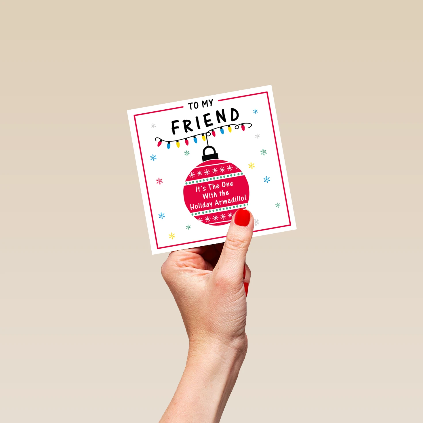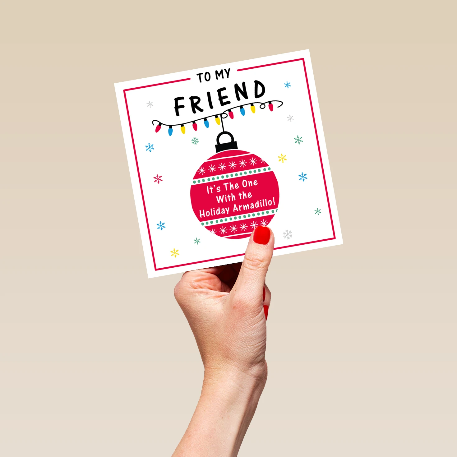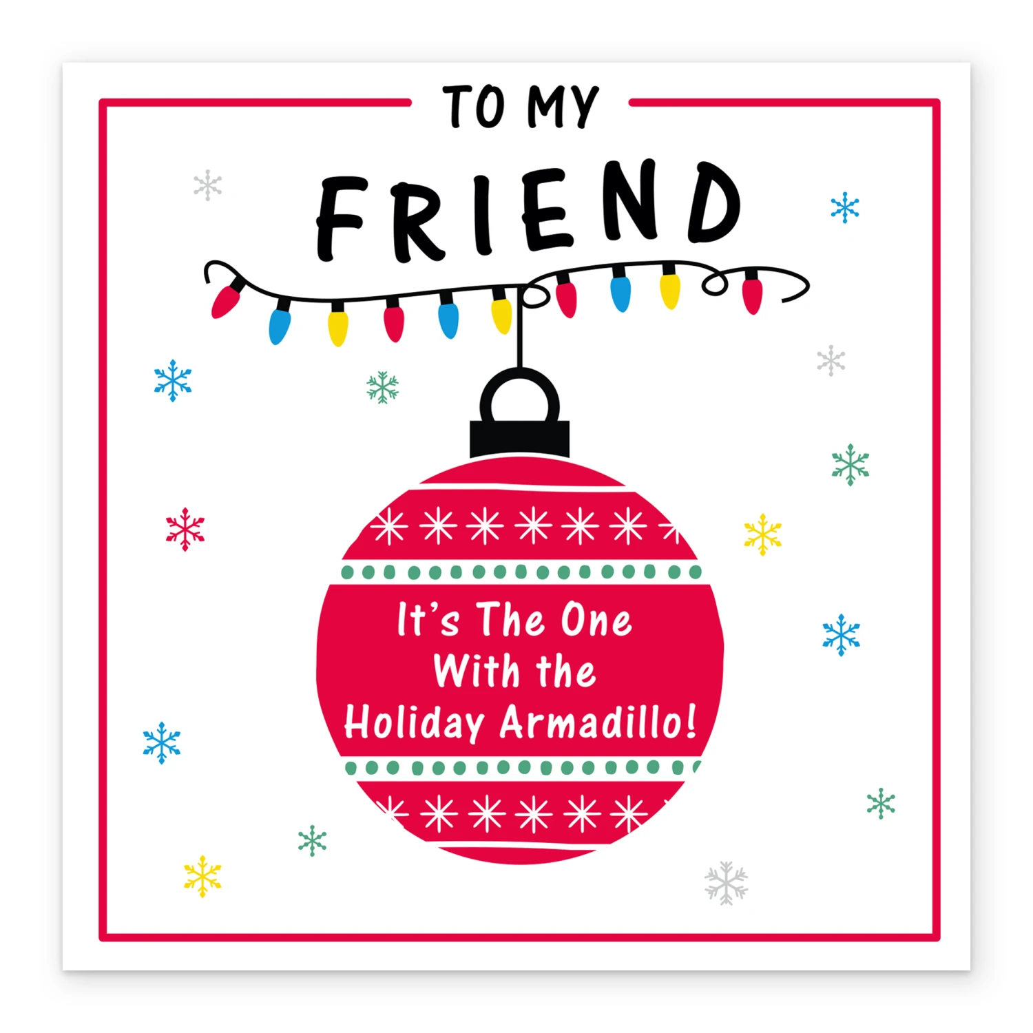 Show them you care with a personalised funny Friends™️ holiday armadillo Christmas card from Hallmark. Our Christmas cards are printed on premium quality, FSC®-certified card & delivered nationwide. This card is available as standard 12cm by 12cm and large 15cm by 15cm.