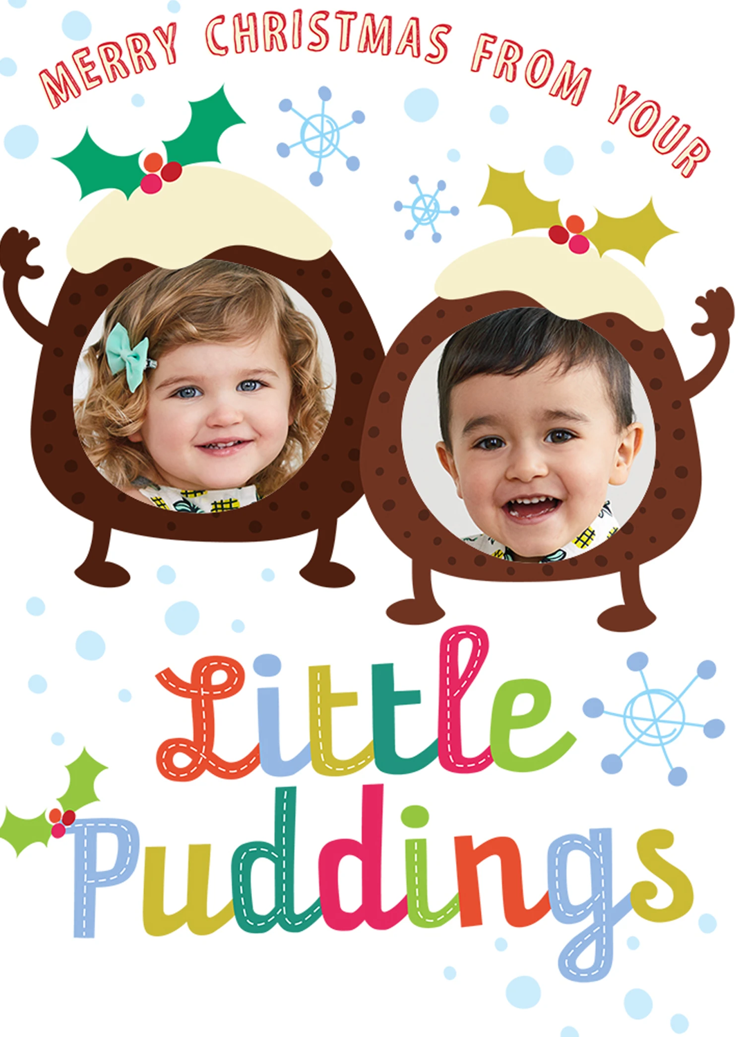 Printed on premium-quality board, this card features two spaces inside Christmas puddings to upload photos, and the message ‘Merry Christmas from your Little Puddings’.