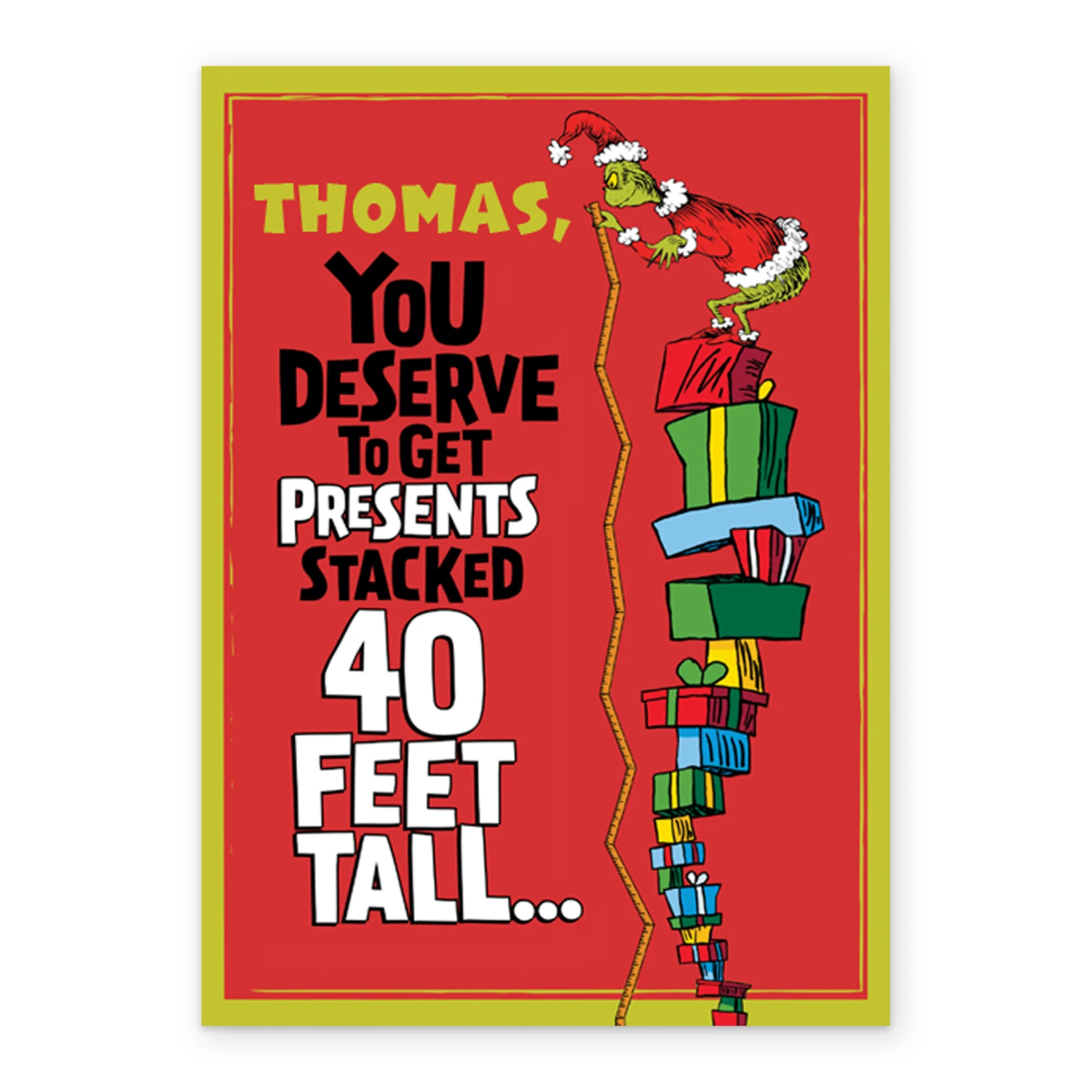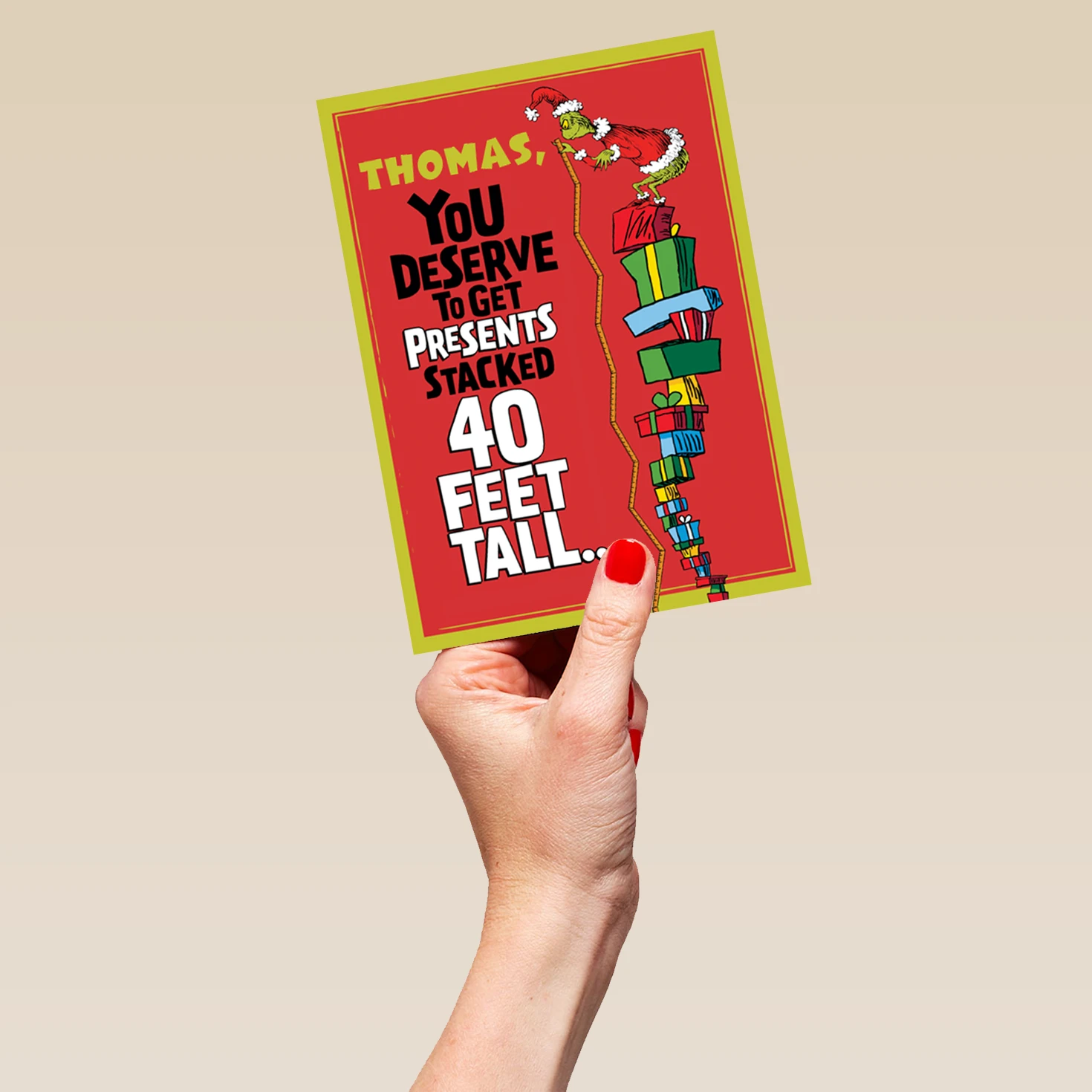 Printed on premium-quality board, this card features The Grinch stood on a pile of presents, with space to personalise a name, and the message ‘You deserve to get presents stacked 40 feet tall…’.