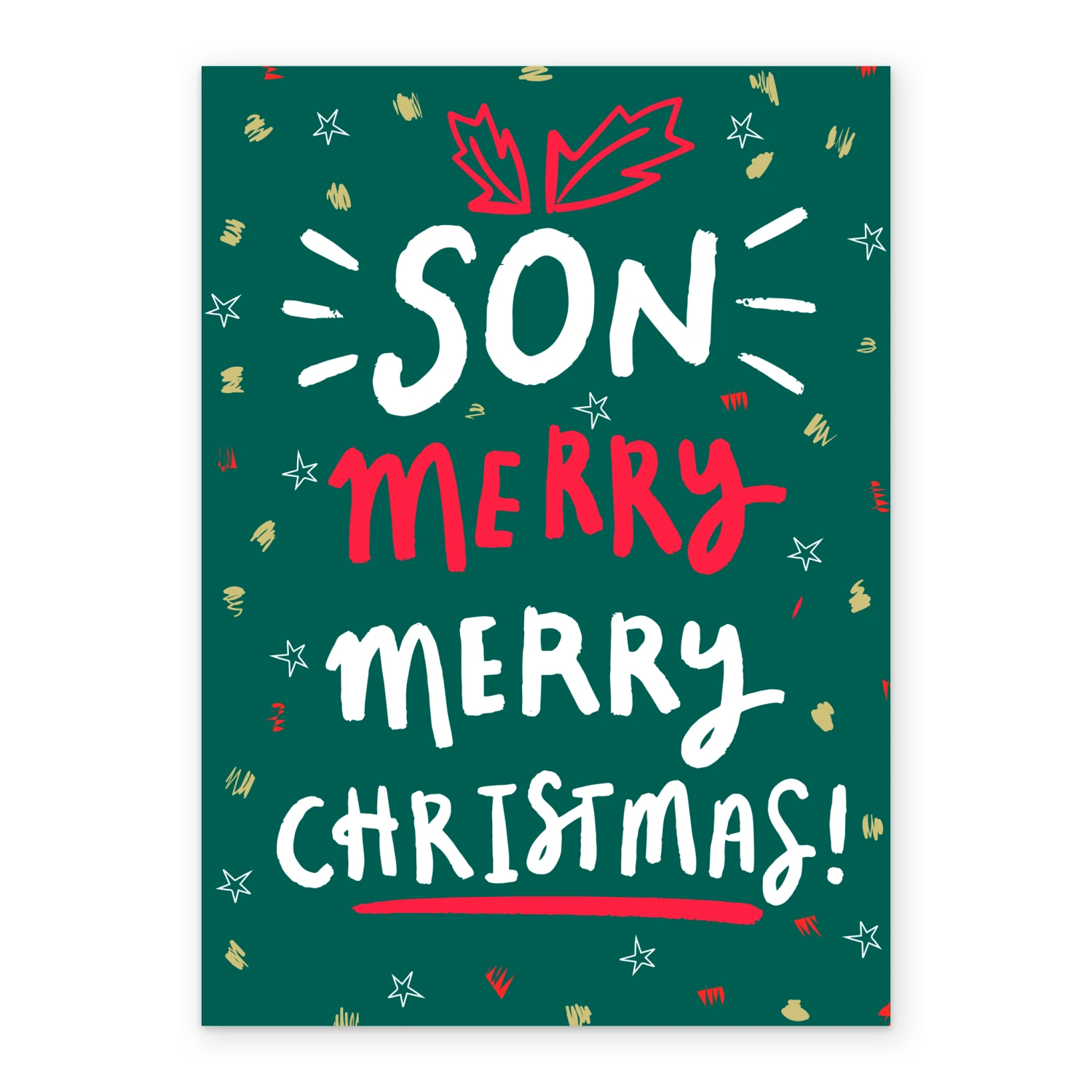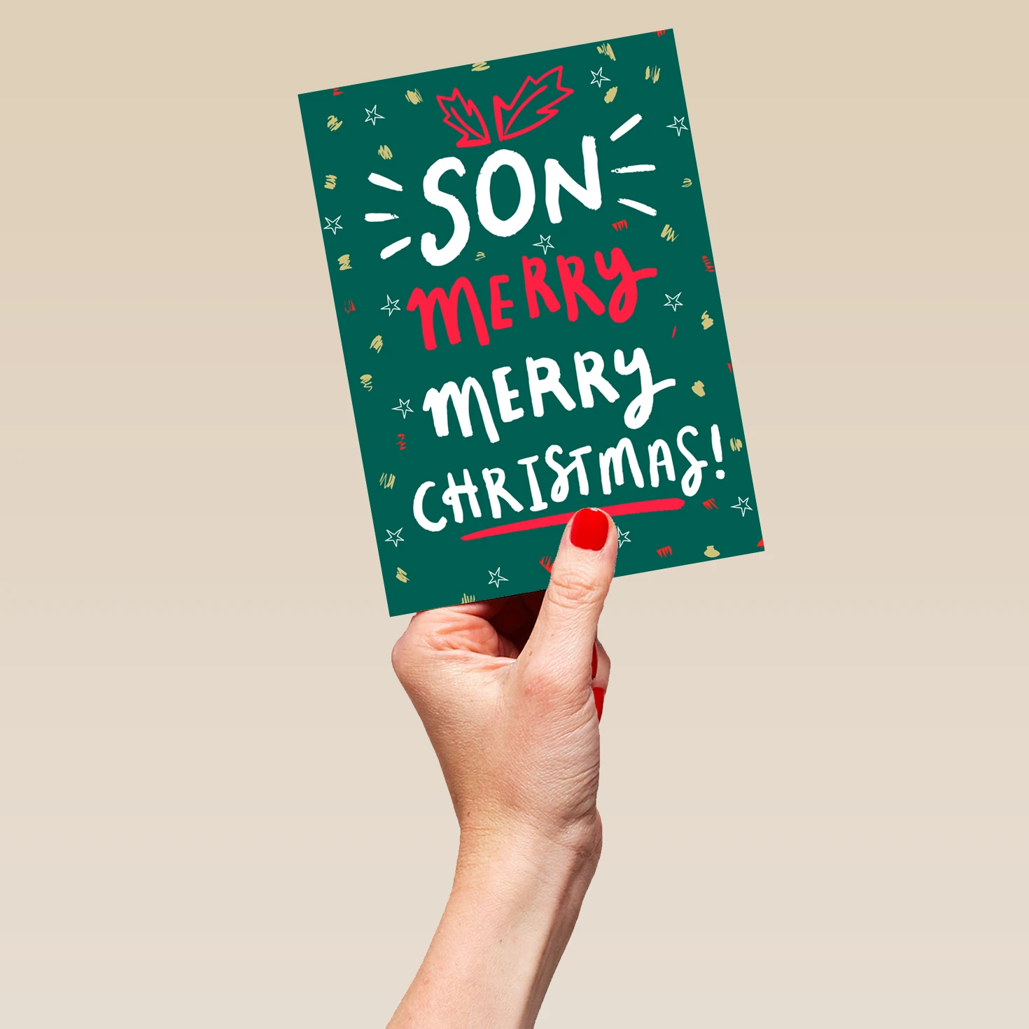 Pod Personalised Gold Red And Green Merry Christmas Son Card