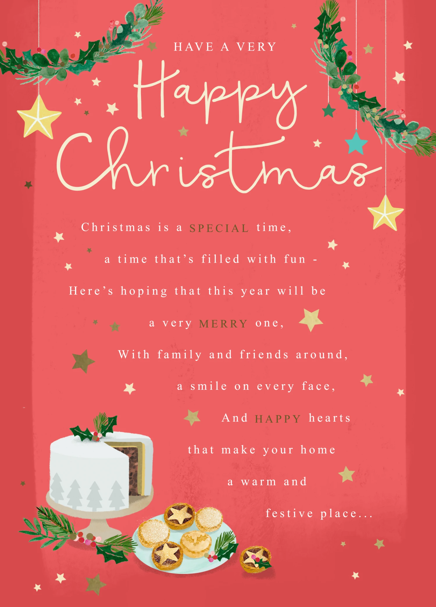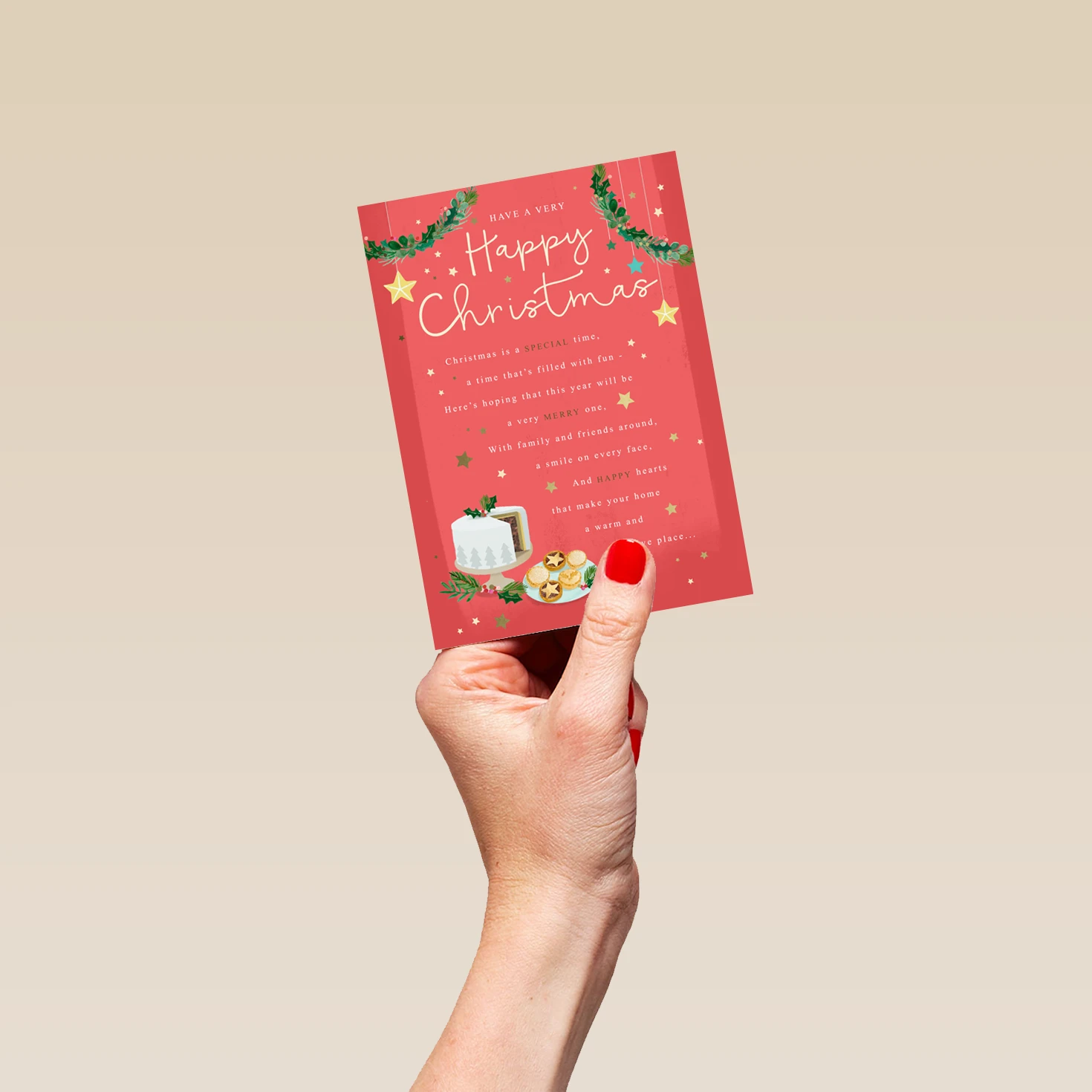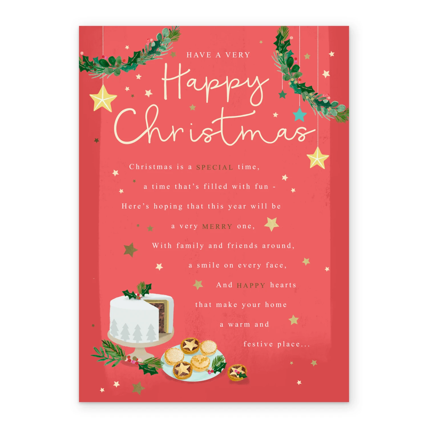 Printed on premium-quality board, this card features Mince pies, a Christmas cake, festive foliage, stars, and a wonderful Christmas verse.