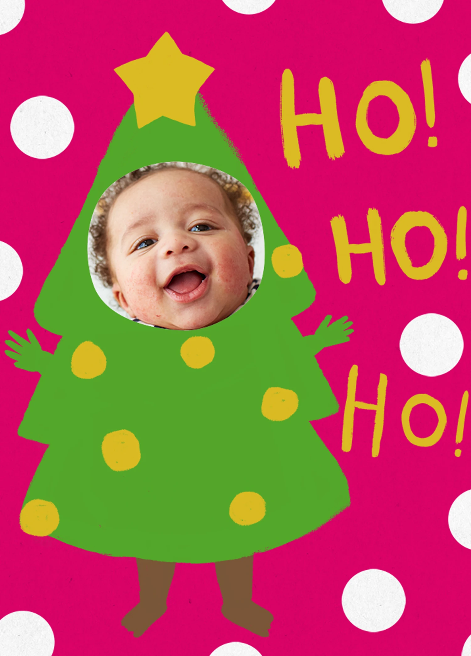 Show them you care with a personalised ho ho ho tree photo Christmas card from Hallmark. Our greetings cards are printed on premium quality, FSC®-certified card & delivered nationwide. This card is available as standard 12cm by 16.7cm and large 15.5cm by 21.6cm.