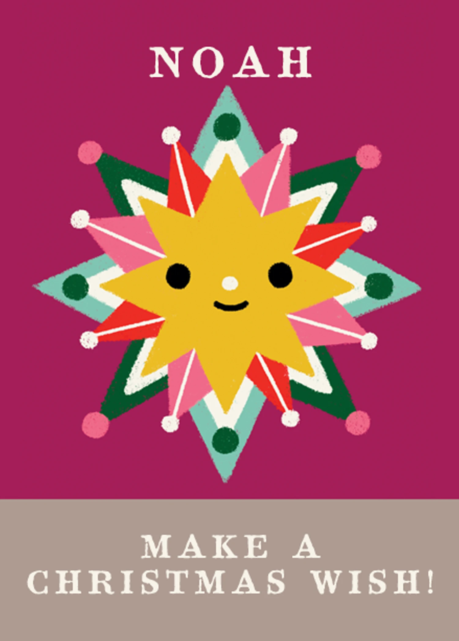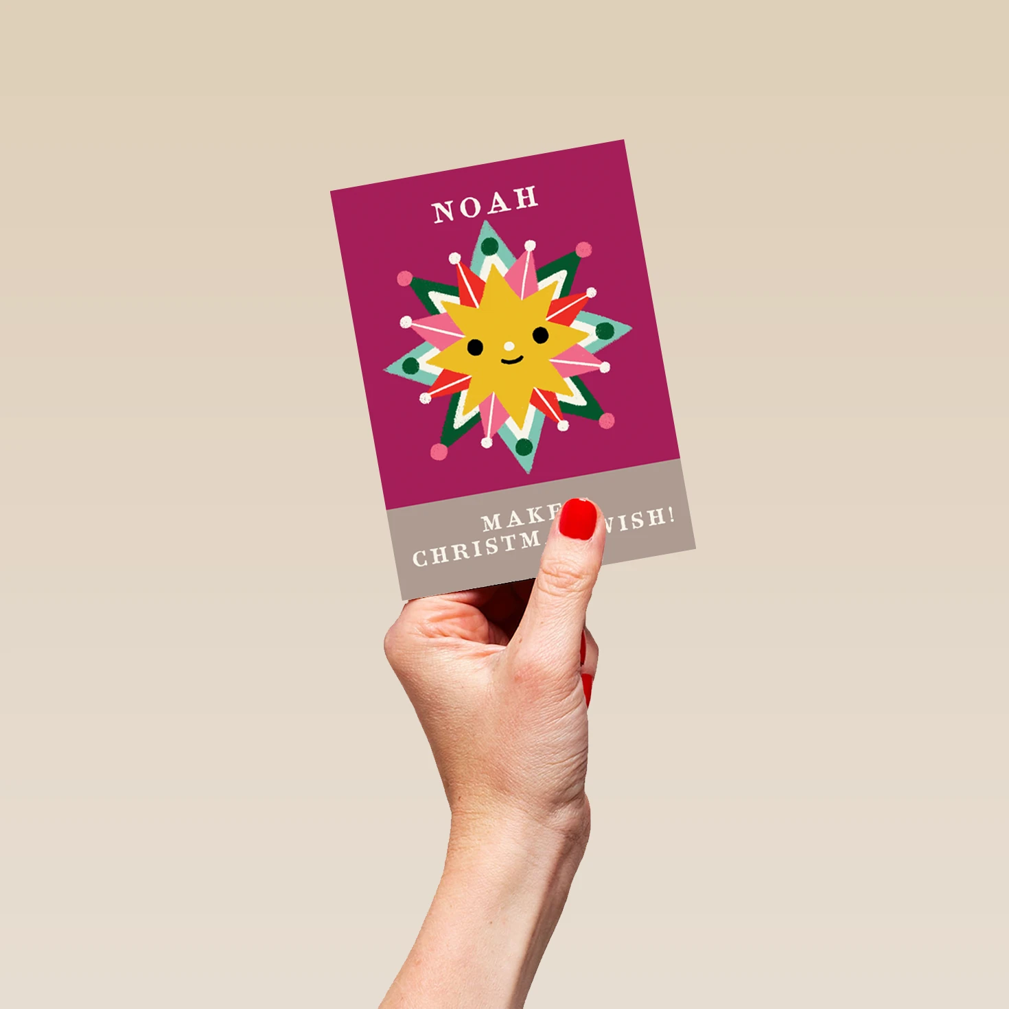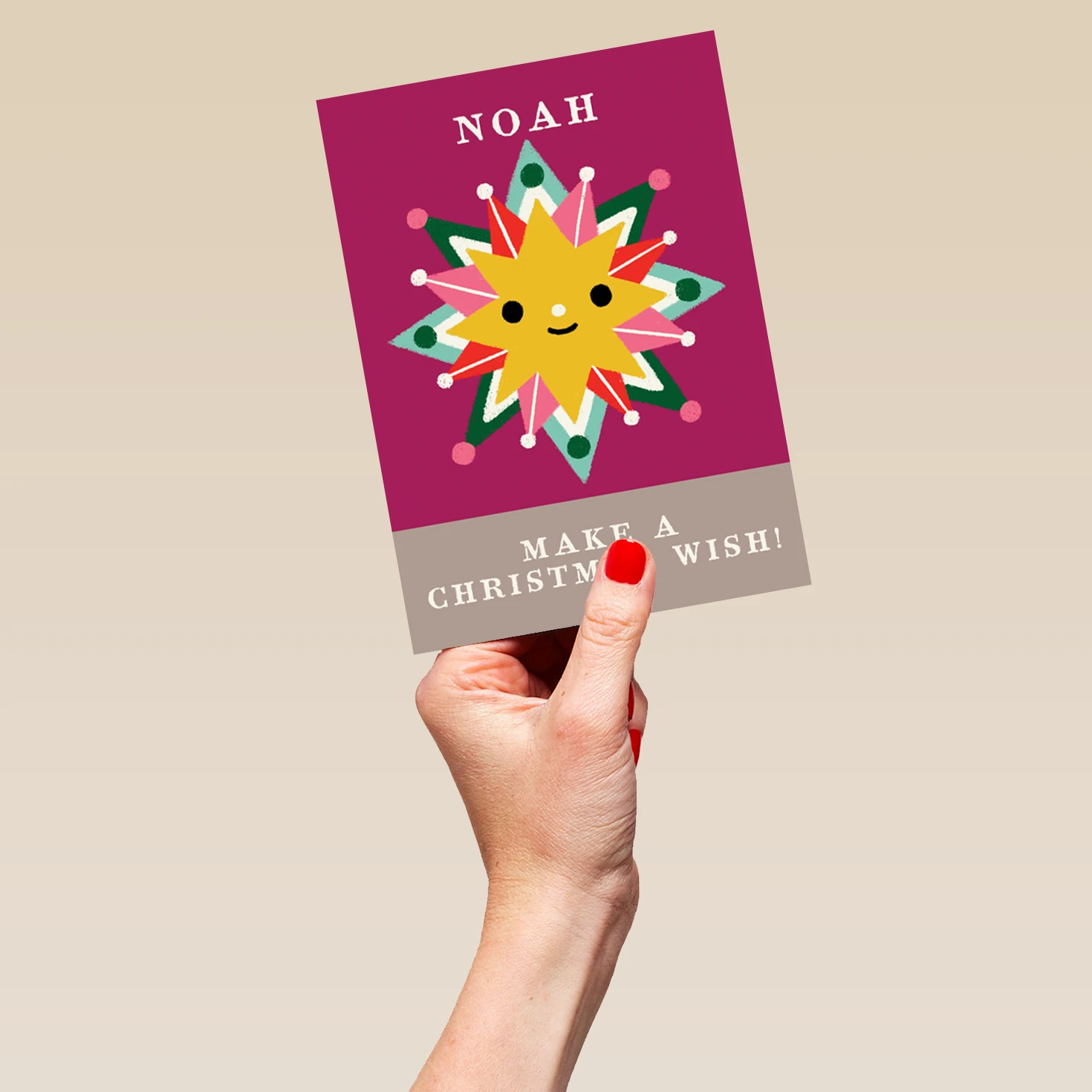 Show them you care with a personalised kids Christmas editable cute star face card from Hallmark. Our greetings cards are printed on premium quality, FSC®-certified card & delivered nationwide. This card is available as standard 12cm by 16.7cm and large 15.5cm by 21.6cm.