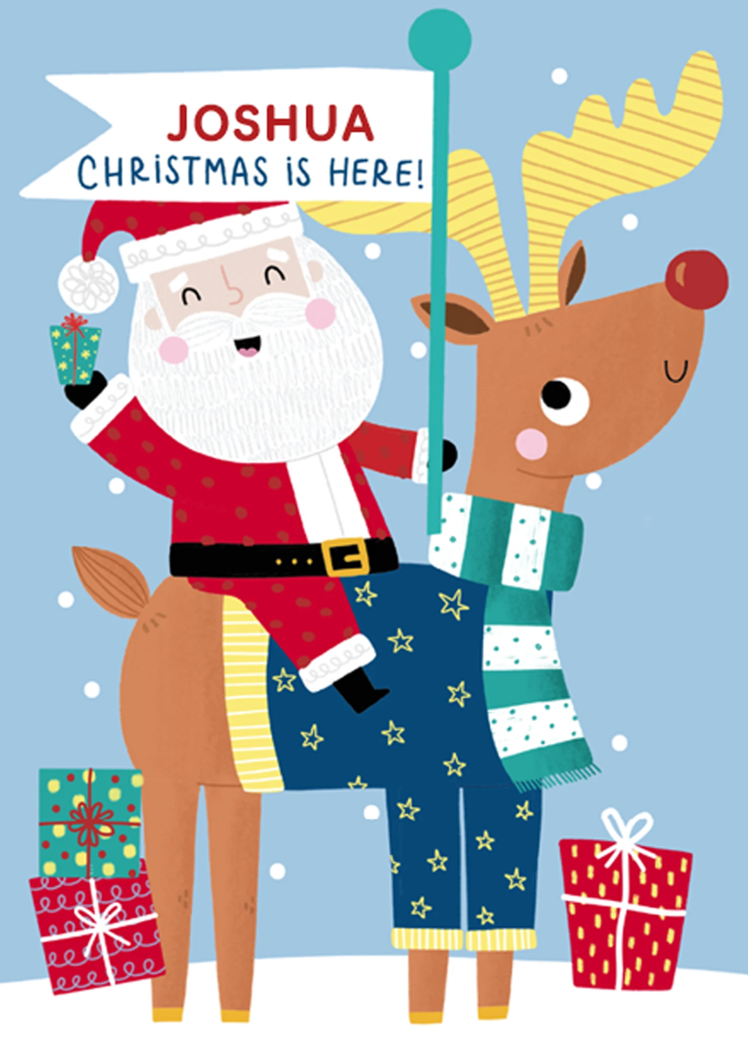 Show them you care with a personalised kids Christmas editable Santa reindeer flag card from Hallmark. Our greetings cards are printed on premium quality, FSC®-certified card & delivered nationwide. This card is available as standard 12cm by 16.7cm and large 15.5cm by 21.6cm.