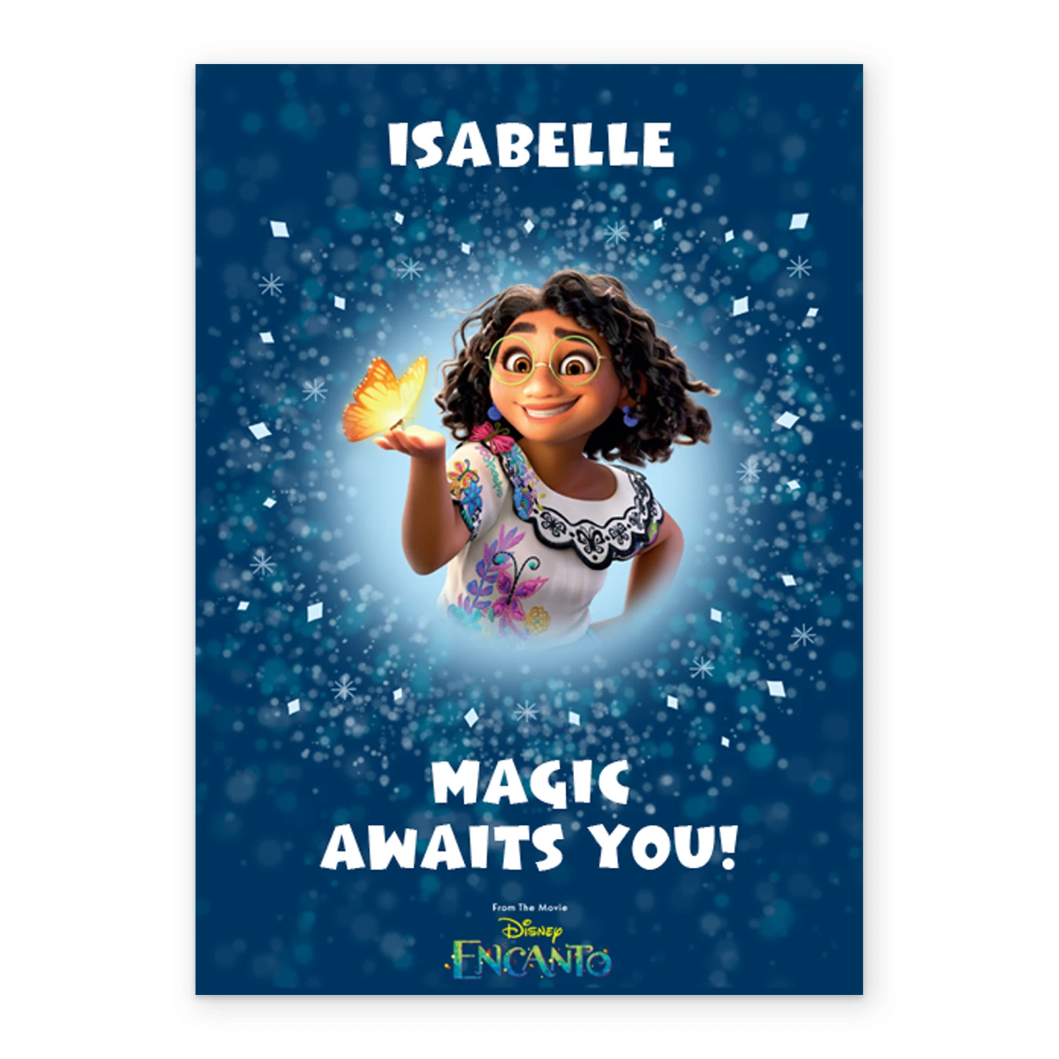 Printed on premium-quality board, this card features Encanto’s Mirabel Madrigal, with space to personalise a name and the message ‘Magic awaits you!’, and comes complete with a co-ordinating white envelope.