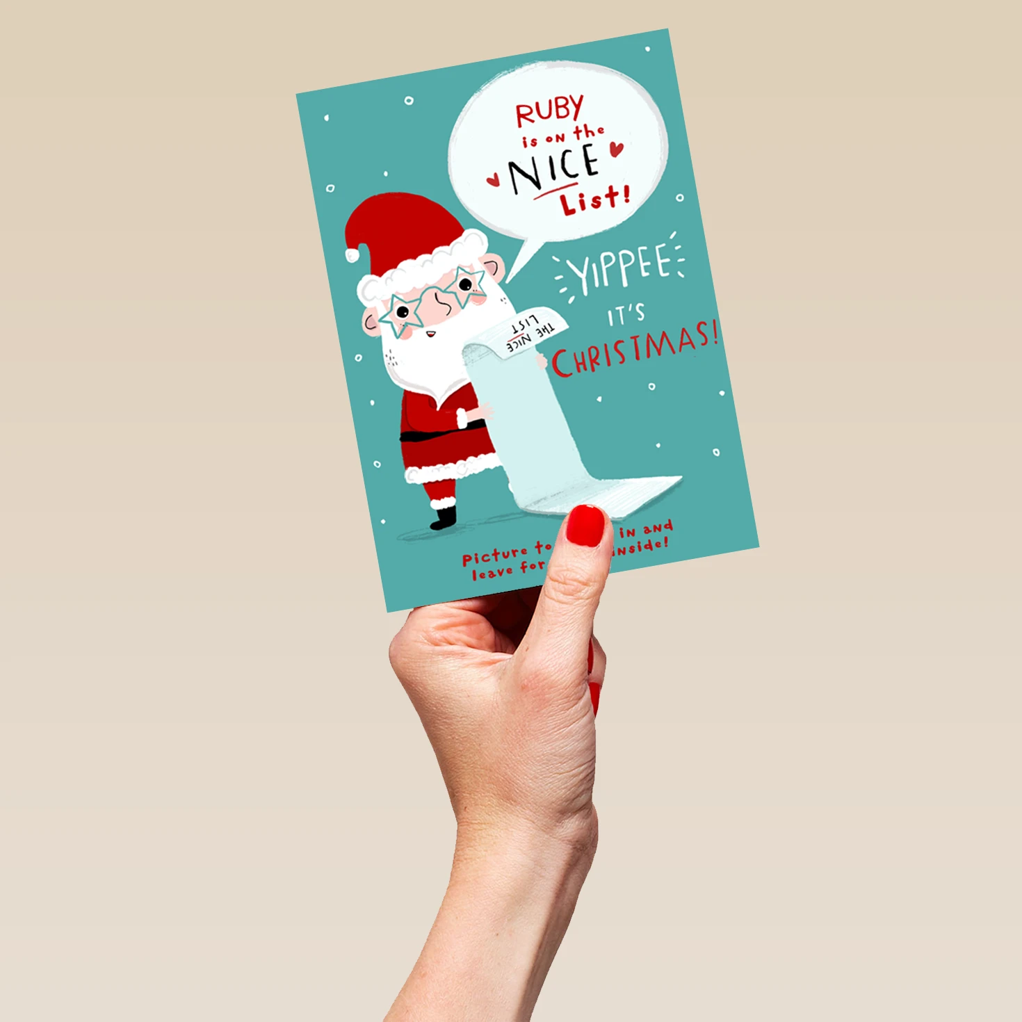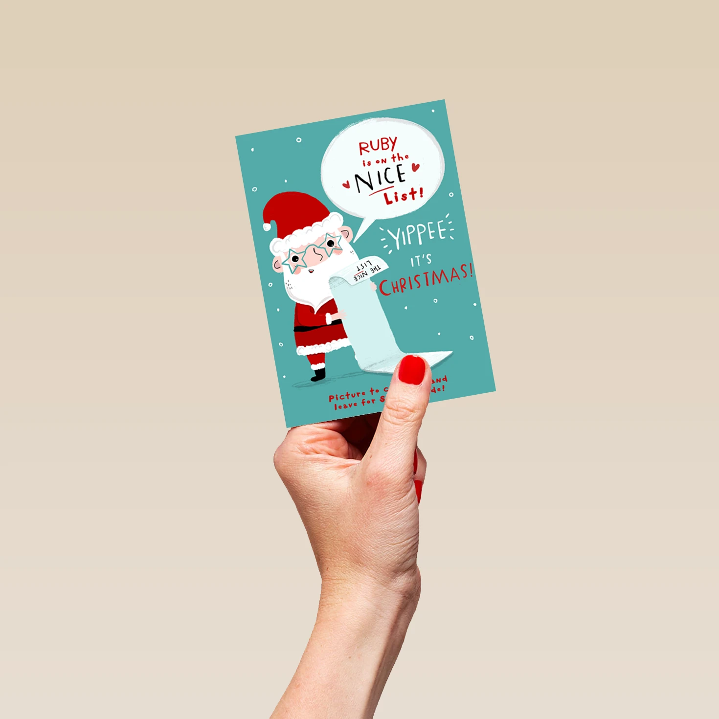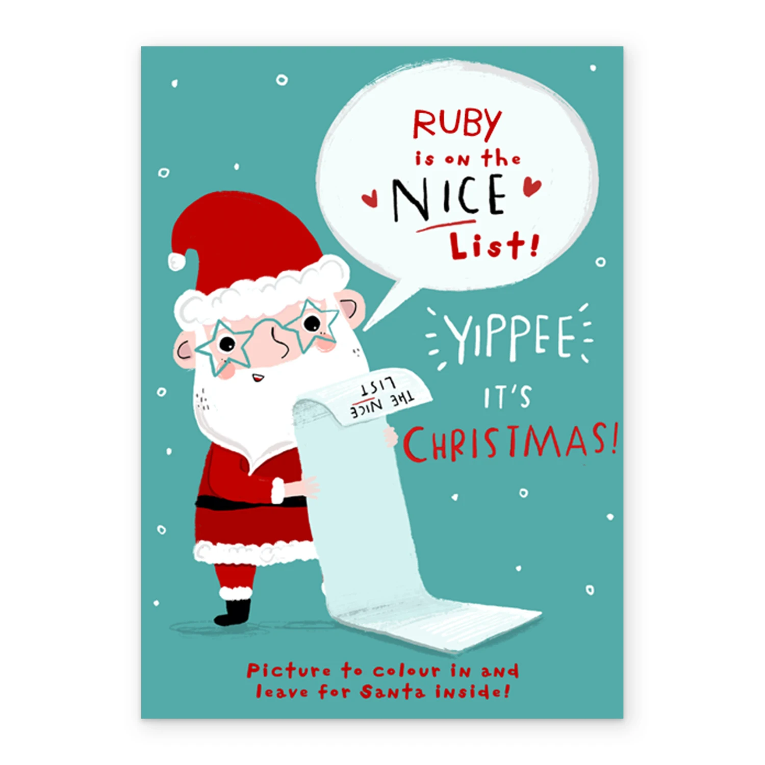 Show them you care with a personalised kids to Santa colour in activity Christmas card from Hallmark. Our greetings cards are printed on premium quality, FSC®-certified card & delivered nationwide. This card is available as standard 12cm by 16.7cm and large 15.5cm by 21.6cm.