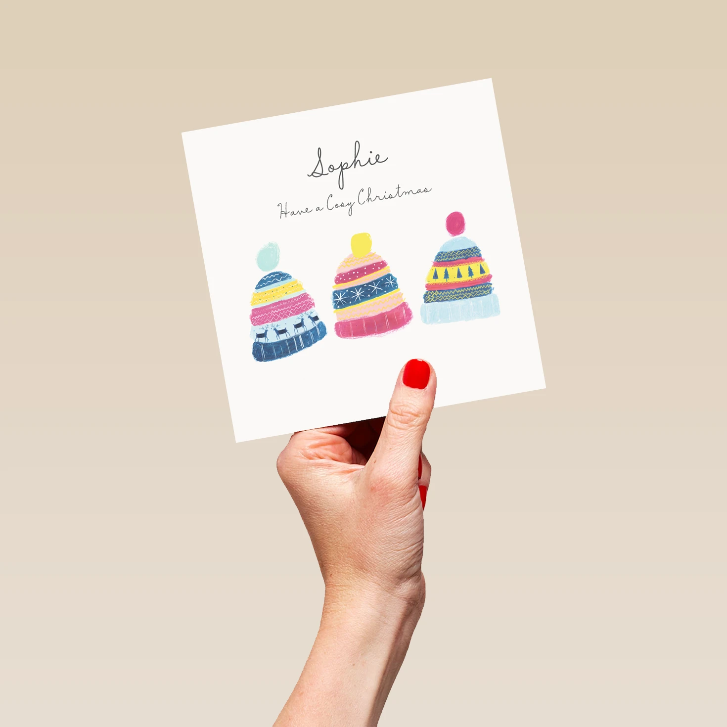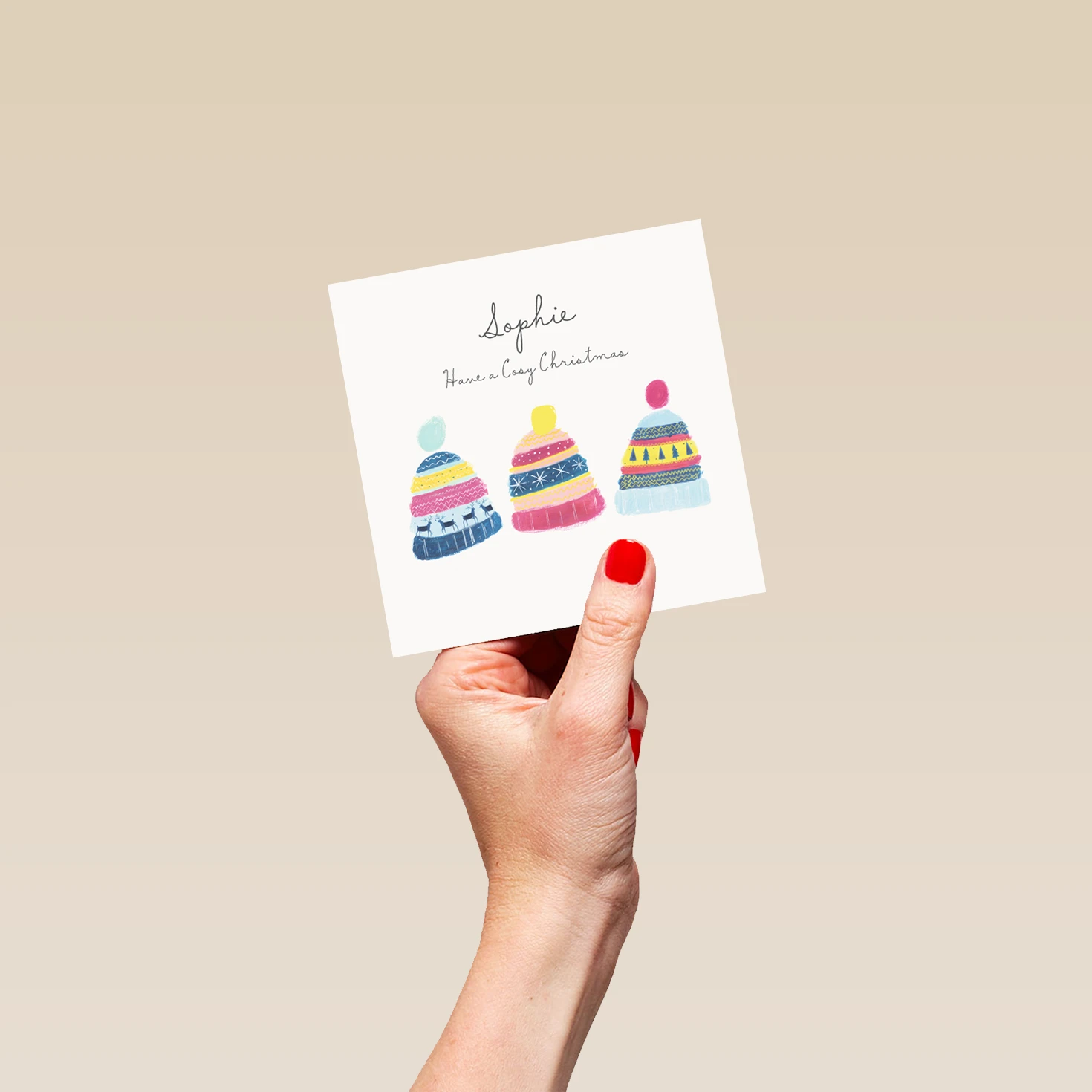 Show them you care with a personalised modern woolly hats Christmas card from Hallmark. Our greetings cards are printed on premium quality, FSC®-certified card & delivered nationwide. This card is available as standard 12cm by 12cm and large 15cm by 15cm.