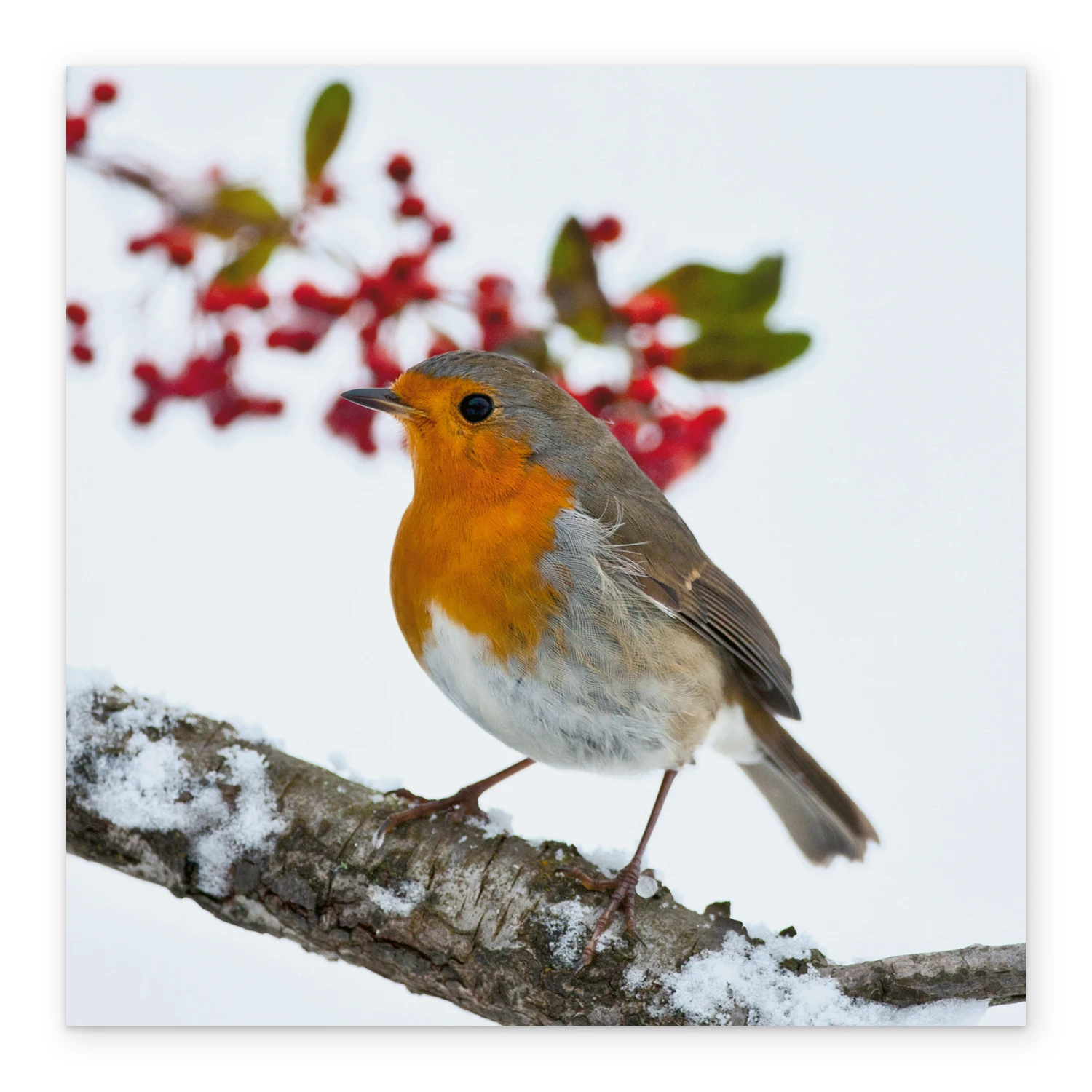 Printed on premium-quality board, this card features a robin on a snowy branch, and comes complete with a co-ordinating white envelope.