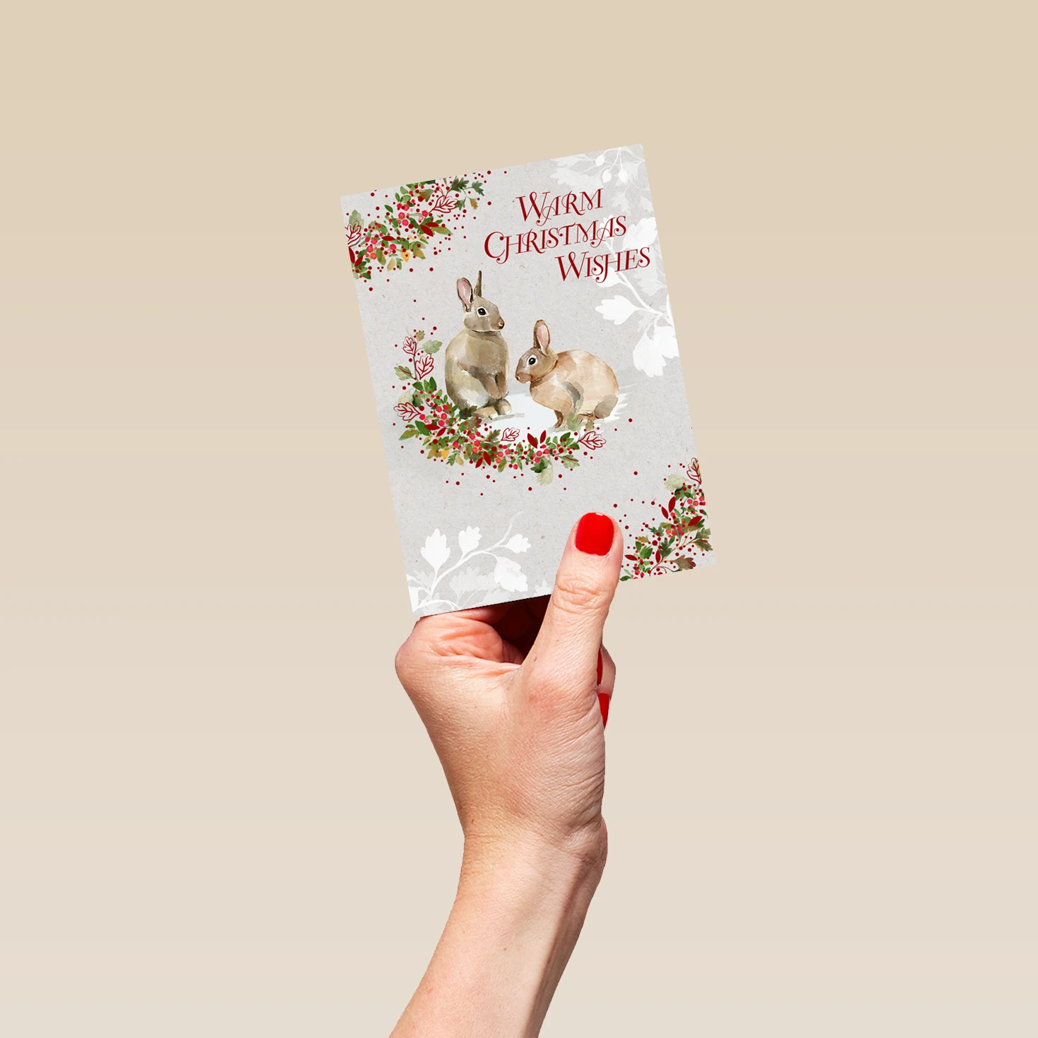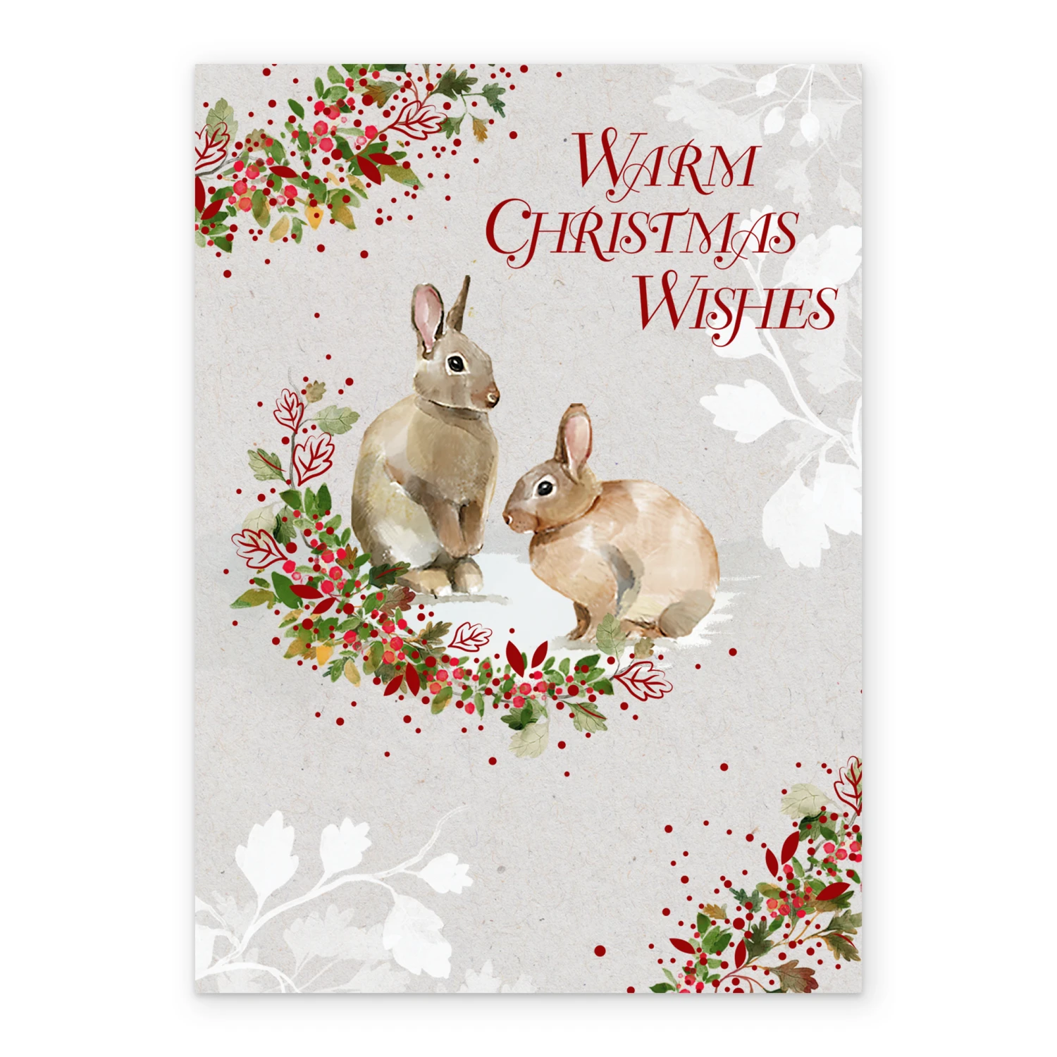 Printed on premium-quality board, this card features a seasonal wreath with a couple of rabbits illustration, and the message ‘Warm Christmas Wishes’.