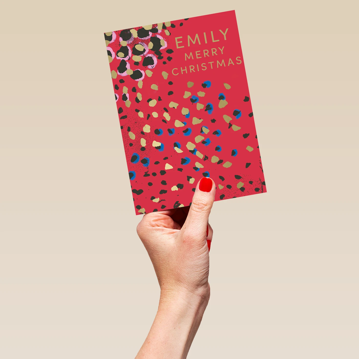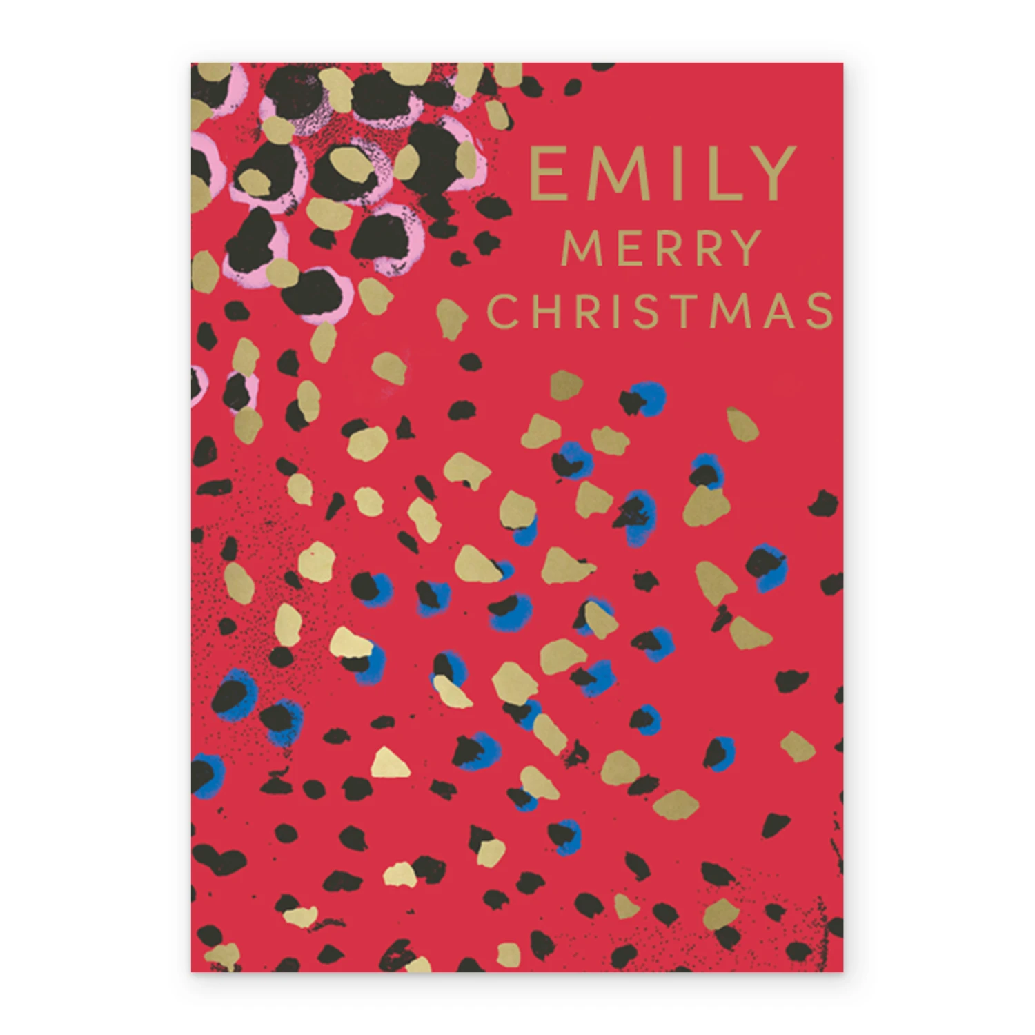 Printed on premium-quality board, this card features a red background, a leopard print inspired pattern, with space to personalise a name, and comes complete with a co-ordinating white envelope.