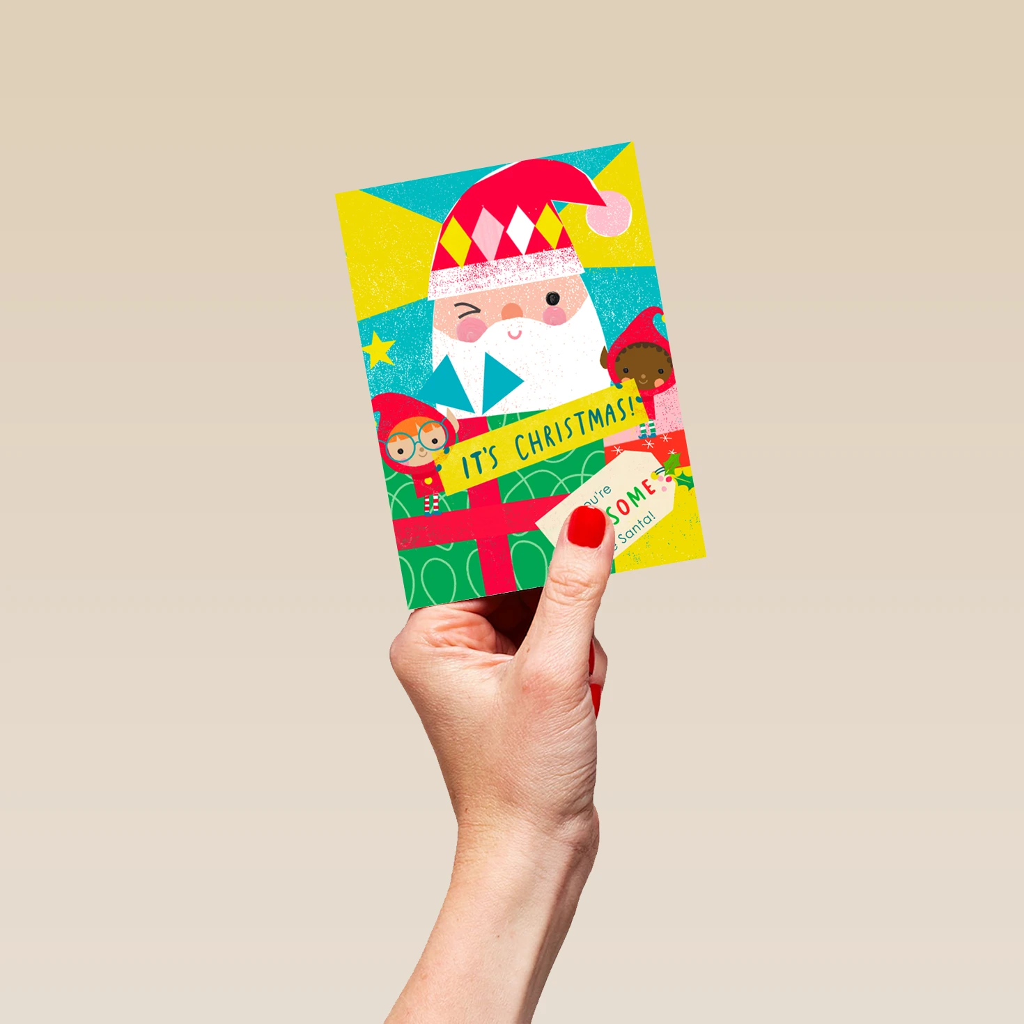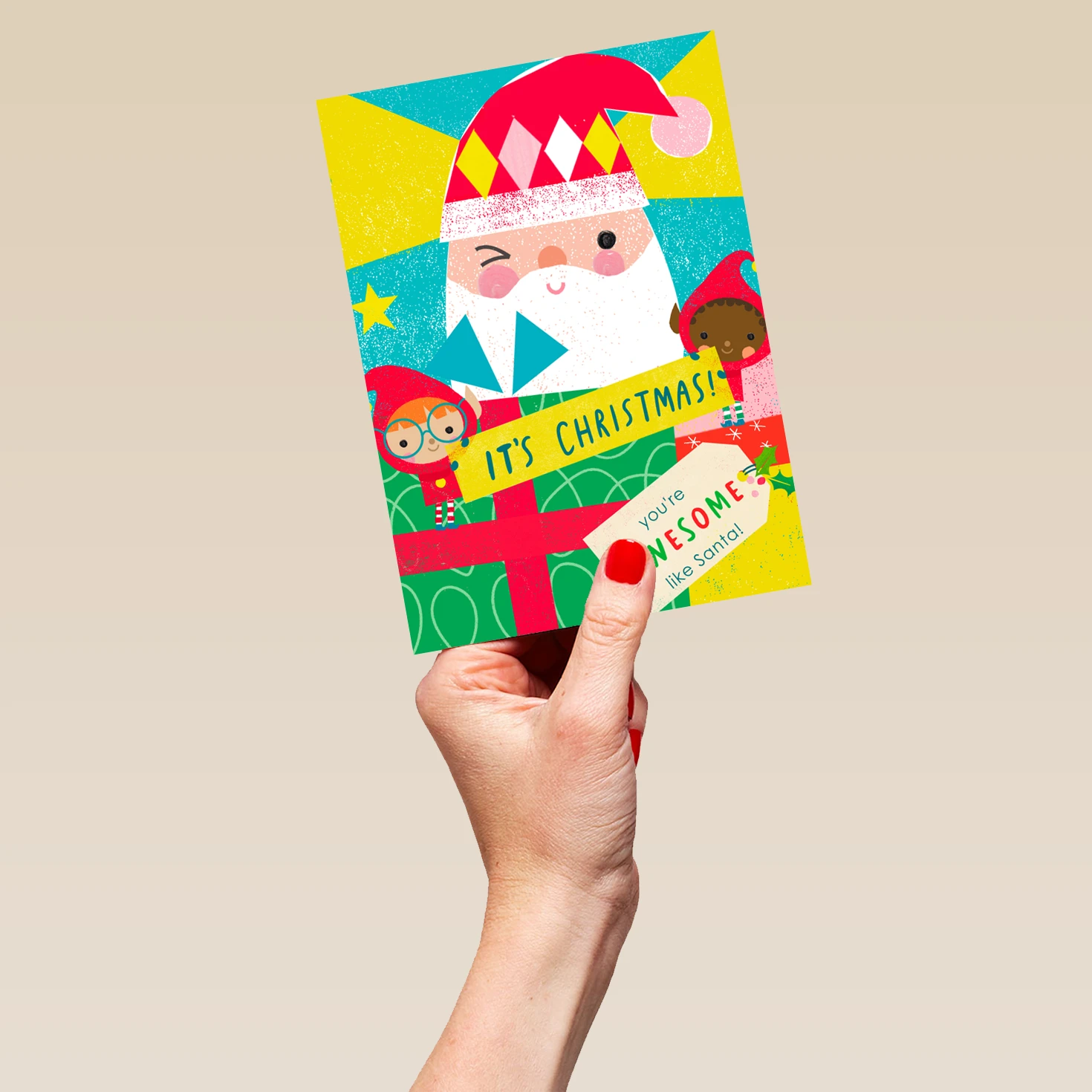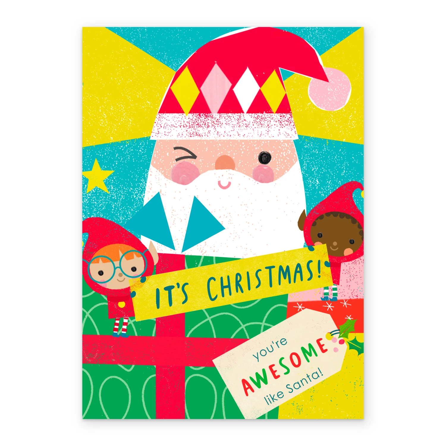 Show them you care with a personalised Santa awesome elf card from Hallmark. Our Christmas cards are printed on premium quality, FSC®-certified card & delivered nationwide. This card is available as standard 12cm by 16.7cm and large 15.5cm by 21.6cm.