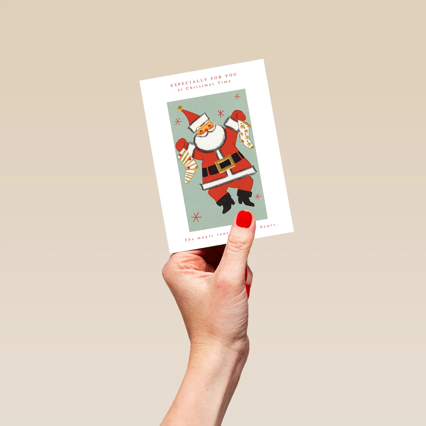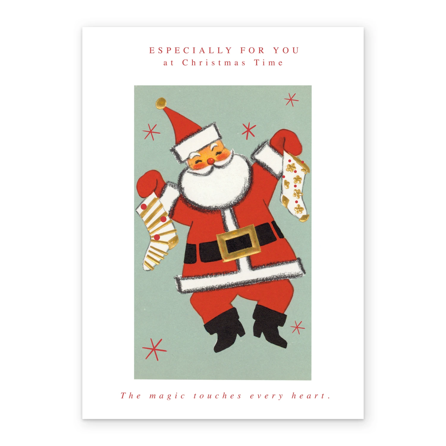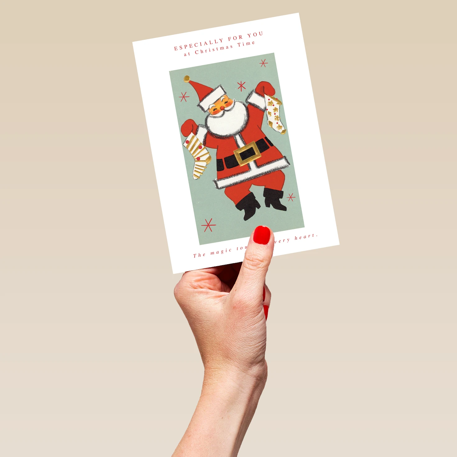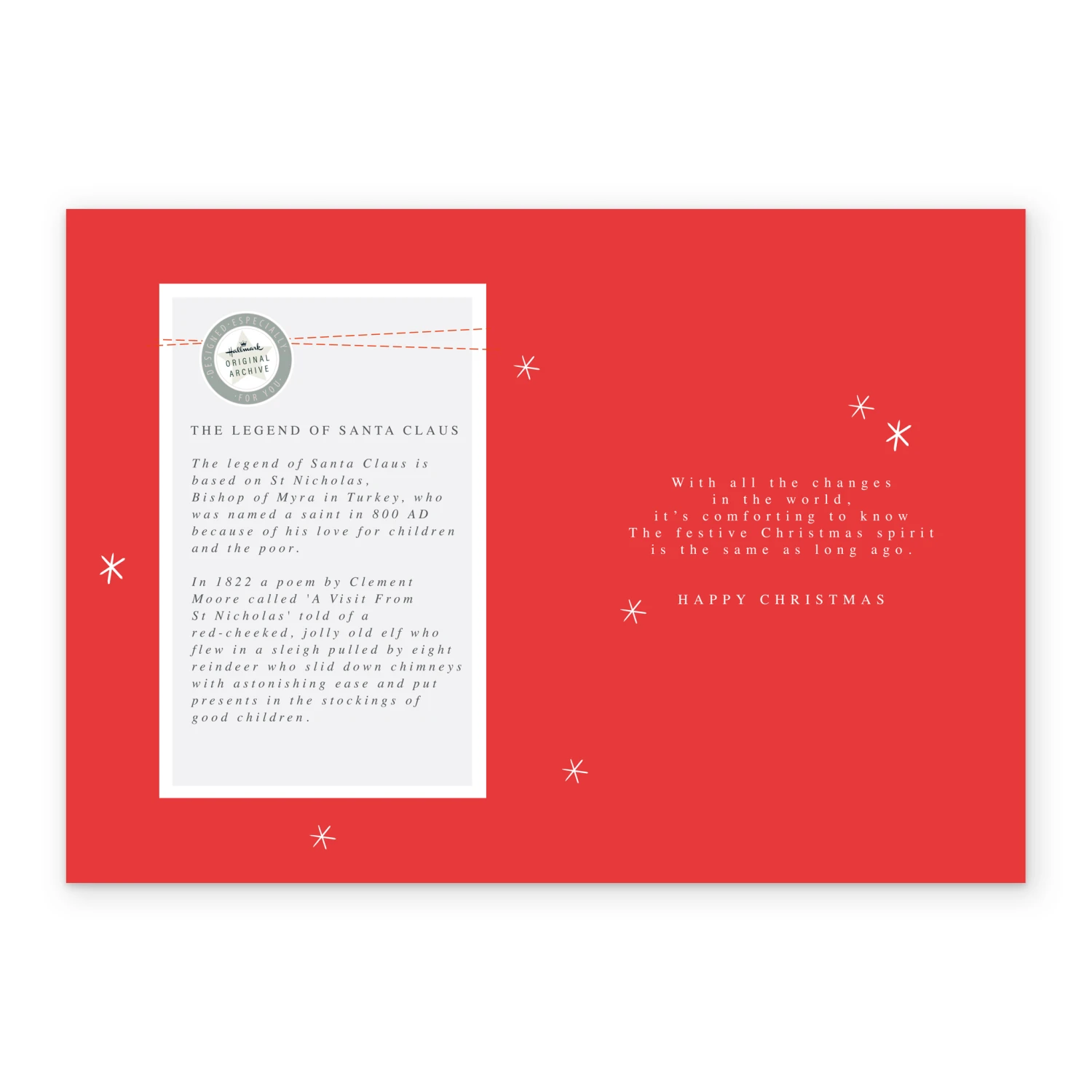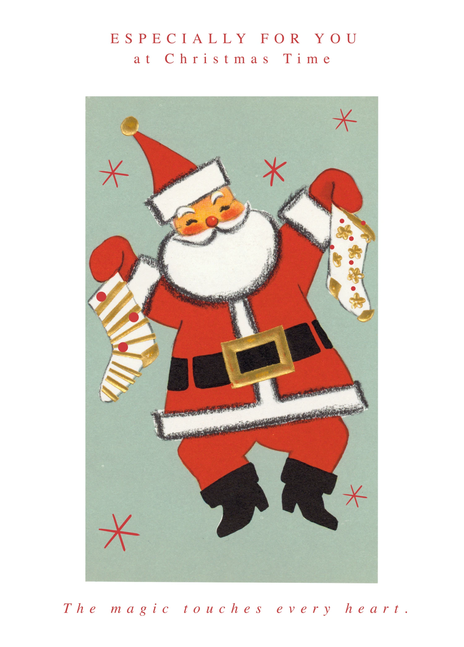 Printed on premium-quality board, this card features a sweet Santa illustration holding two Christmas stocking, and a postcard-styled history of St. Nicholas on the inside.