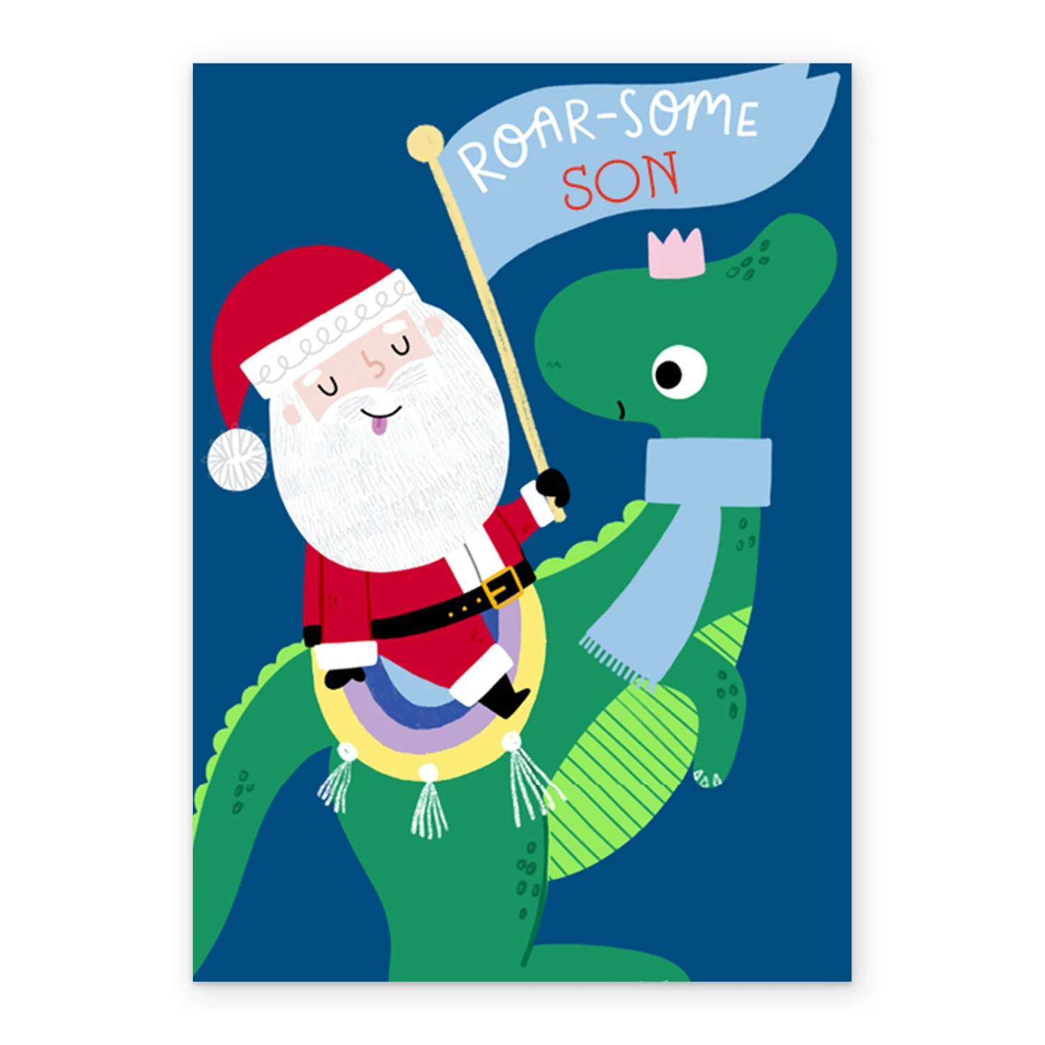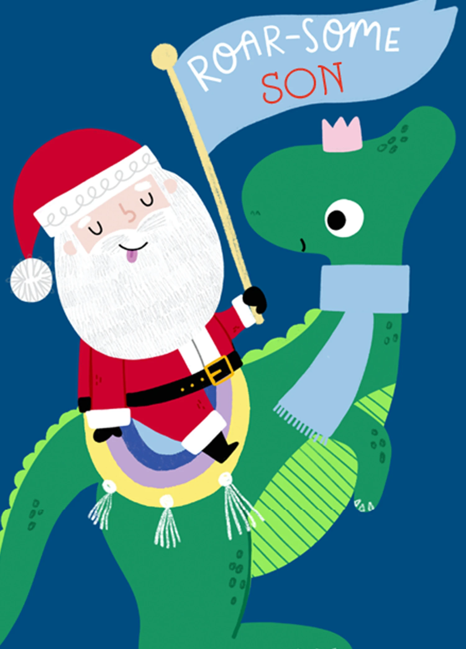 Show them you care with a personalised son Santa and T-rex Christmas card from Hallmark. Our greetings cards are printed on premium quality, FSC®-certified card & delivered nationwide. This card is available as standard 12cm by 16.7cm and large 15.5cm by 21.6cm.