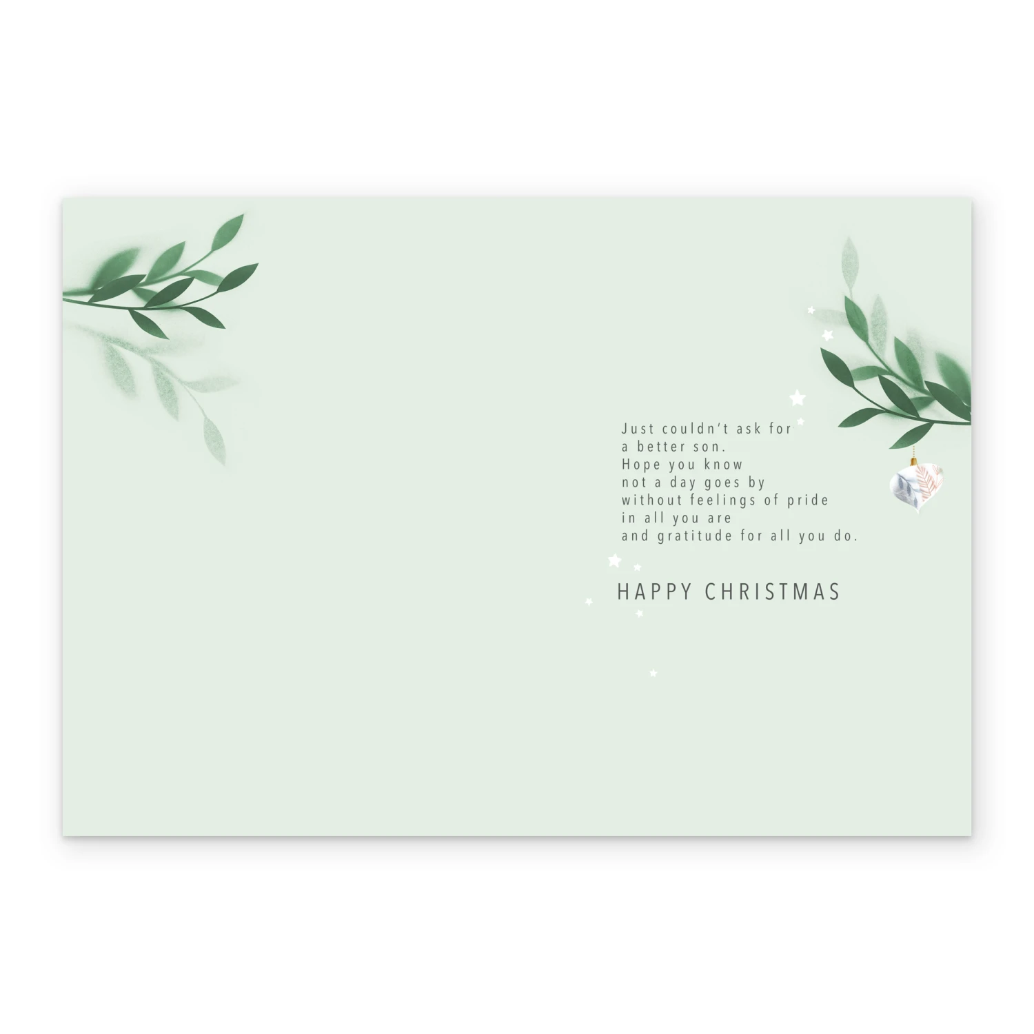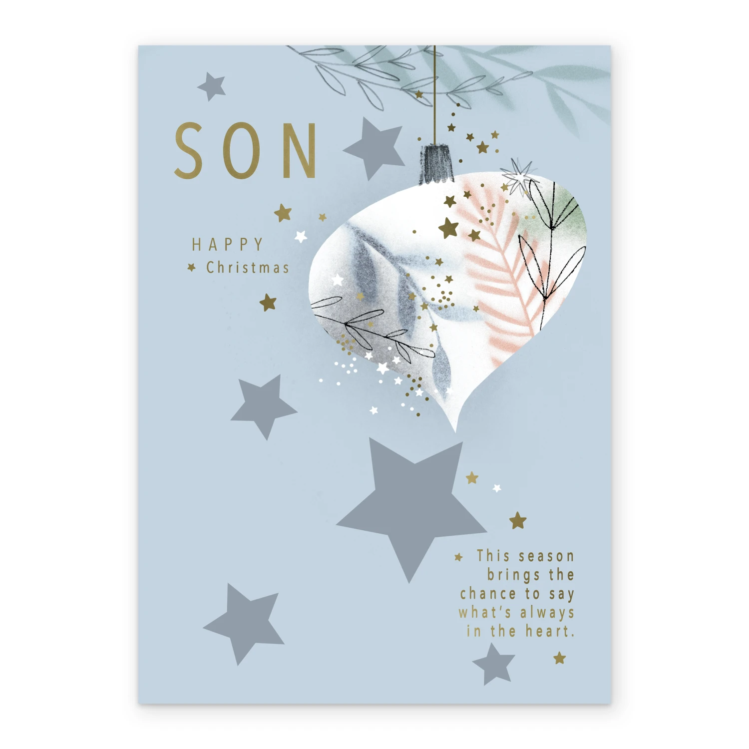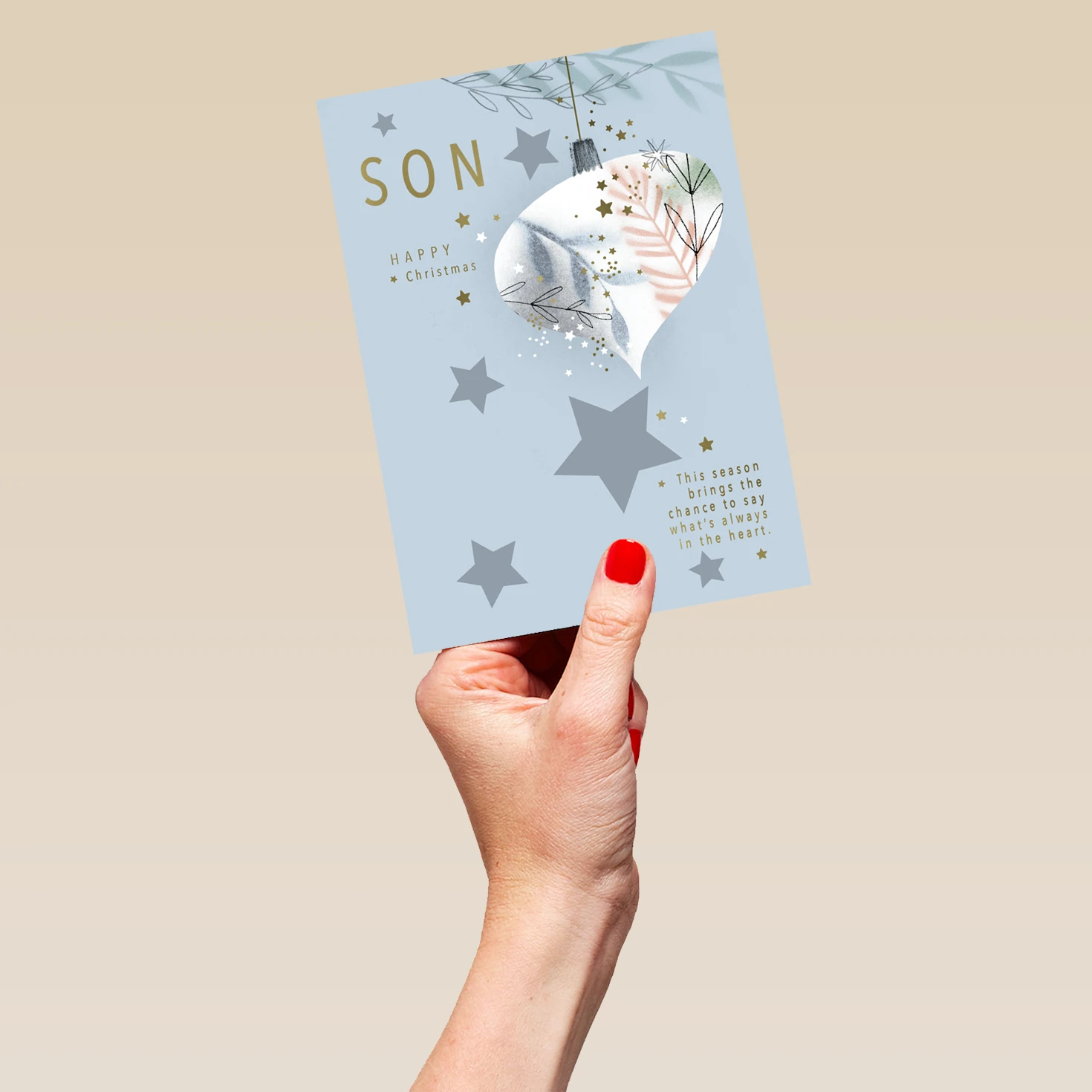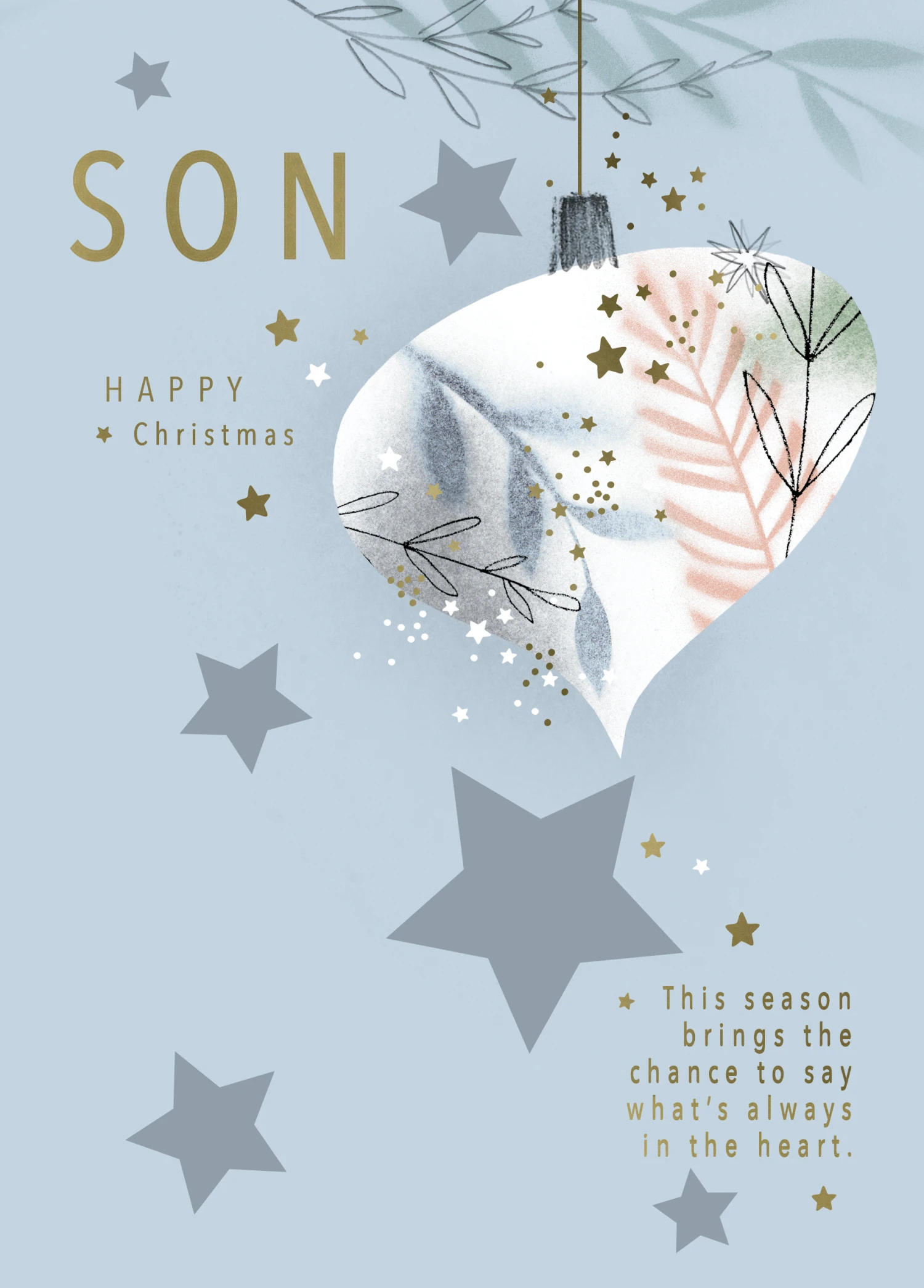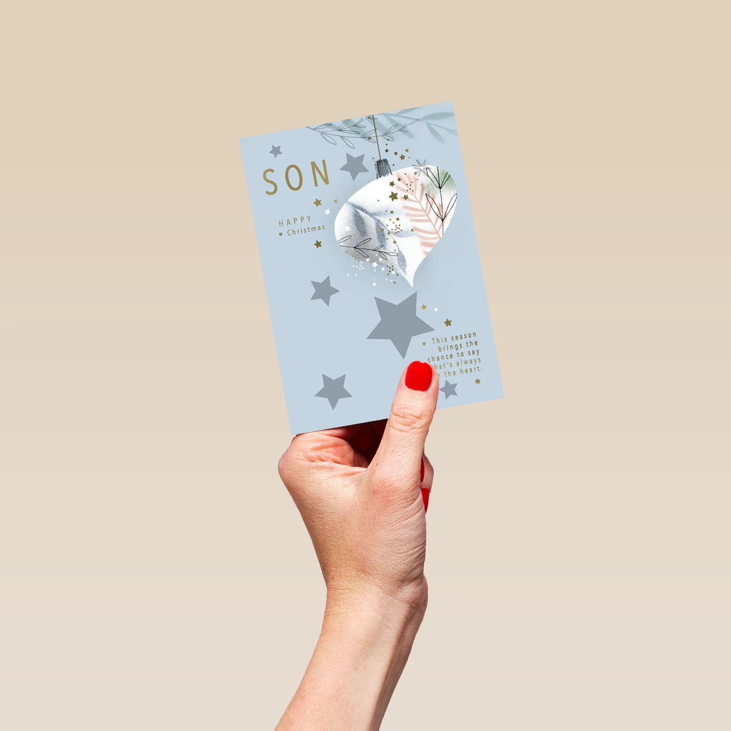 Show them you care with a personalised son star and bauble Christmas card from Hallmark. Our greetings cards are printed on premium quality, FSC®-certified card & delivered nationwide. This card is available as standard 12cm by 16.7cm and large 15.5cm by 21.6cm.