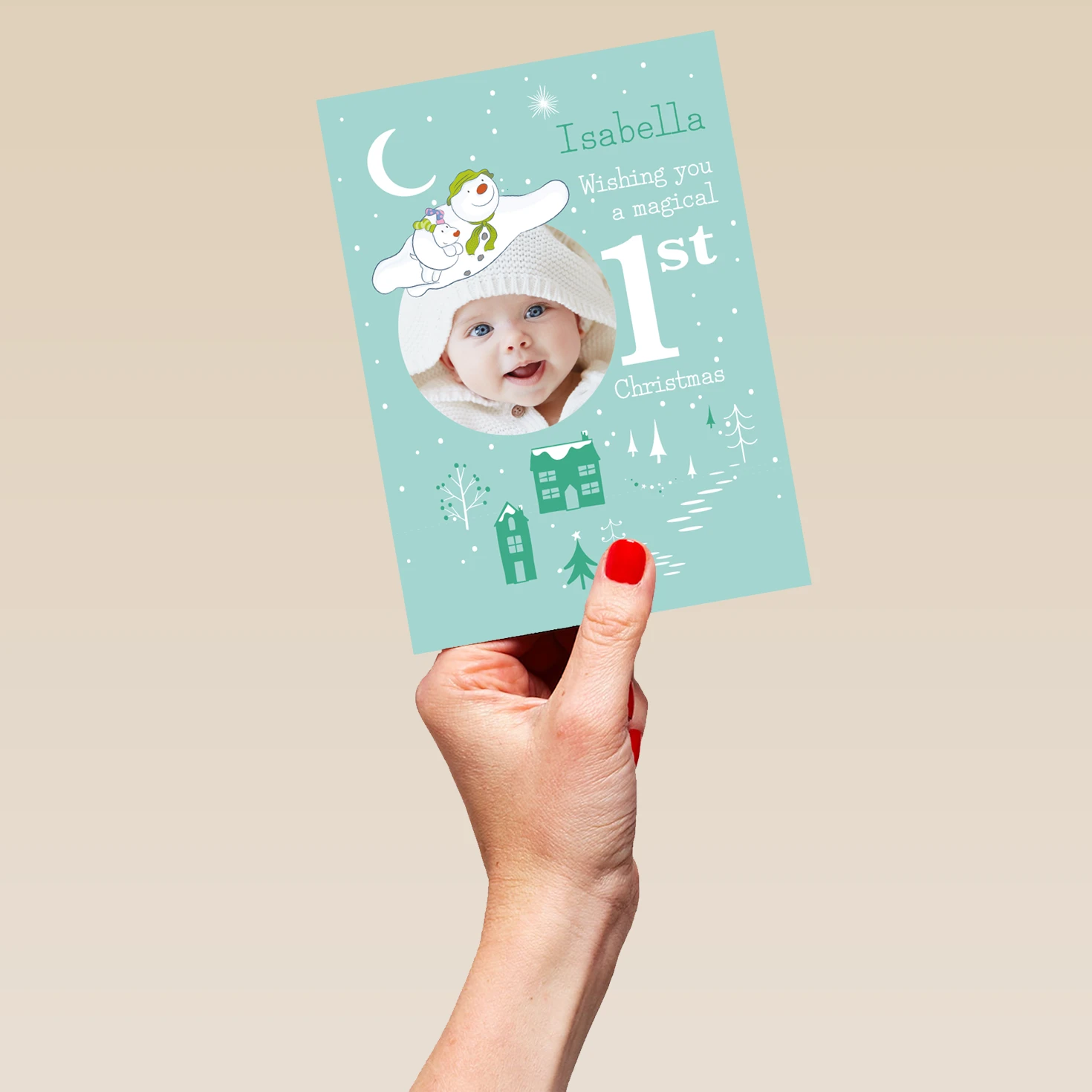 Share a wonderful first Christmas time with the iconic The Snowman™, with this sweet personalised and photo upload 1st Christmas card.