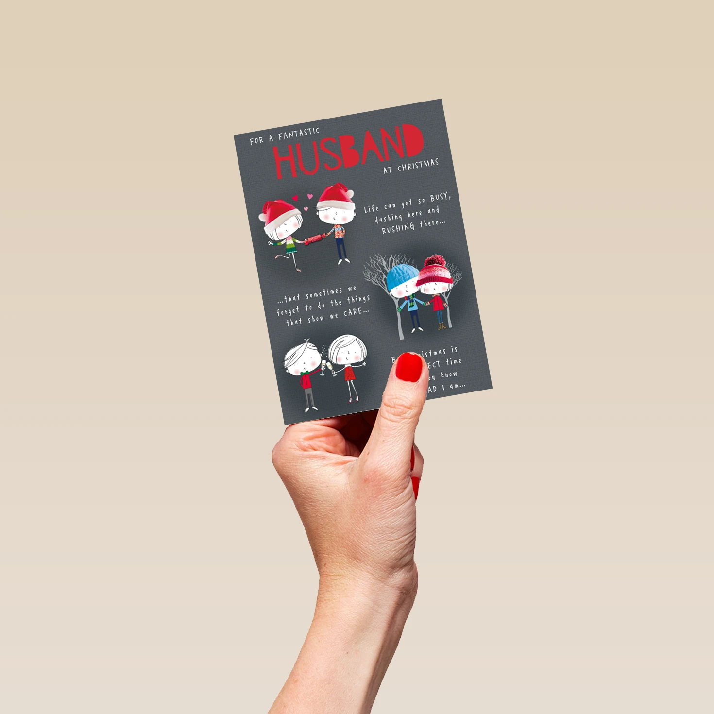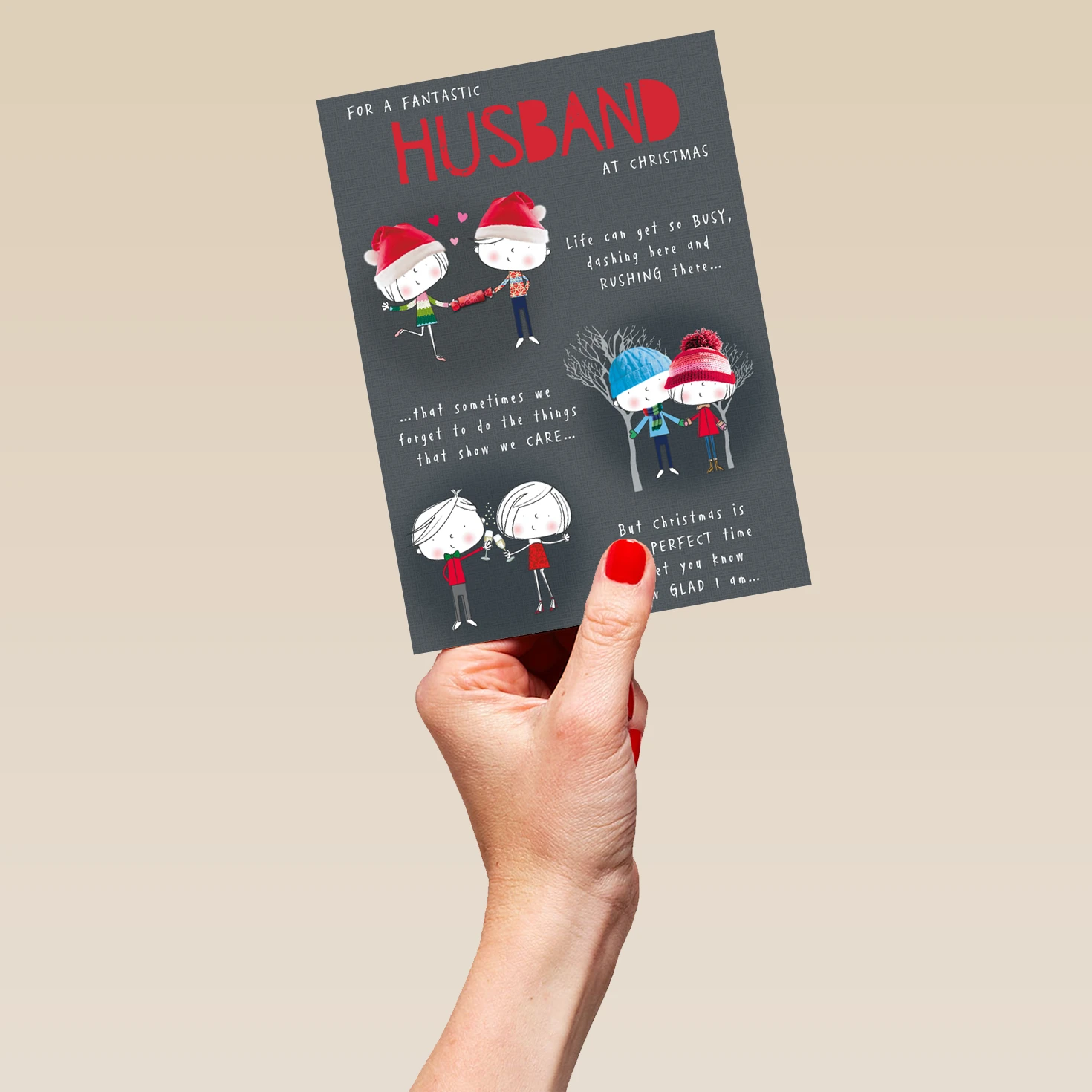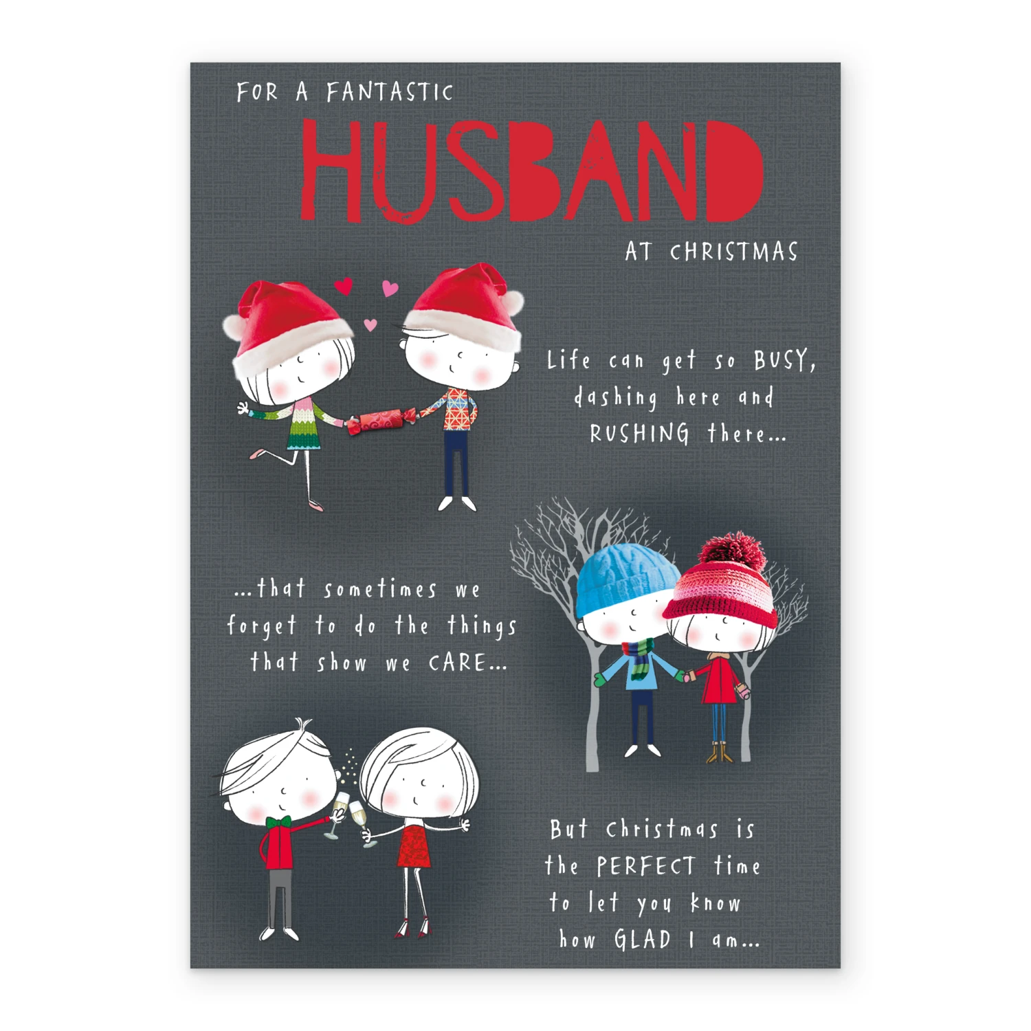 Show them you care with a personalised to a fantastic husband card from Hallmark. Our Christmas cards are printed on premium quality, FSC®-certified card & delivered nationwide. This card is available as standard 12cm by 16.7cm and large 15.5cm by 21.6cm.