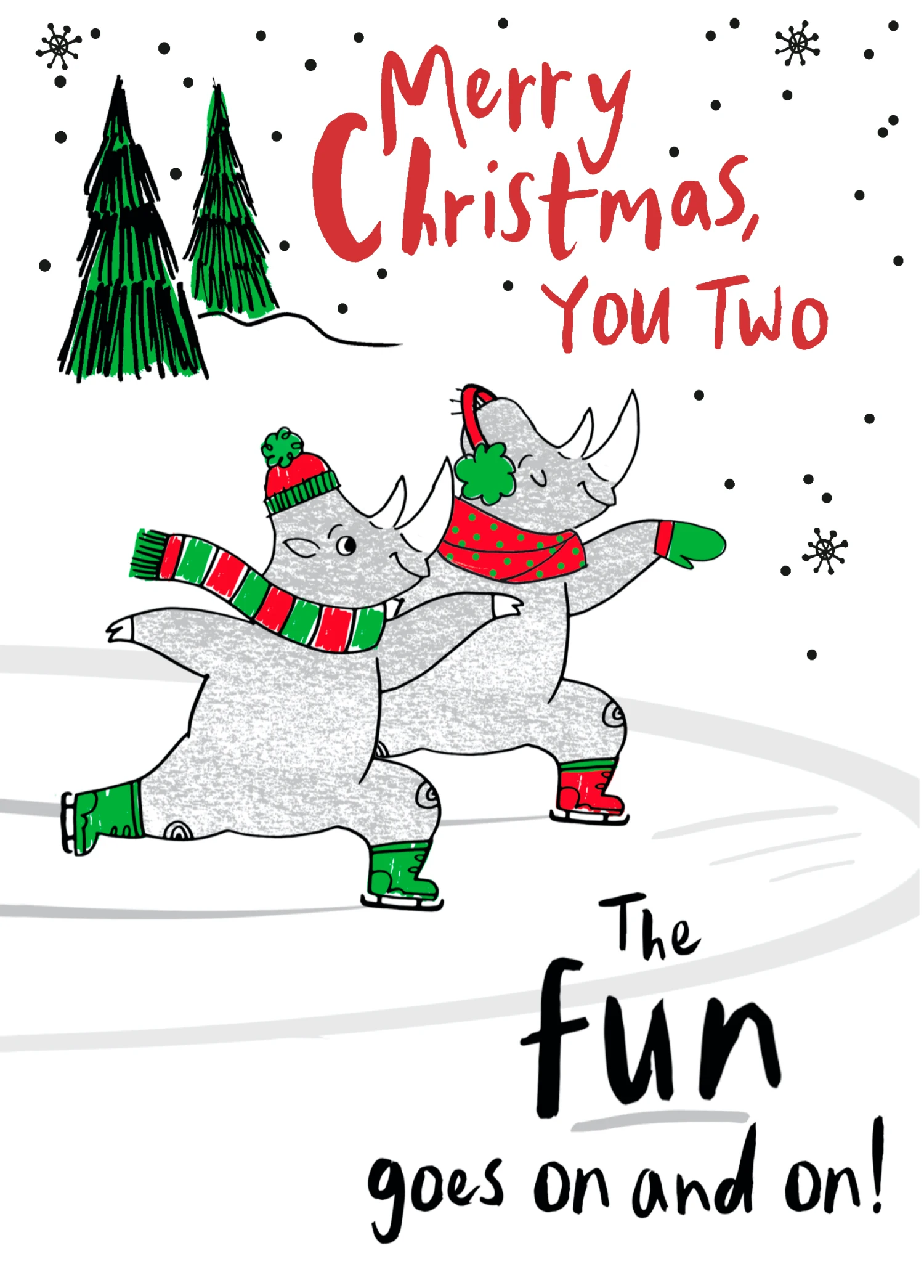 Show them you care with a personalised to both merry ice skating card from Hallmark. Our Christmas cards are printed on premium quality, FSC®-certified card & delivered nationwide. This card is available as standard 12cm by 16.7cm and large 15.5cm by 21.6cm.