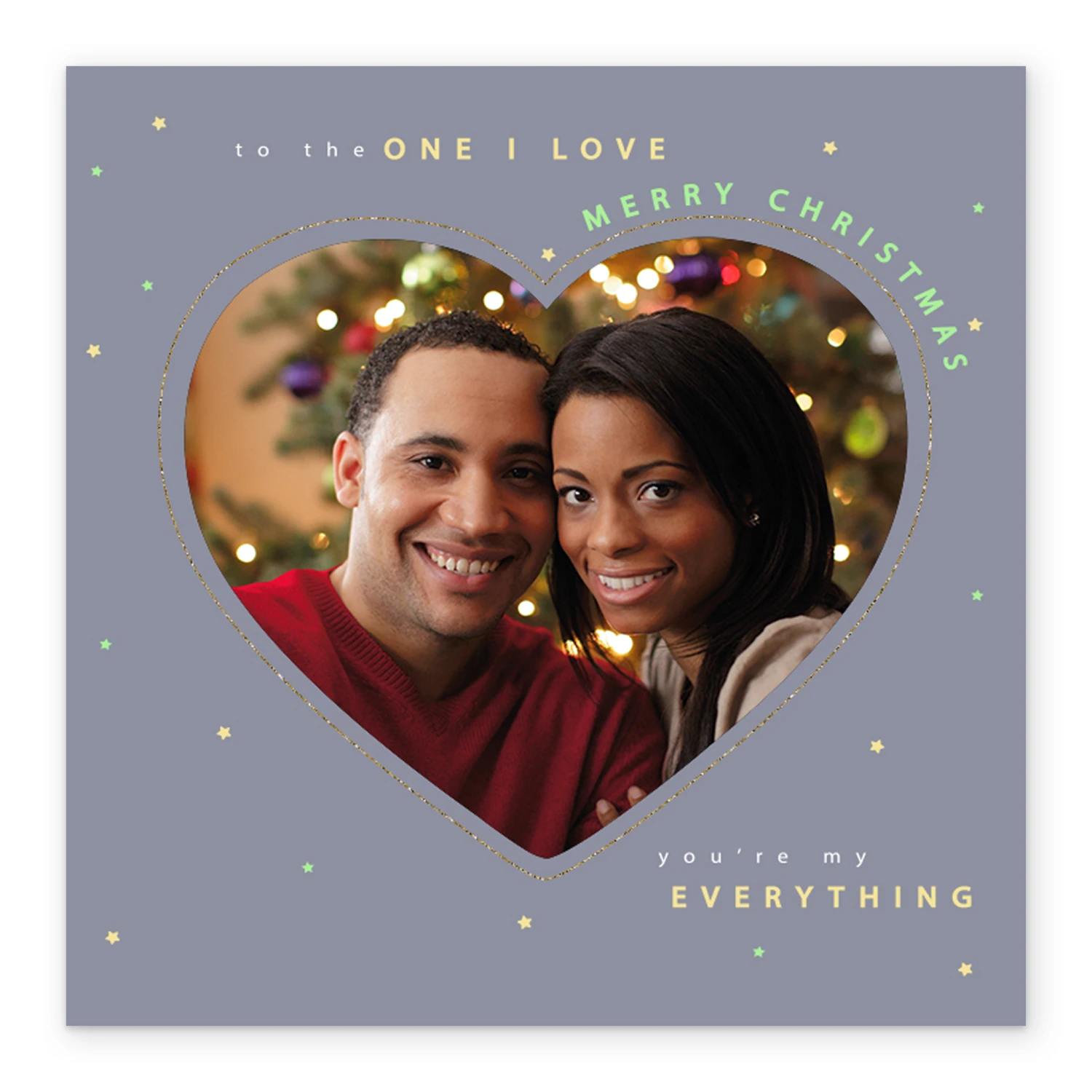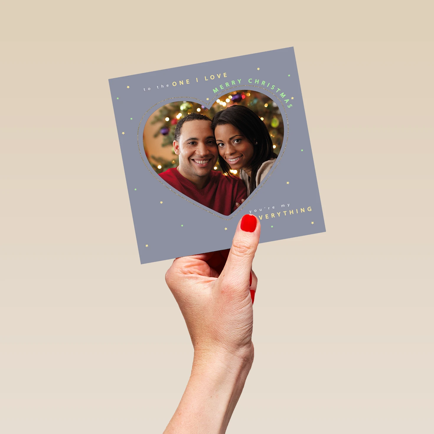 Printed on premium-quality board, this card features a heart-shaped space to upload a photo, and the message ‘to the one I love, Merry Christmas, you’re my everything’.