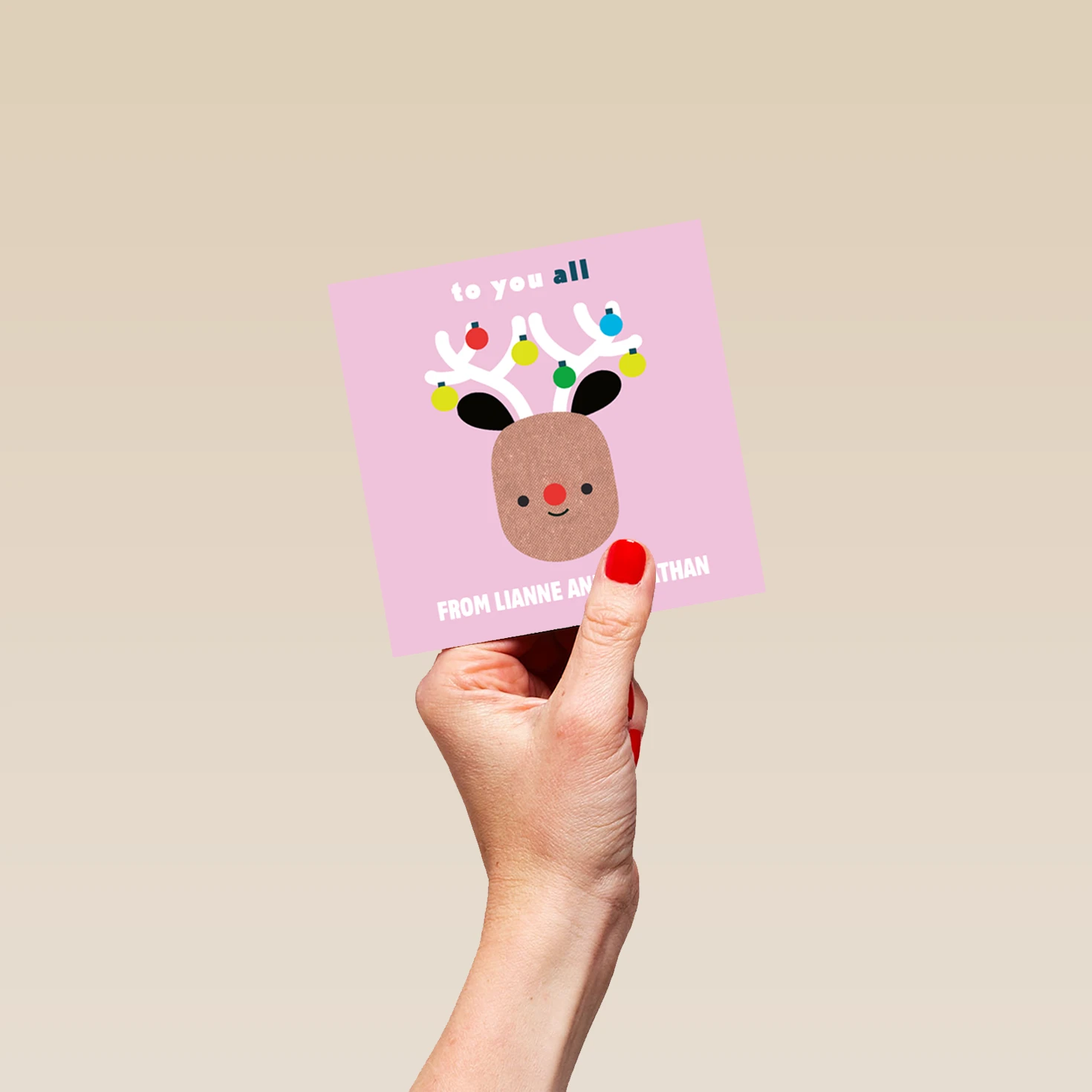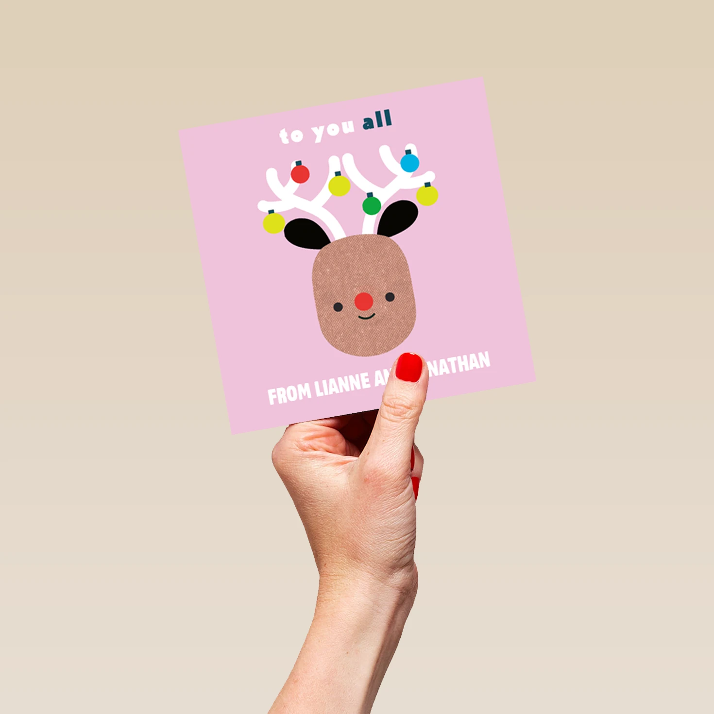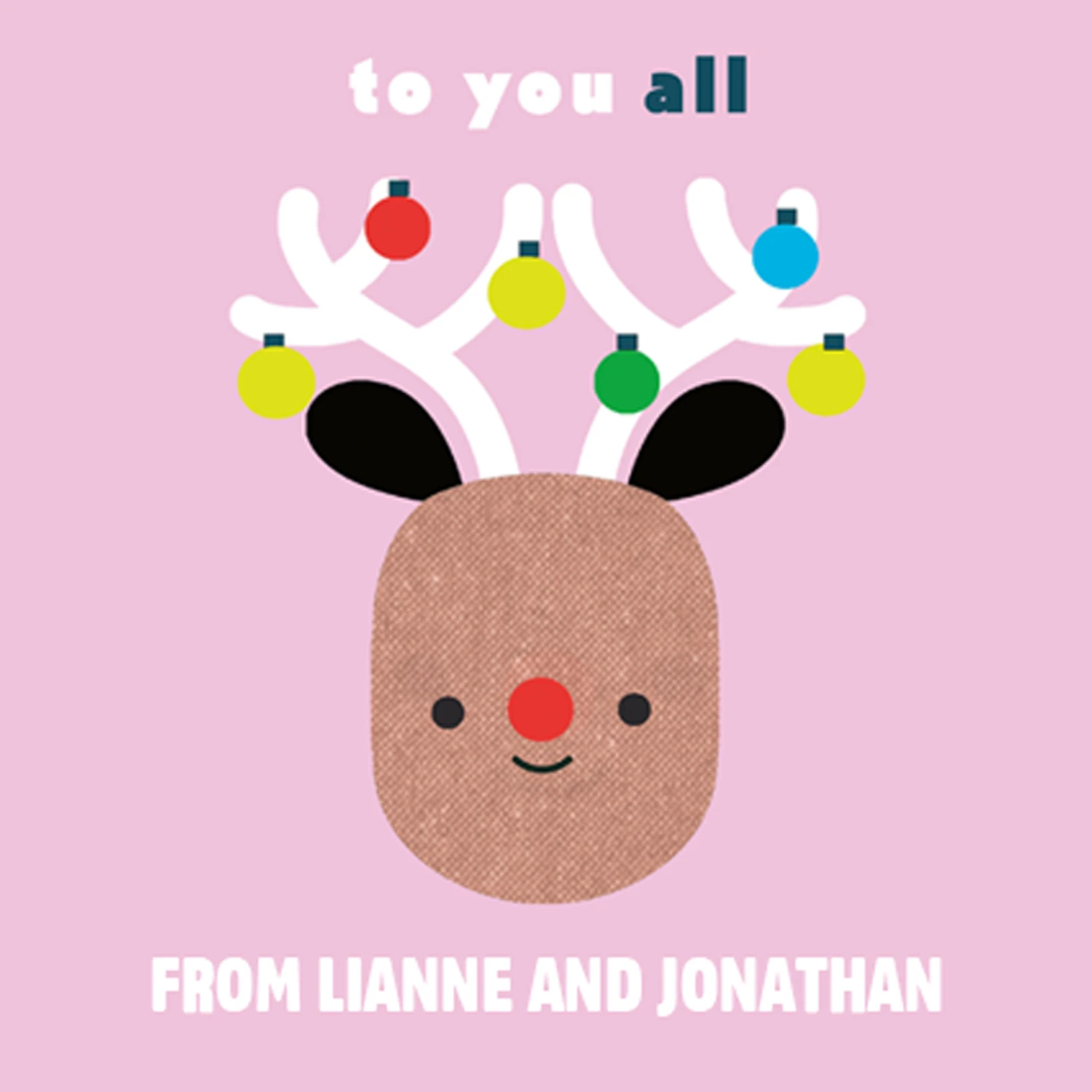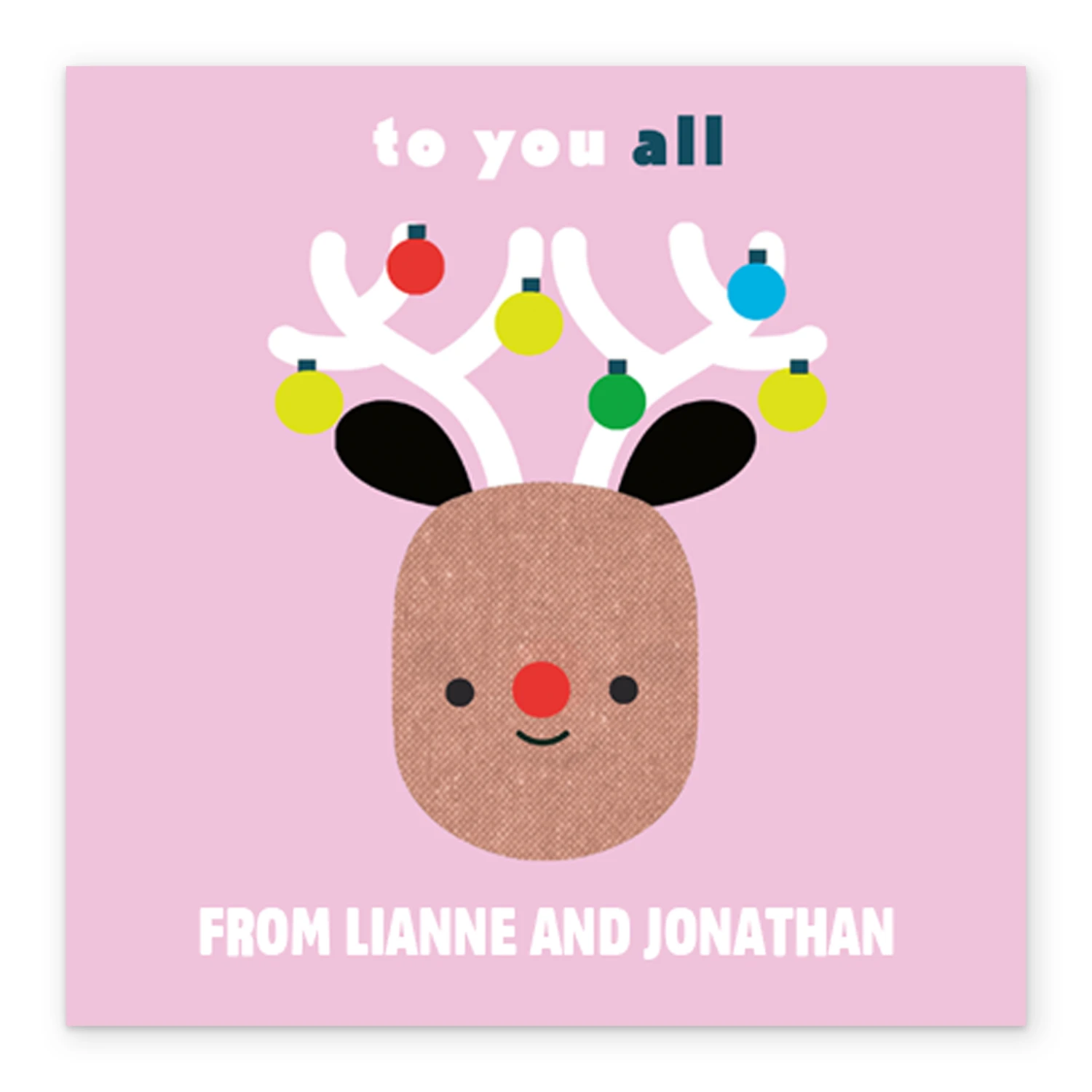Show them you care with a personalised to you all family cute reindeer Christmas card from Hallmark. Our greetings cards are printed on premium quality, FSC®-certified card & delivered nationwide. This card is available as standard 12cm by 12cm and large 15cm by 15cm.