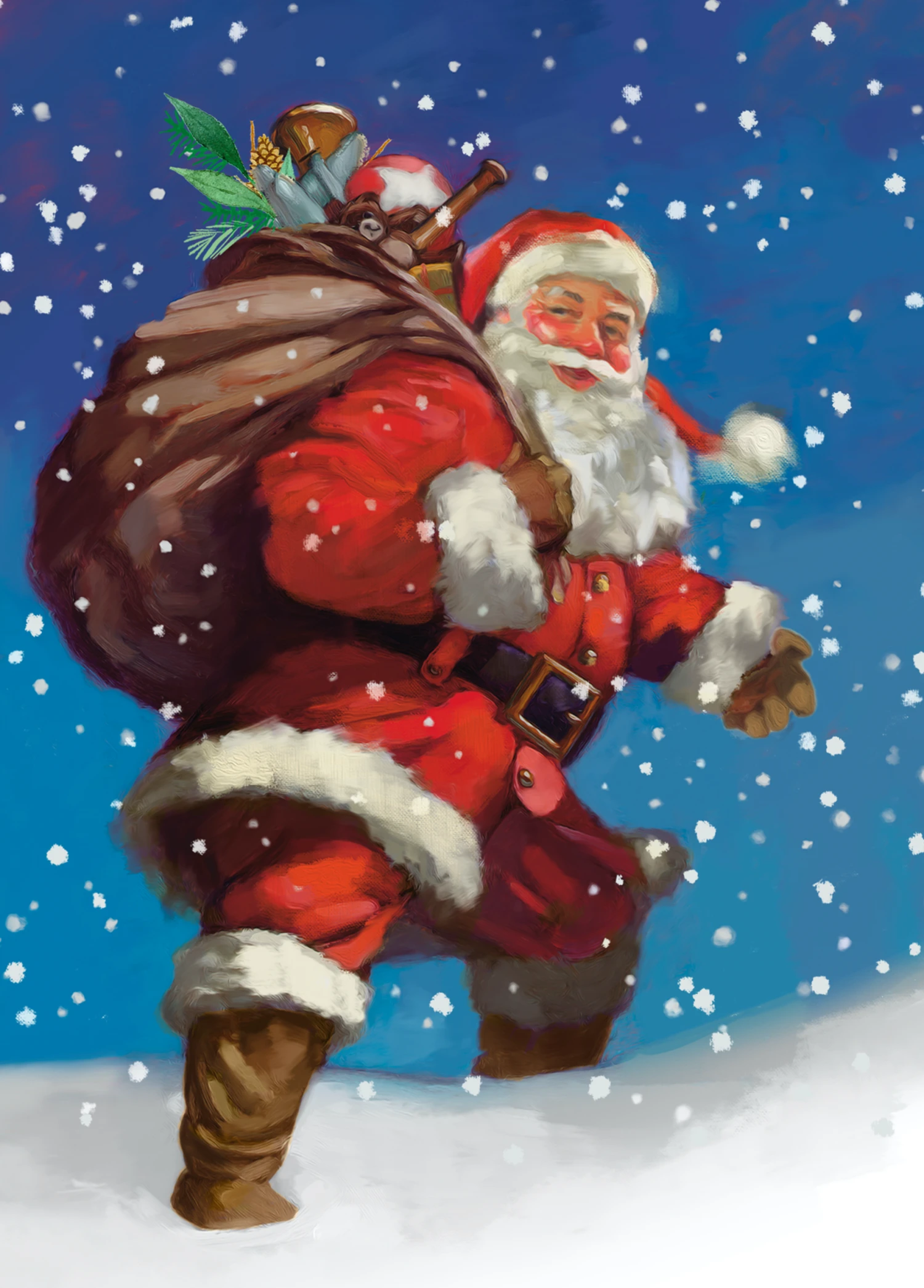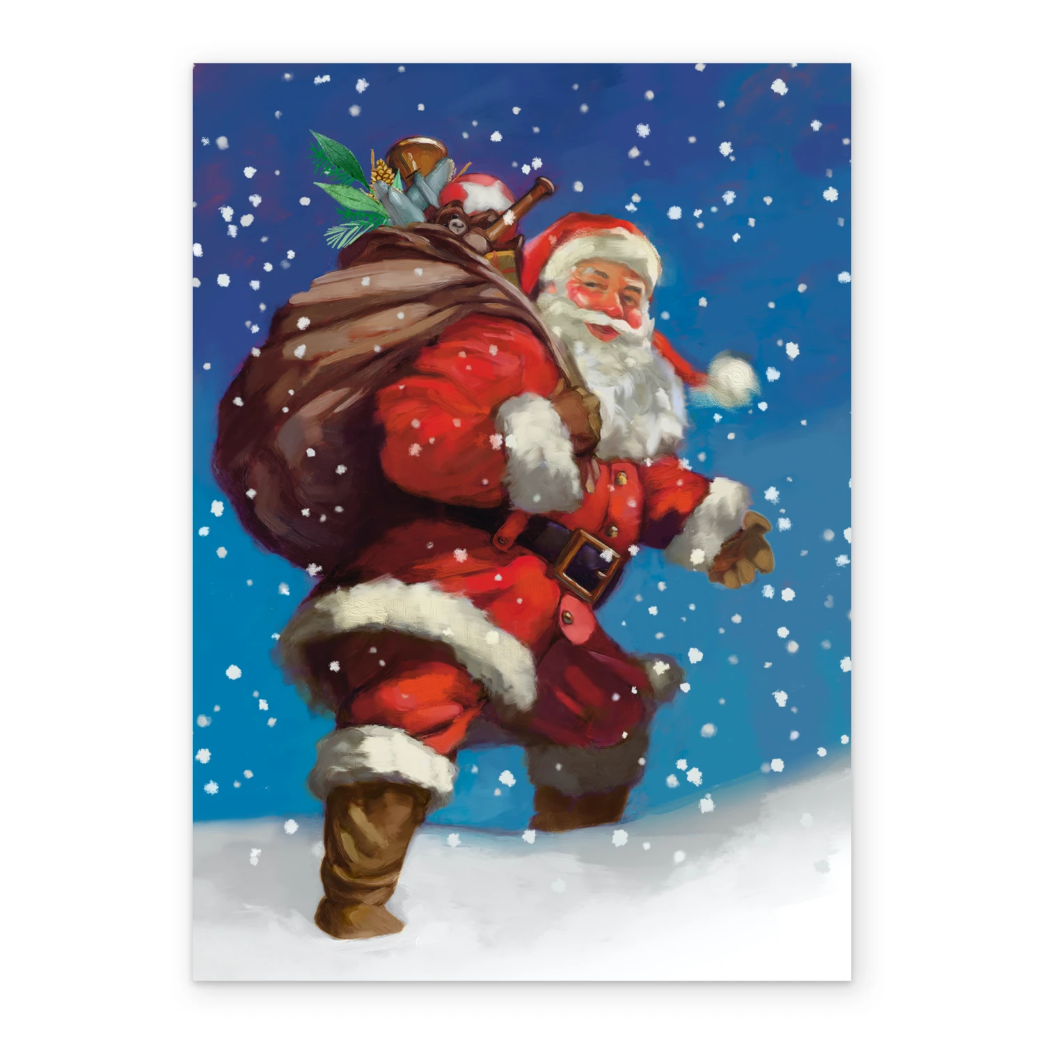 Show them you care with a personalised traditional Christmas vintage Santa in the snow card from Hallmark. Our greetings cards are printed on premium quality, FSC®-certified card & delivered nationwide. This card is available as standard 12cm by 16.7cm and large 15.5cm by 21.6cm.