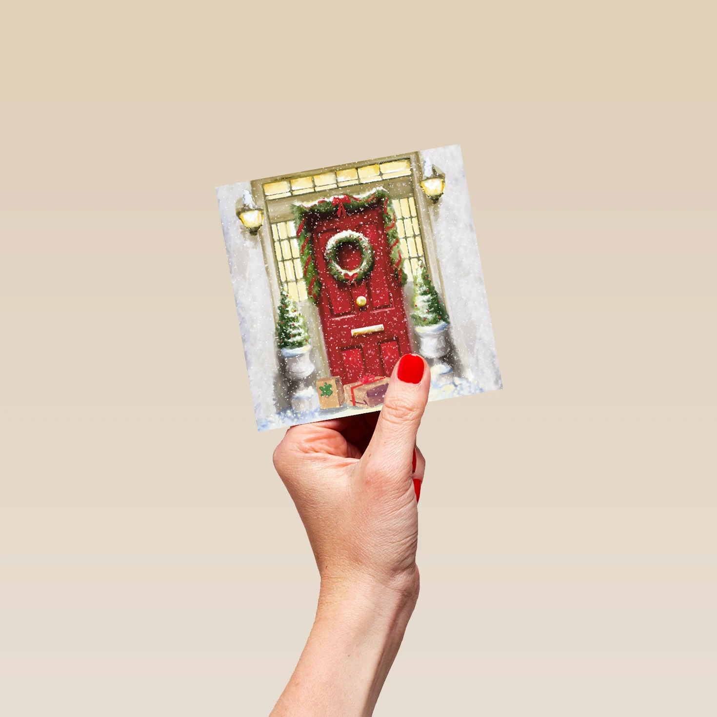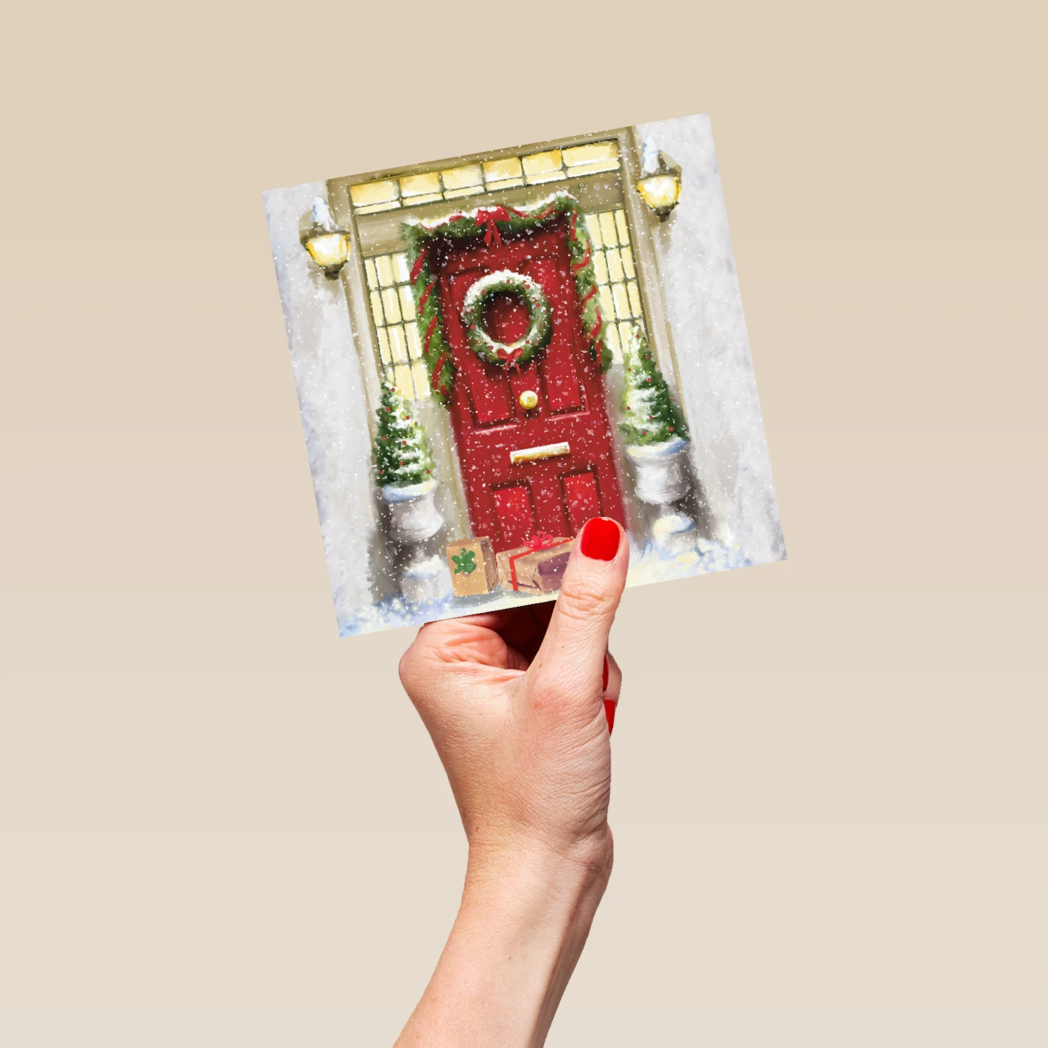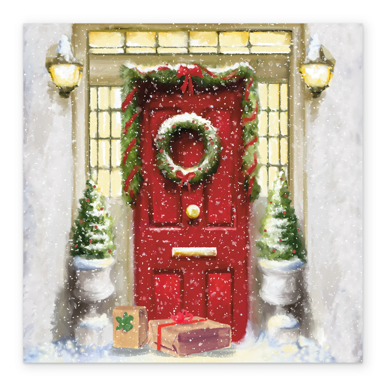 Show them you care with a personalised traditional elegant red door wreath Christmas card from Hallmark. Our greetings cards are printed on premium quality, FSC®-certified card & delivered nationwide. This card is available as standard 12cm by 12cm and large 15cm by 15cm.
