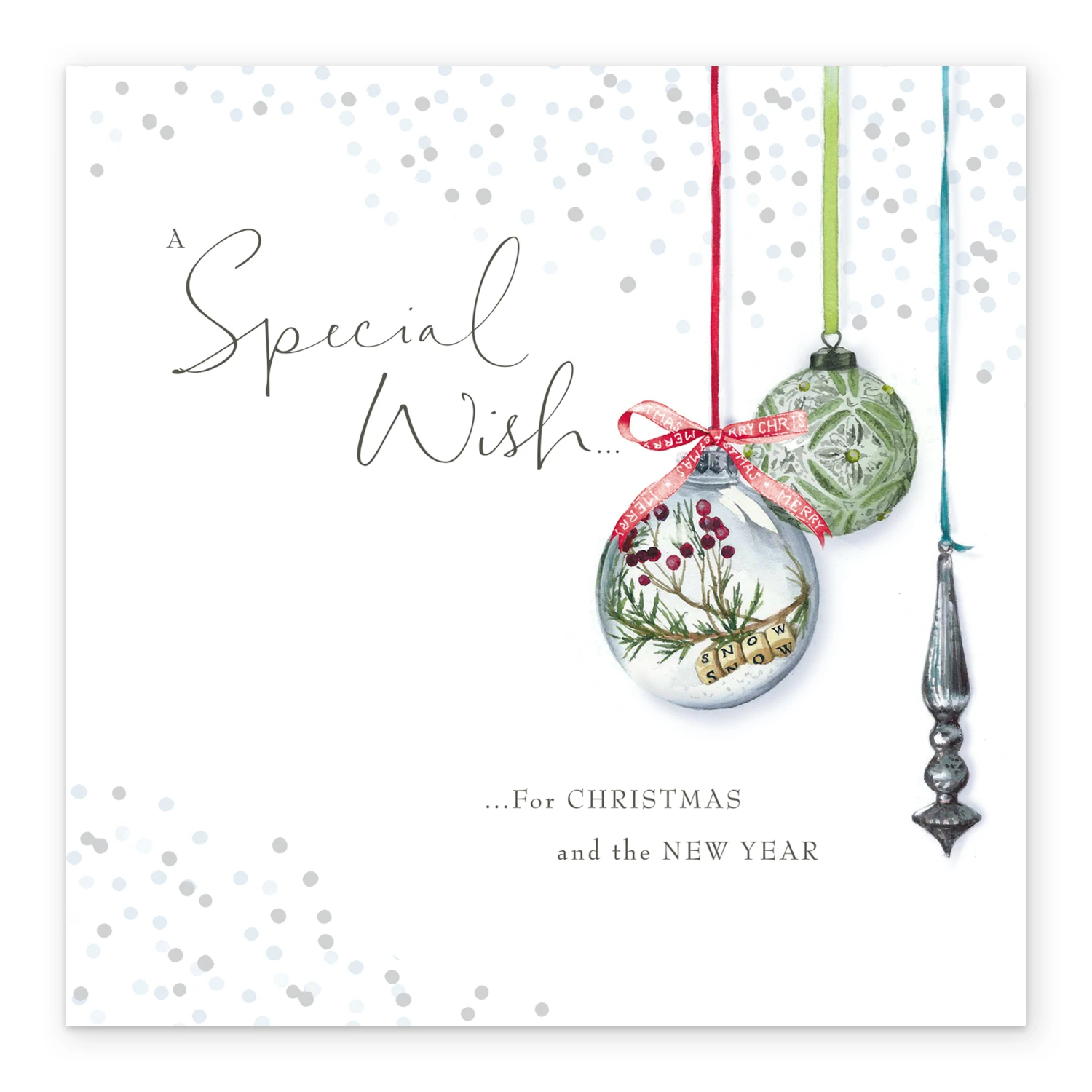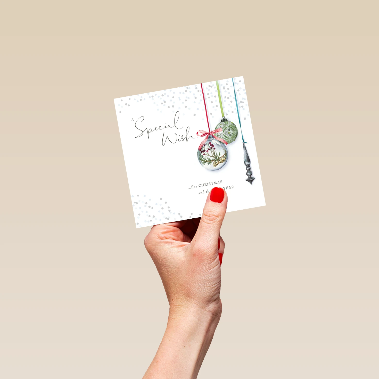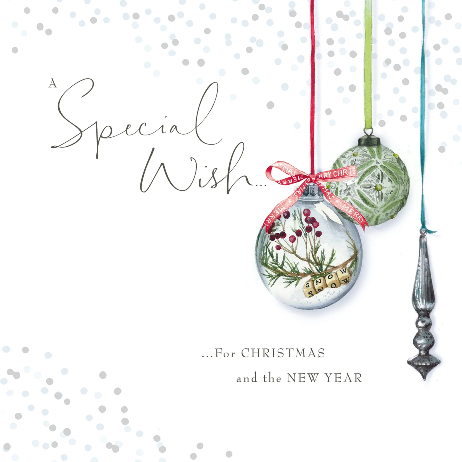 Show them you care with a personalised traditional Lucy Cromwell Christmas baubles card from Hallmark. Our greetings cards are printed on premium quality, FSC®-certified card & delivered nationwide. This card is available as standard 12cm by 12cm and large 15cm by 15cm.