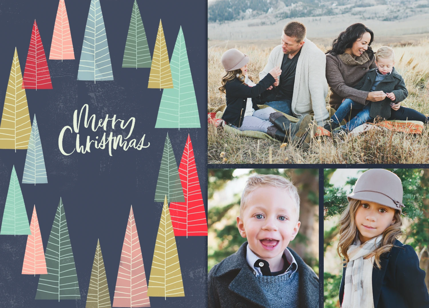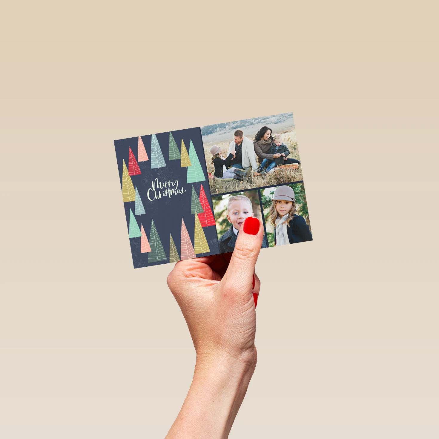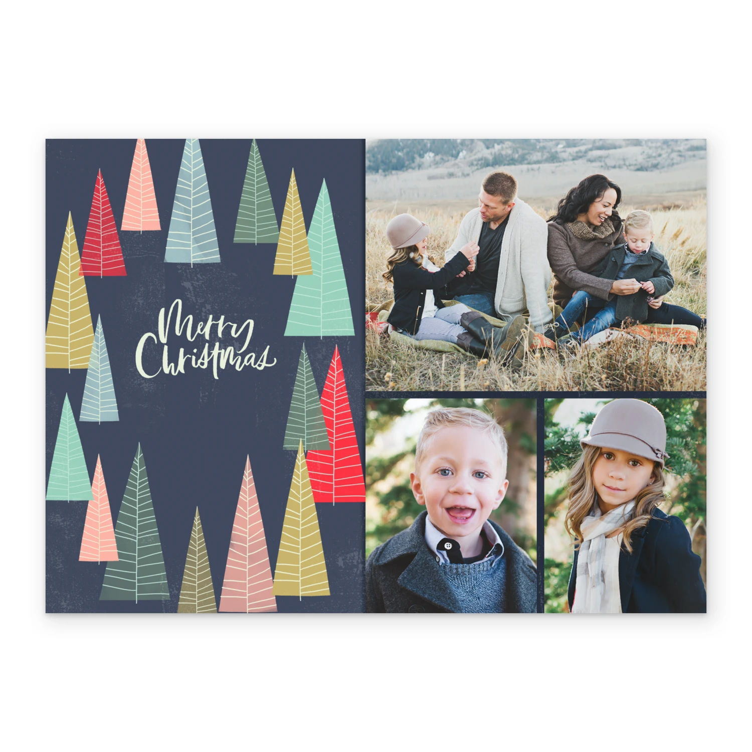Printed on premium-quality board, this card features three individual spaces to upload a photo collage, illustrations of trees and the message ‘Merry Christmas’.