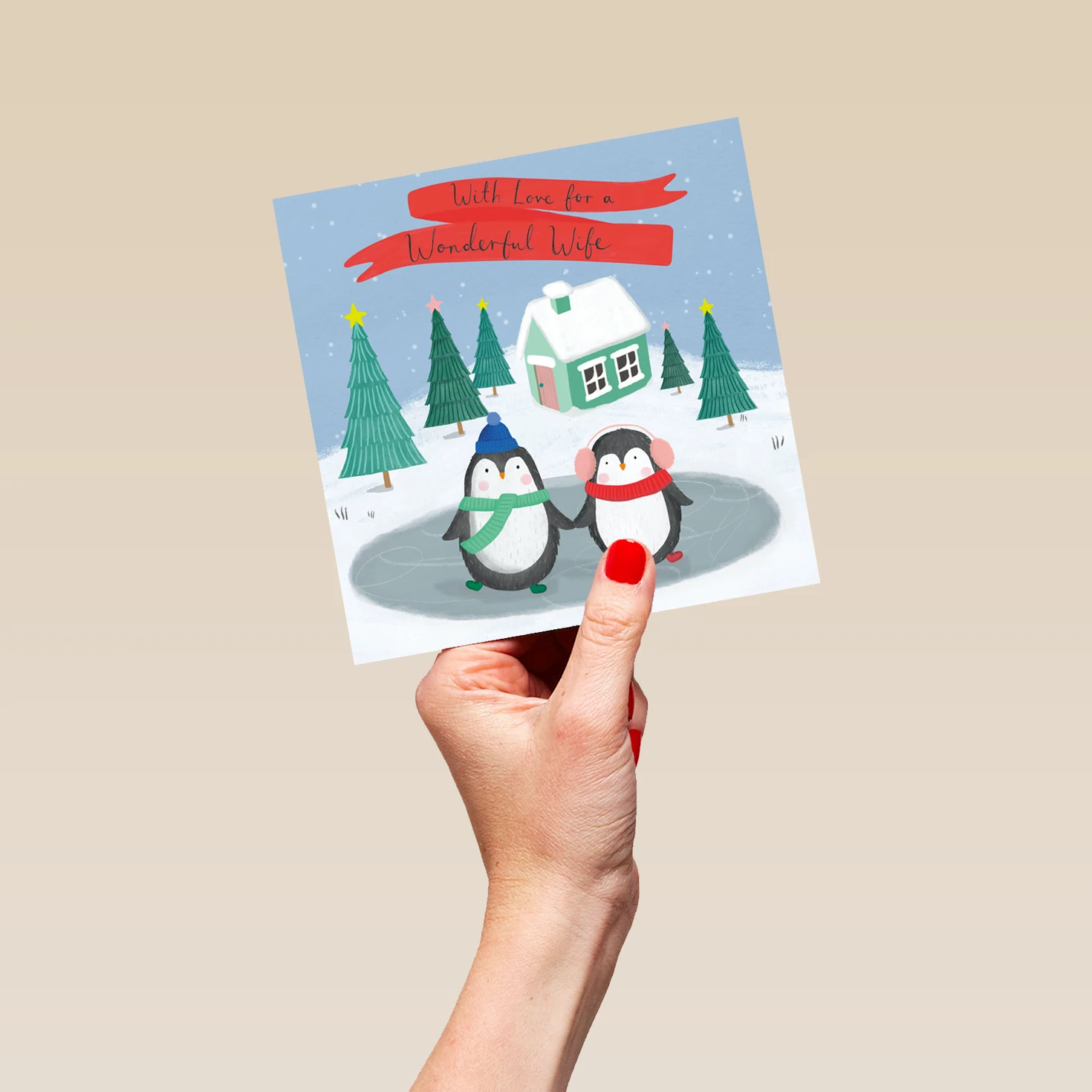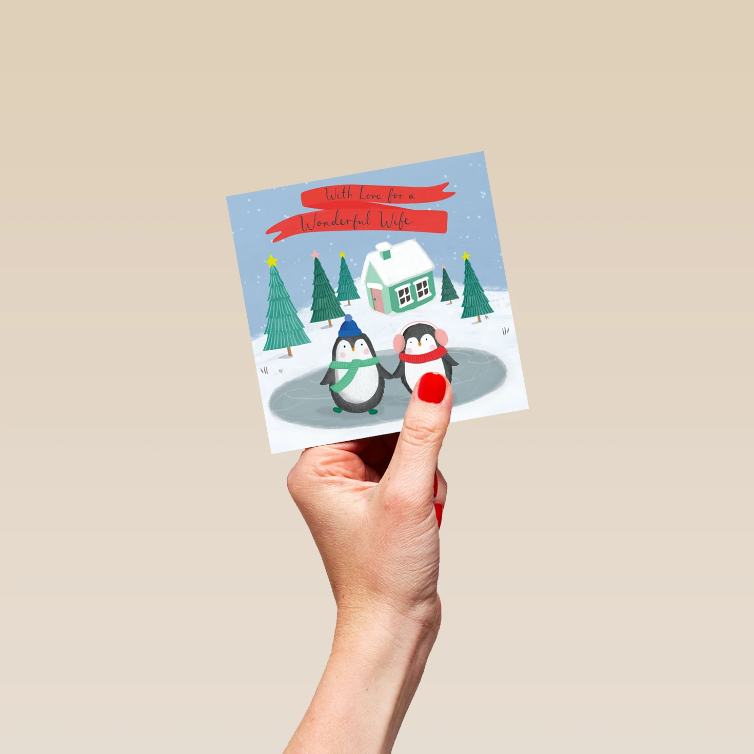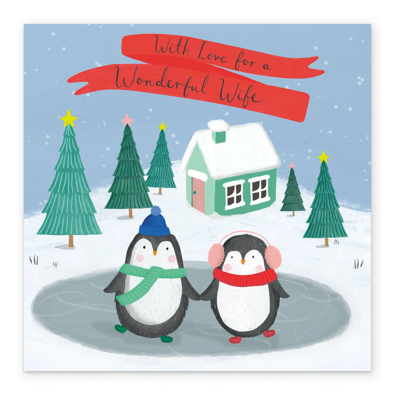Show them you care with a personalised wife cute penguins winter scene Christmas card from Hallmark. Our greetings cards are printed on premium quality, FSC®-certified card & delivered nationwide. This card is available as standard 12cm by 12cm and large 15cm by 15cm.
